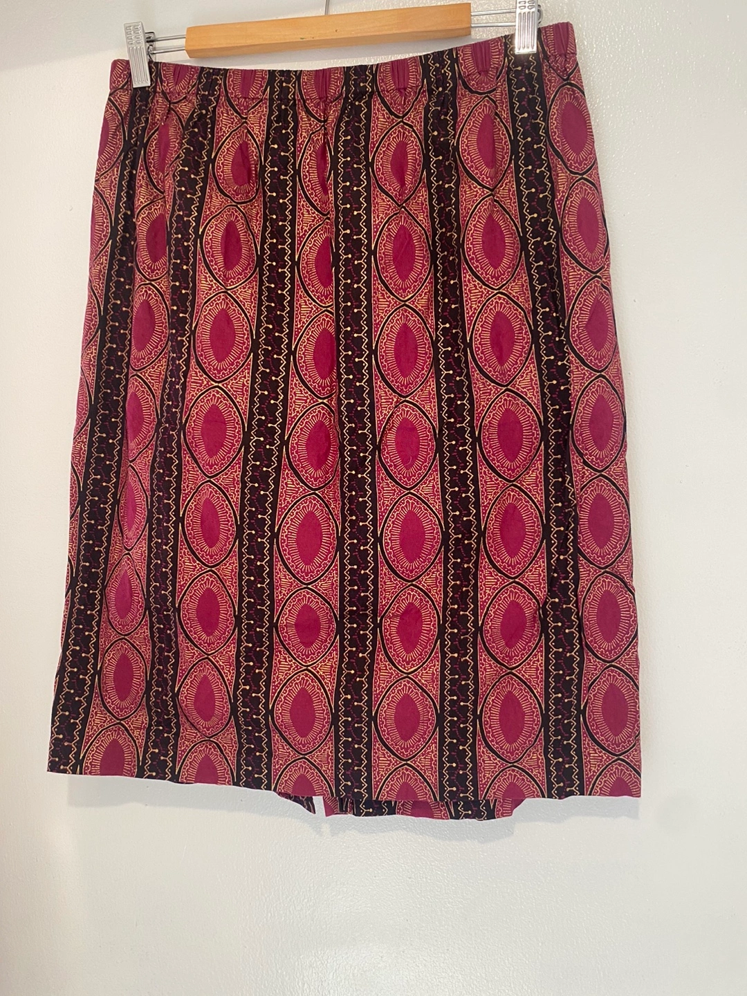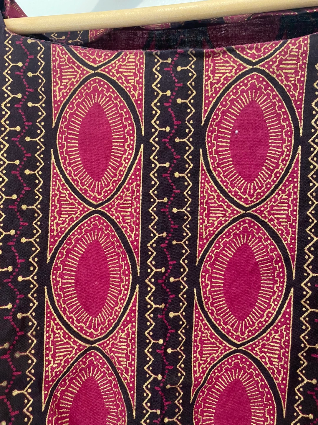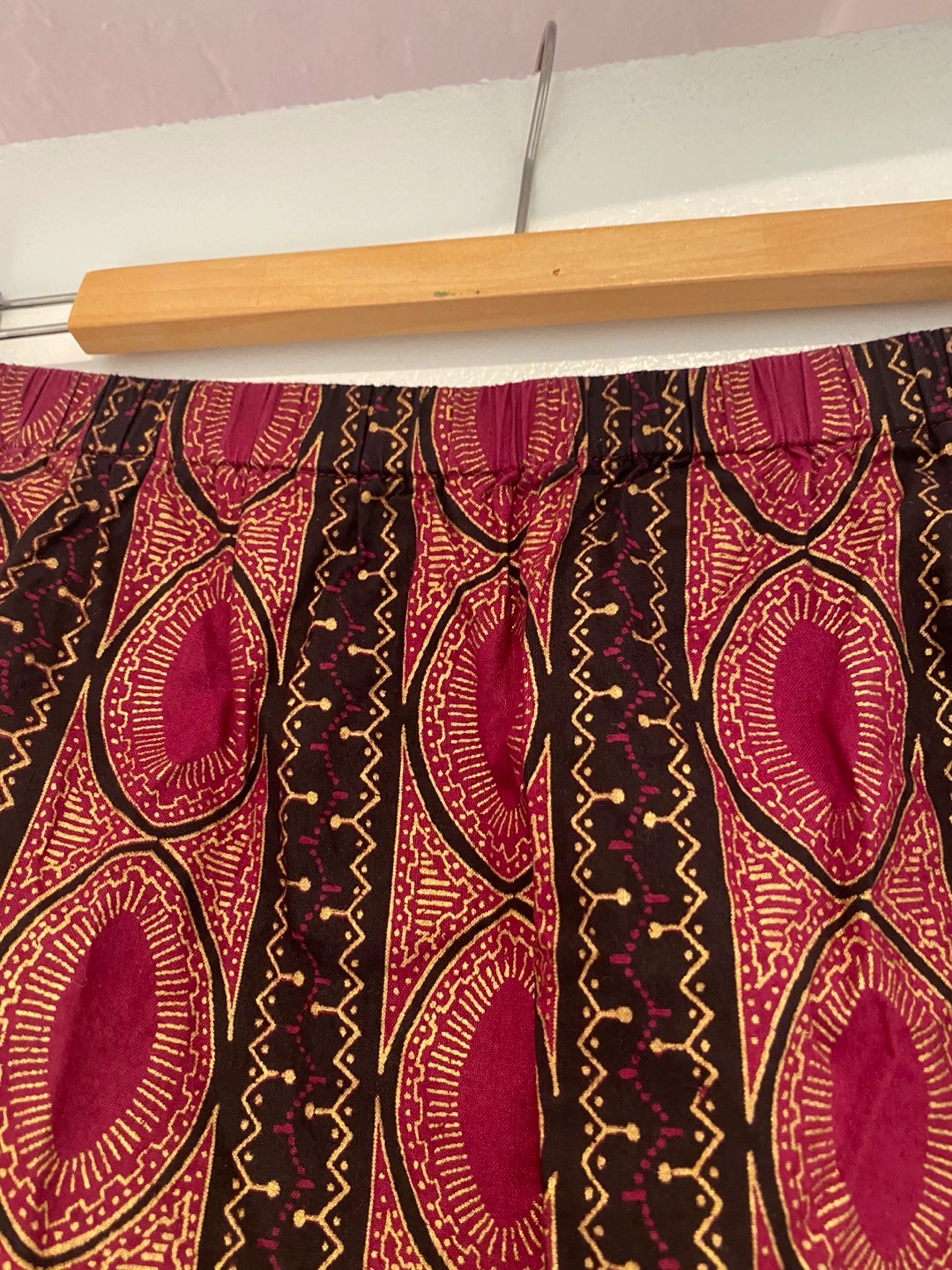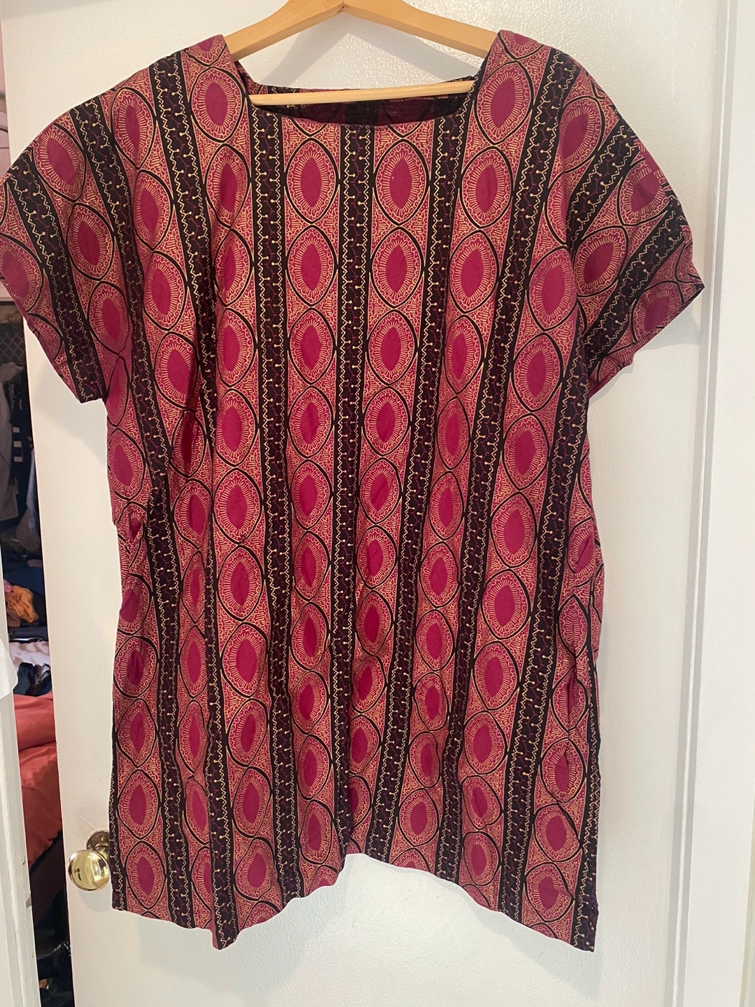 Vintage tunic dress with an elastic waistband, short sleeves, and a geometric pattern. Made of a light, soft fabric.