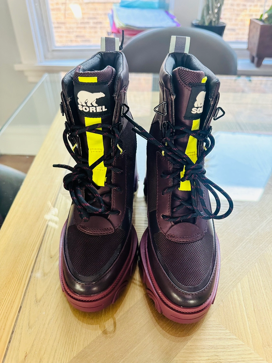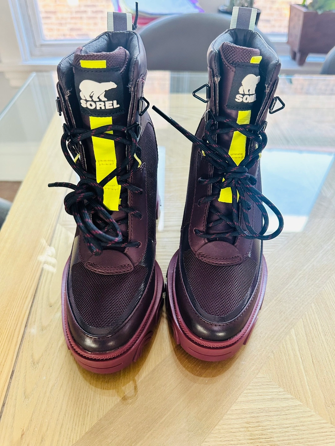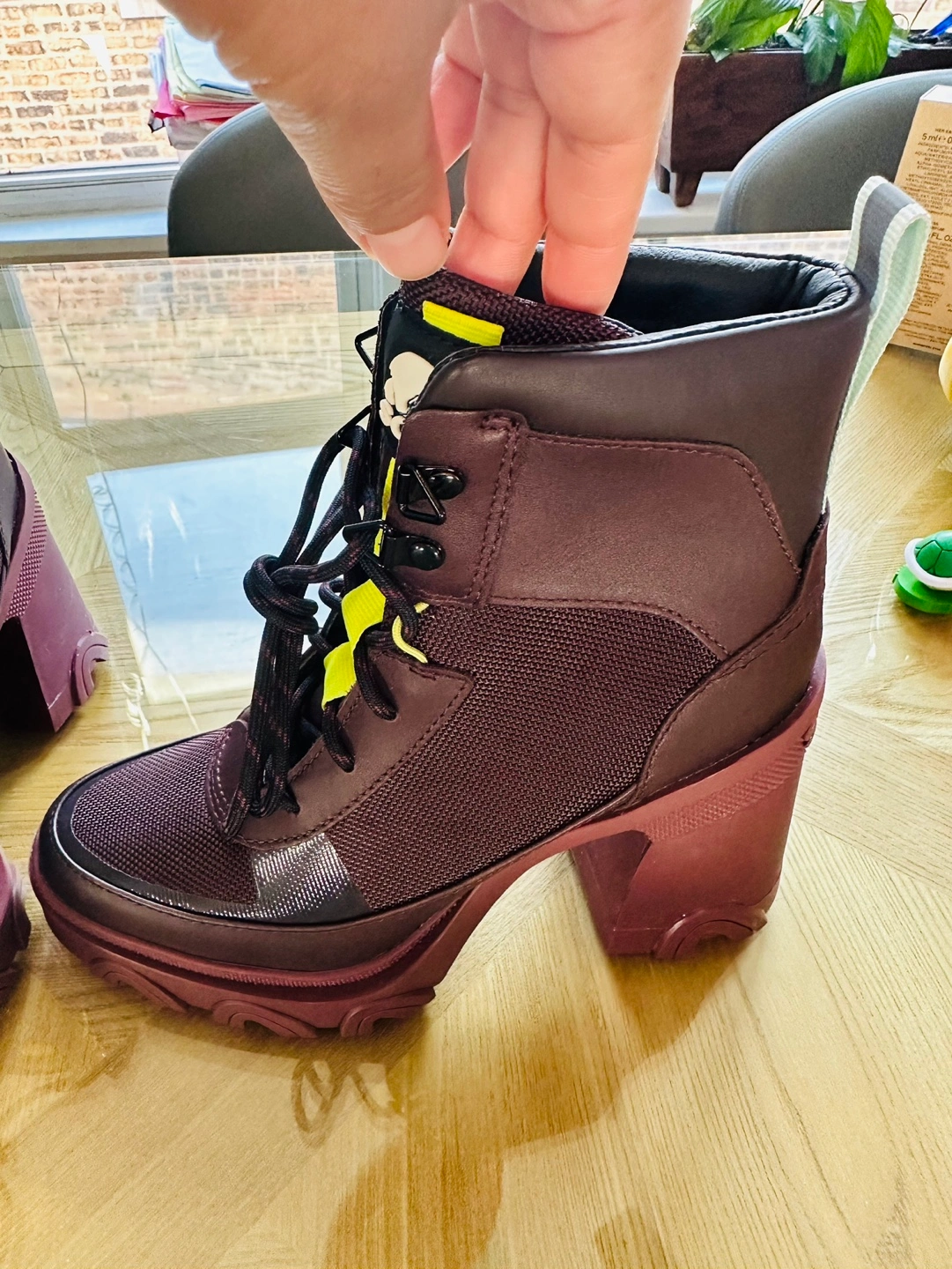 Burgundy lace-up boots with a chunky heel.
