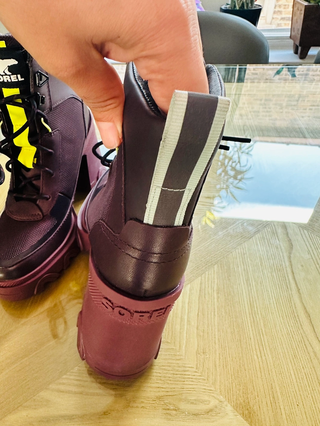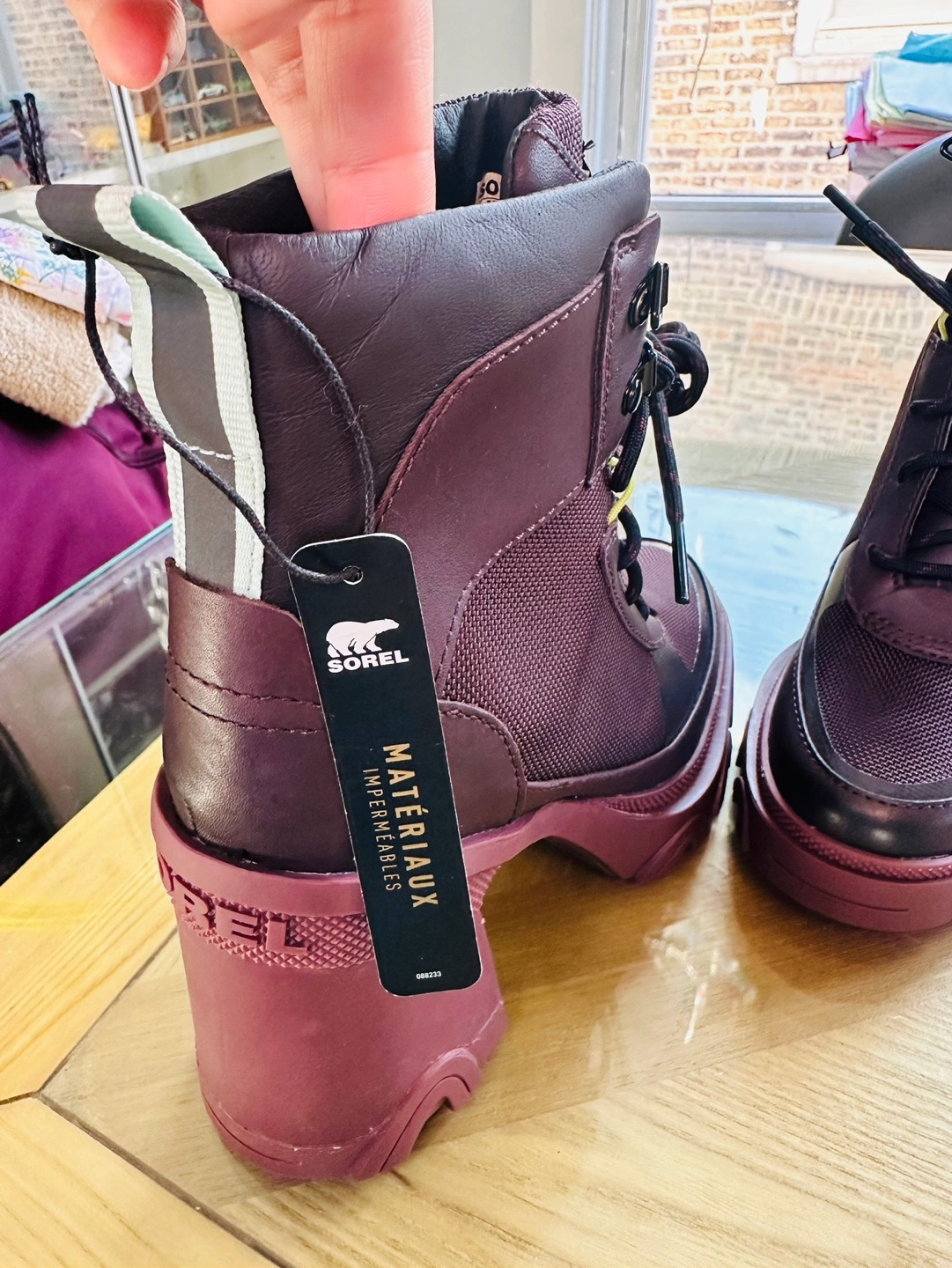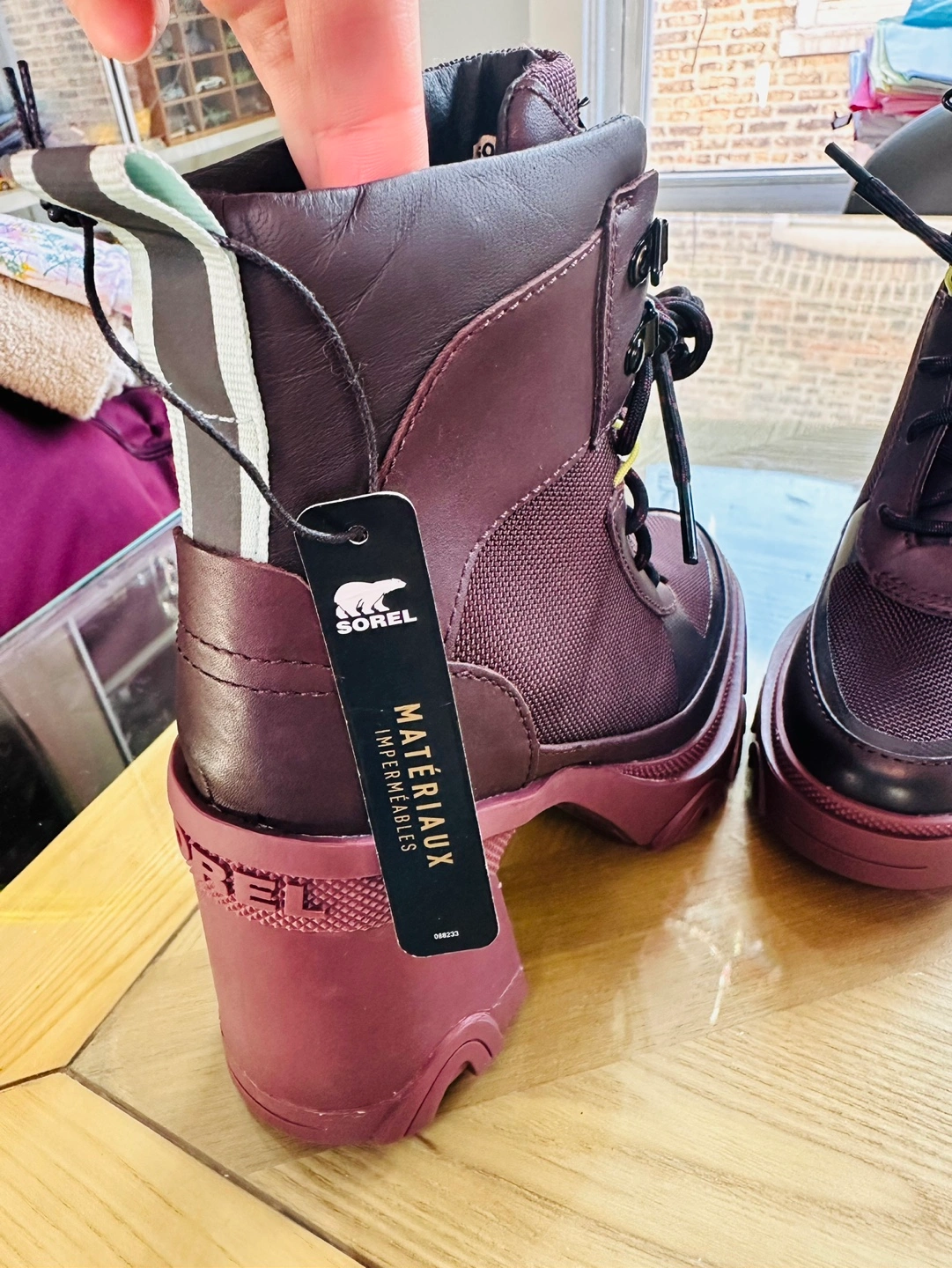Burgundy lace-up boots with a chunky heel.