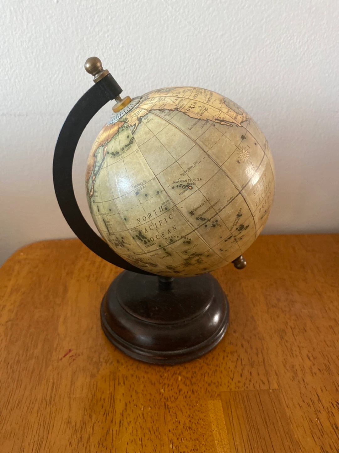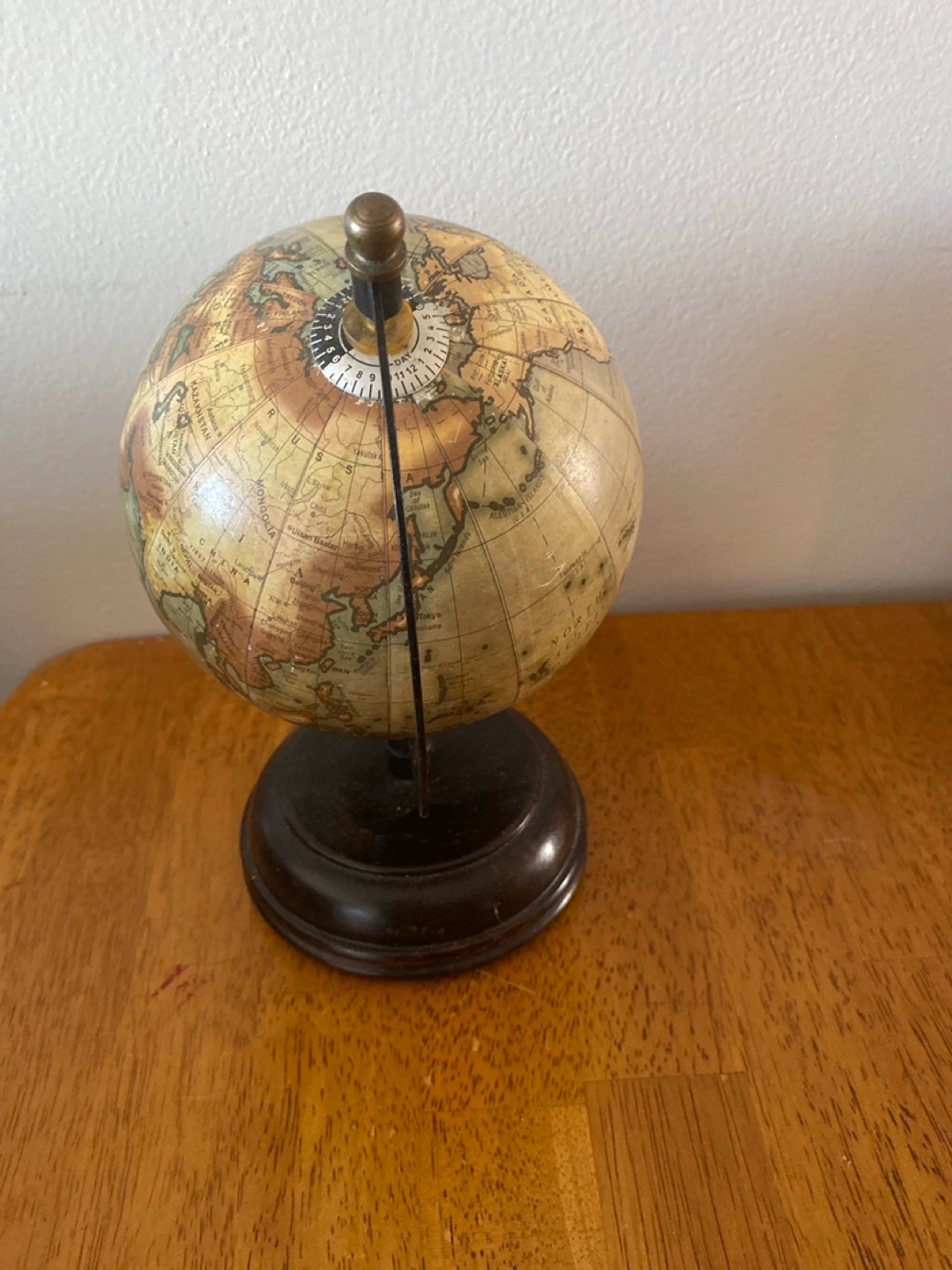 Small desk globe with a wooden base and metal meridian. Antique style globe with a yellowed paper surface.