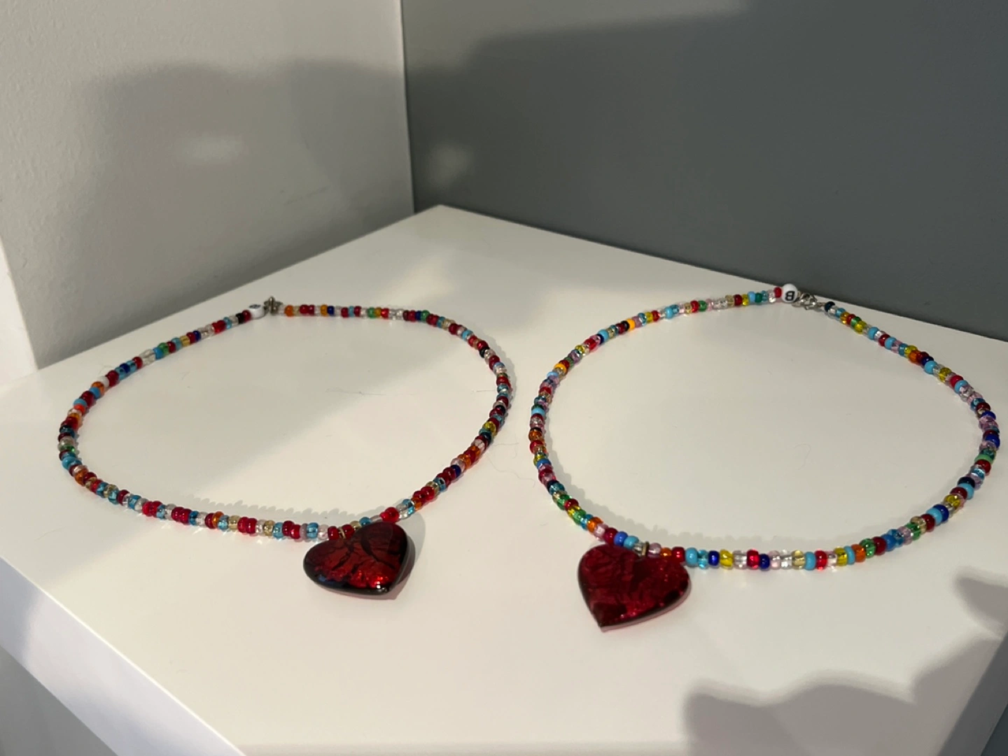 2 Multicoloured Bead Necklaces with Red Heart Charm