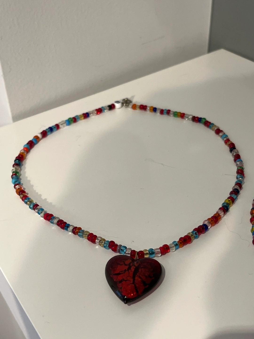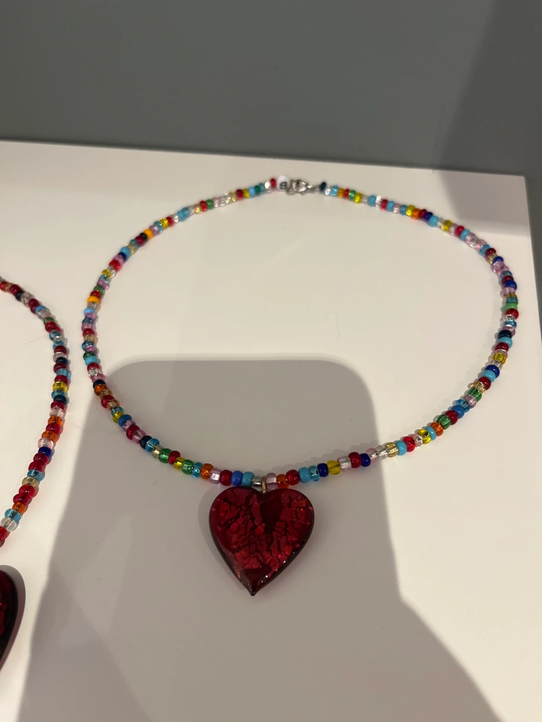 Multicoloured beaded necklaces with red heart charm. The necklace is made of small, colourful glass beads. The heart charm is made of glass and has a red, crackled finish.