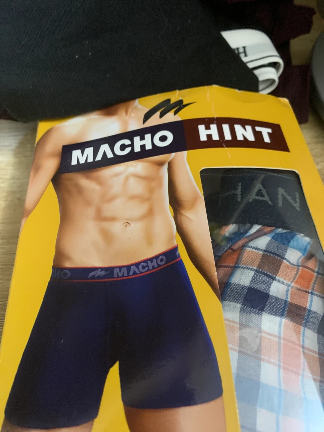MACHO HINT boxer briefs. Includes one pair of navy blue boxer briefs and one pair of plaid boxer briefs. Soft elastic waistband.There 5 new underwear