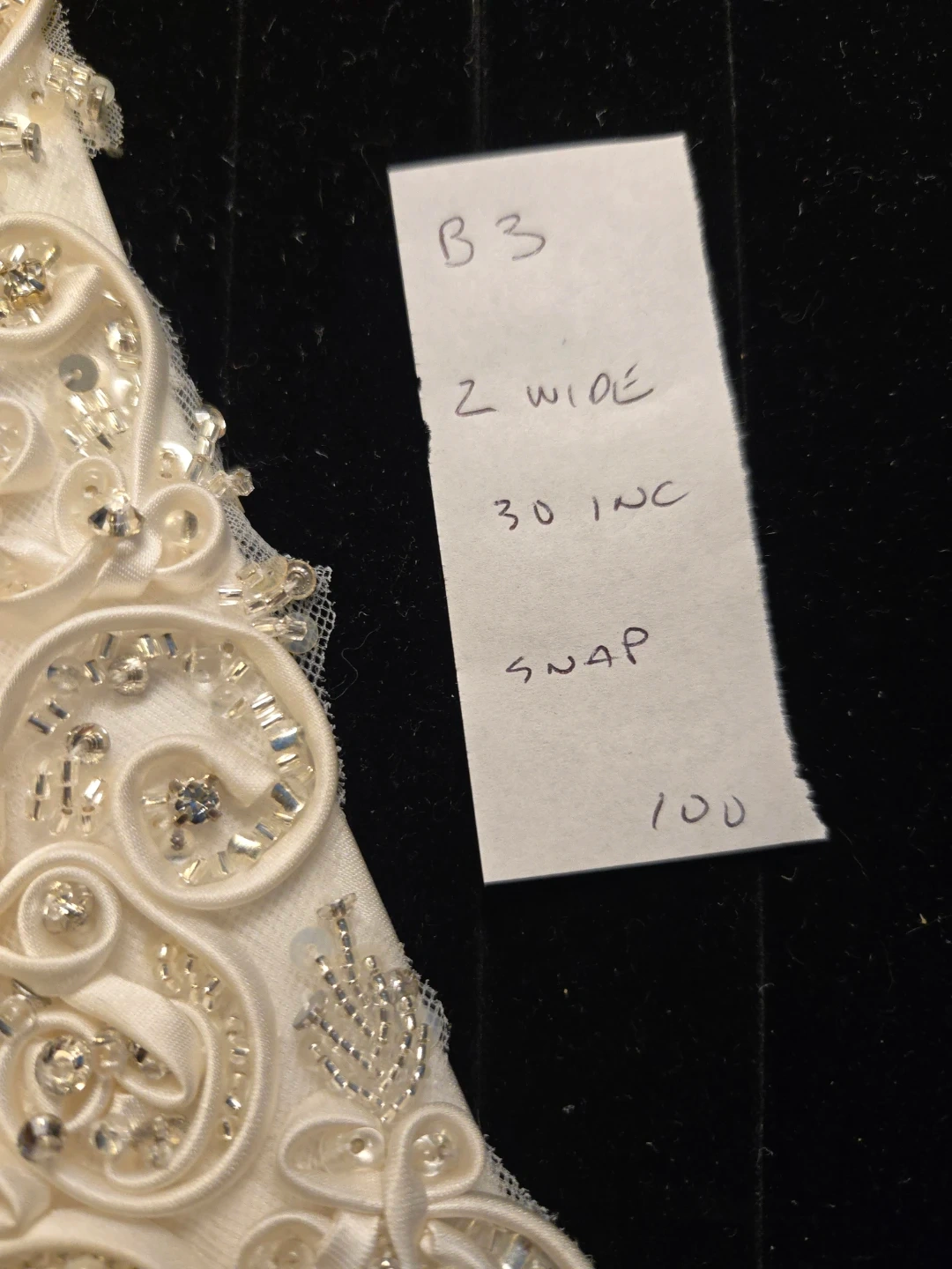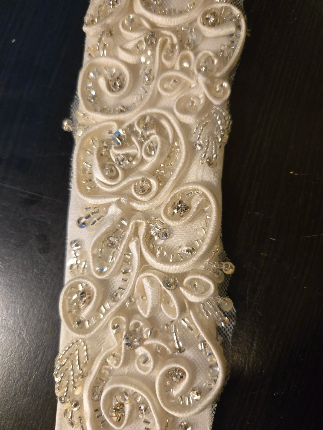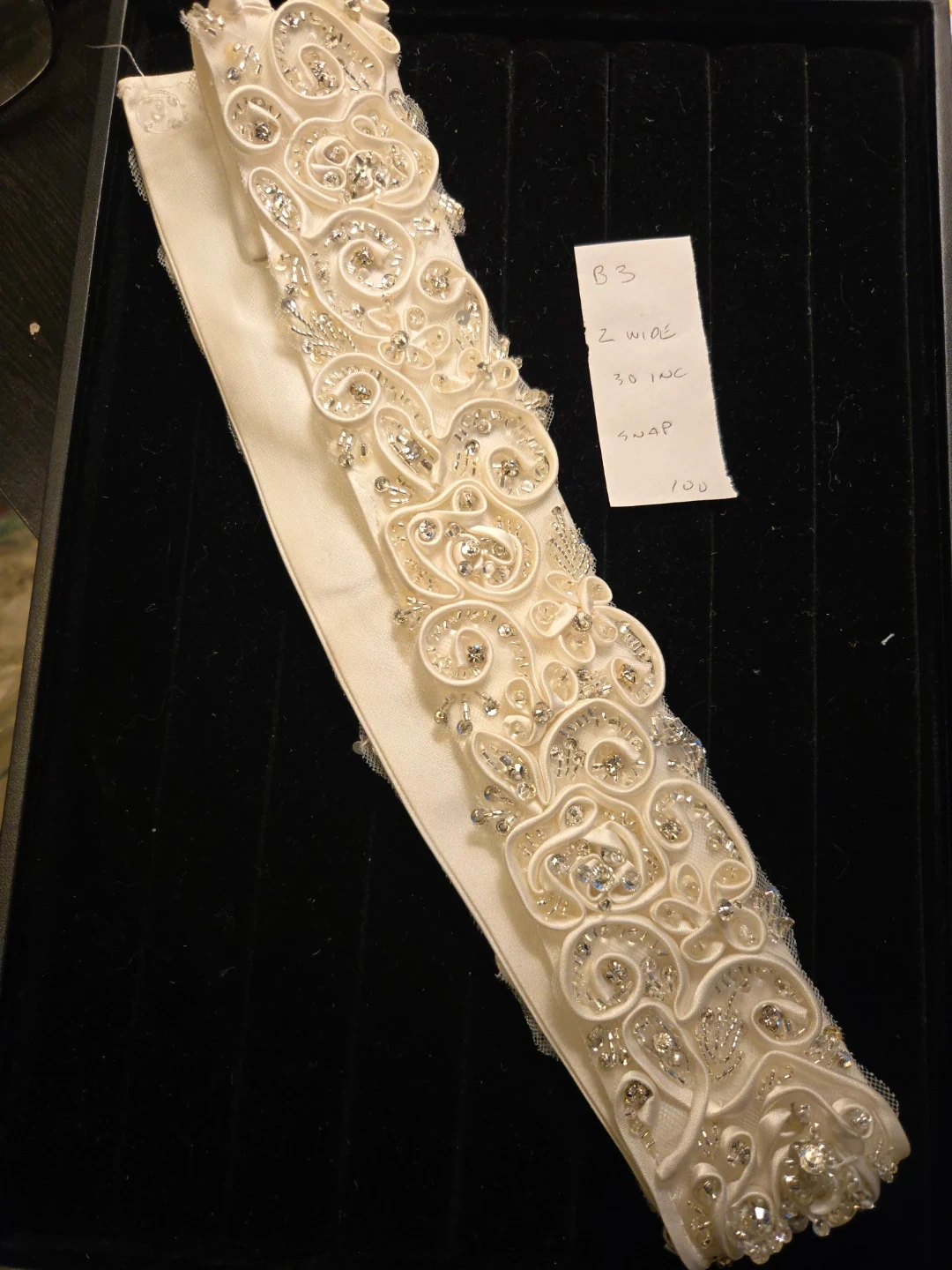 This bridal sash features intricate beading and embroidery on a satin base. It's 2 inches wide and 30 inches long. The embellishments include sparkling rhinestones and pearls.
