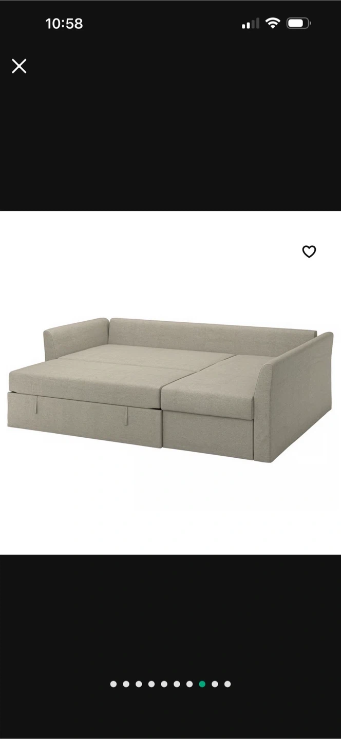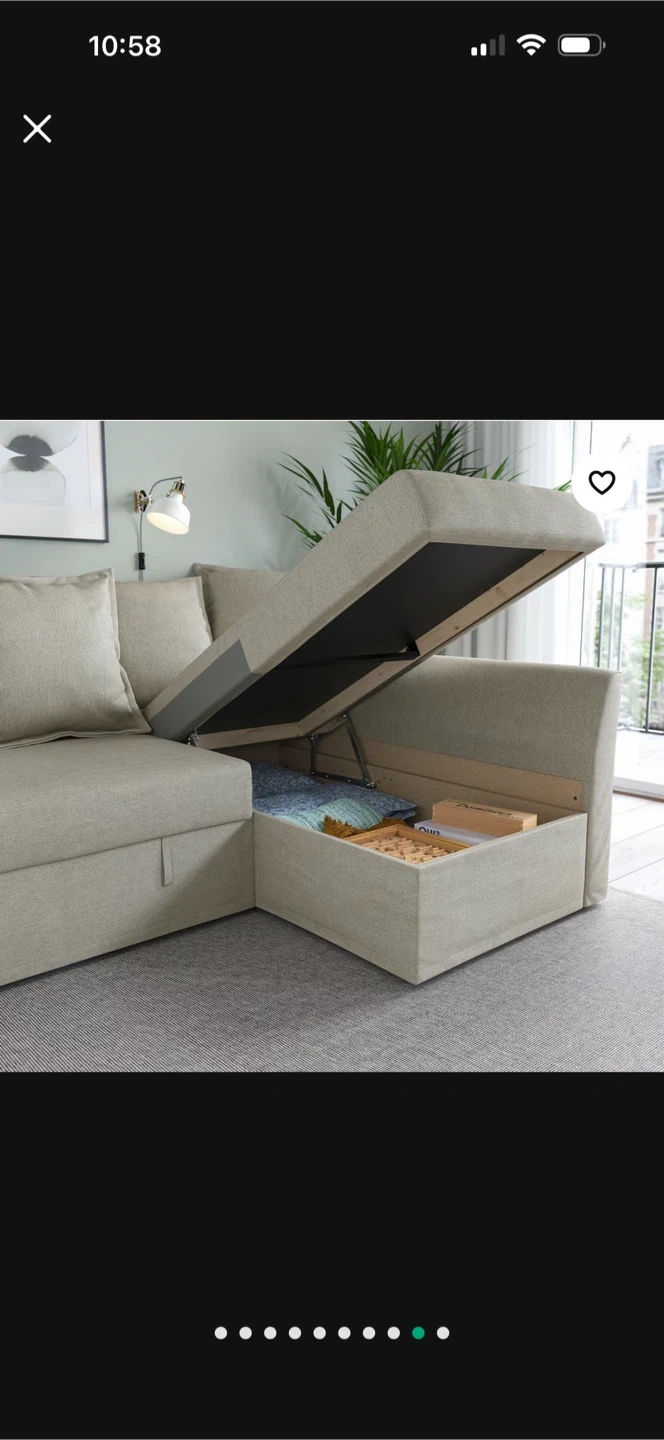 This sectional sofa is upholstered in a light beige fabric. It features built-in storage and easily converts into a pull-out bed. Dimensions are 230 cm (90 1/2") wide and 96 cm (37 3/4") high. The pull-out bed measures 204 cm (80 3/4").