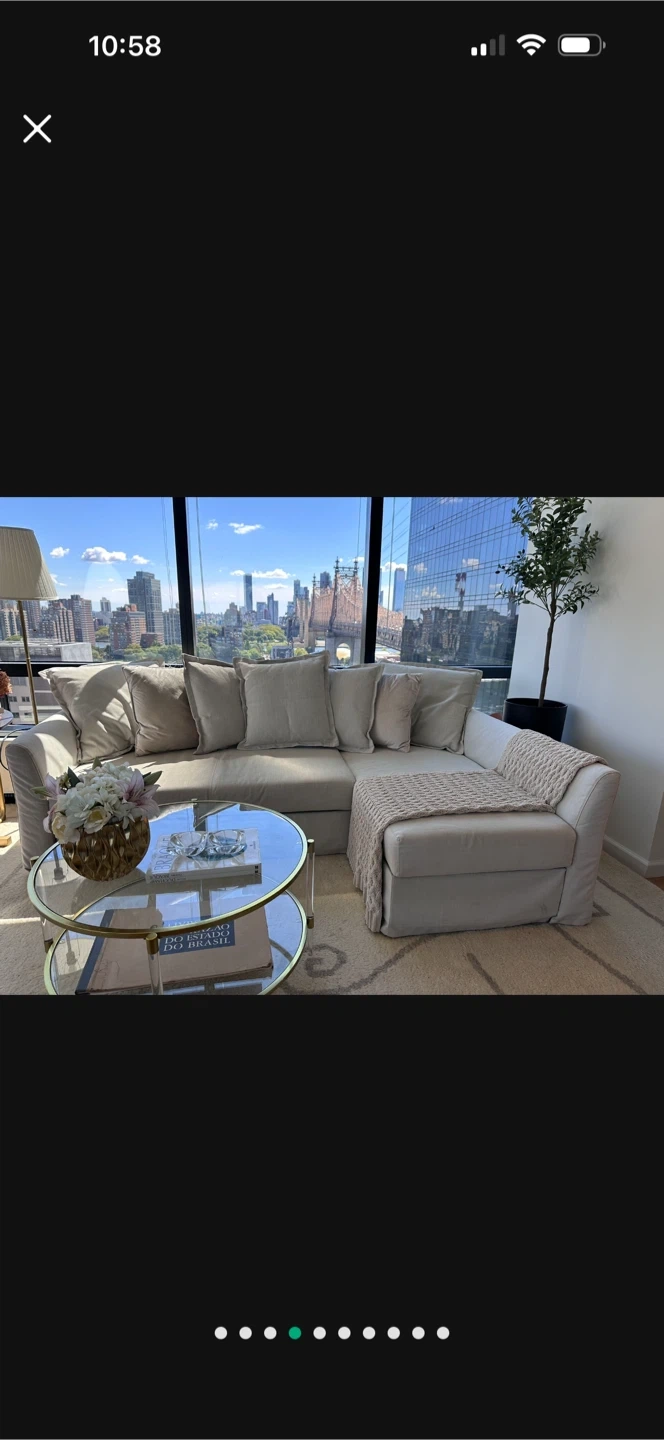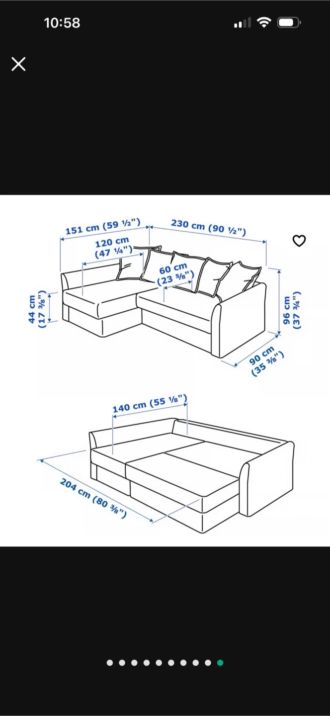 This sectional sofa is upholstered in a light beige fabric. It features built-in storage and easily converts into a pull-out bed. Dimensions are 230 cm (90 1/2") wide and 96 cm (37 3/4") high. The pull-out bed measures 204 cm (80 3/4").