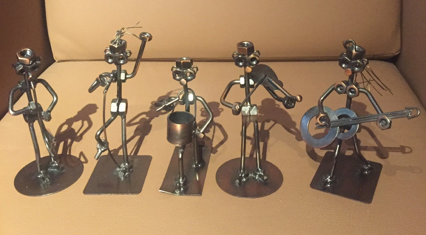 Five metal figurines of musicians. Each musician is made from nuts and bolts, and each plays a different instrument. Great for a music lover or to add some character to your home decor.