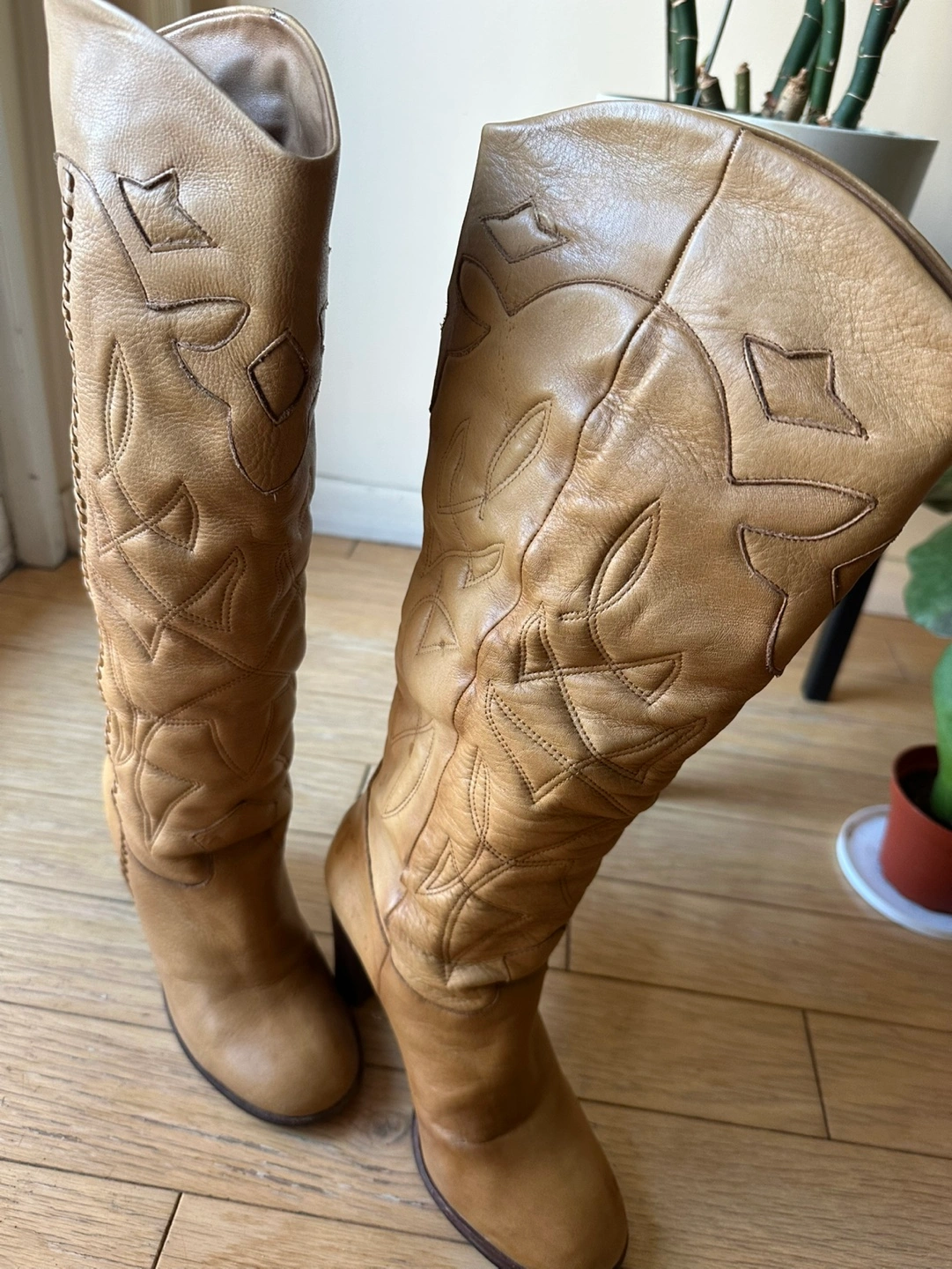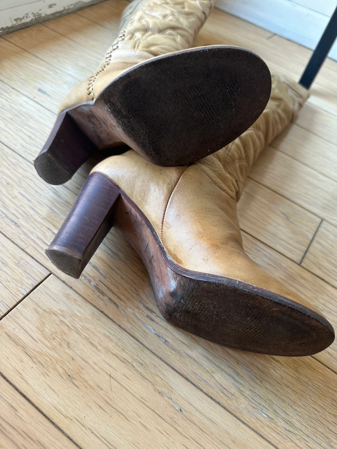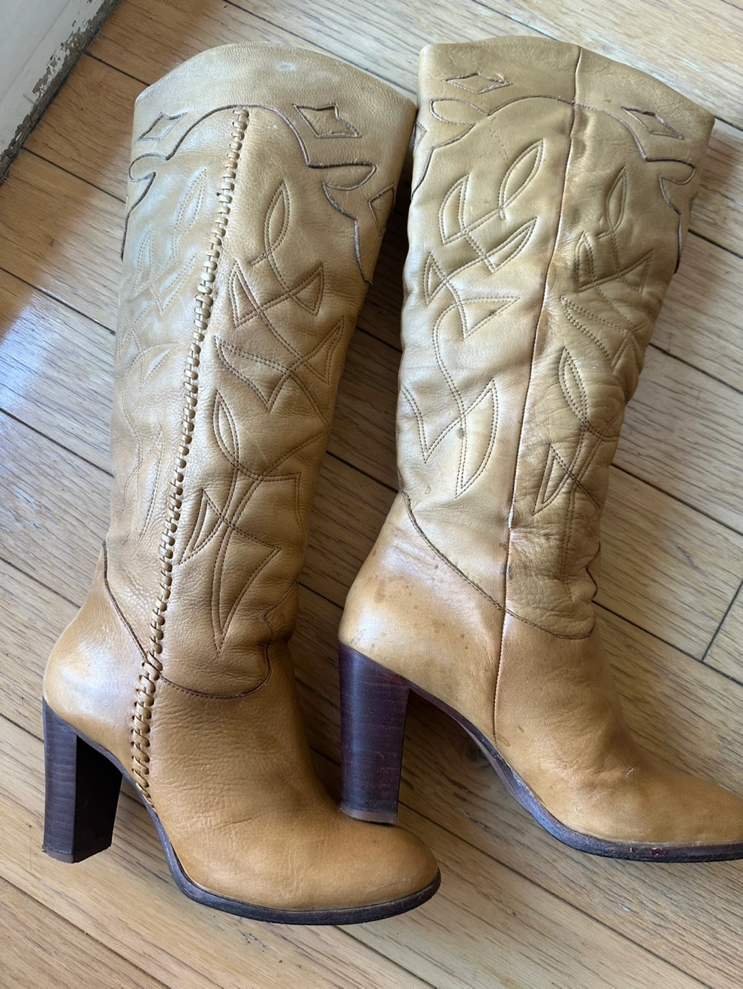 23Tan leather knee-high boots with a block heel and intricate stitching. Made in Brazil.