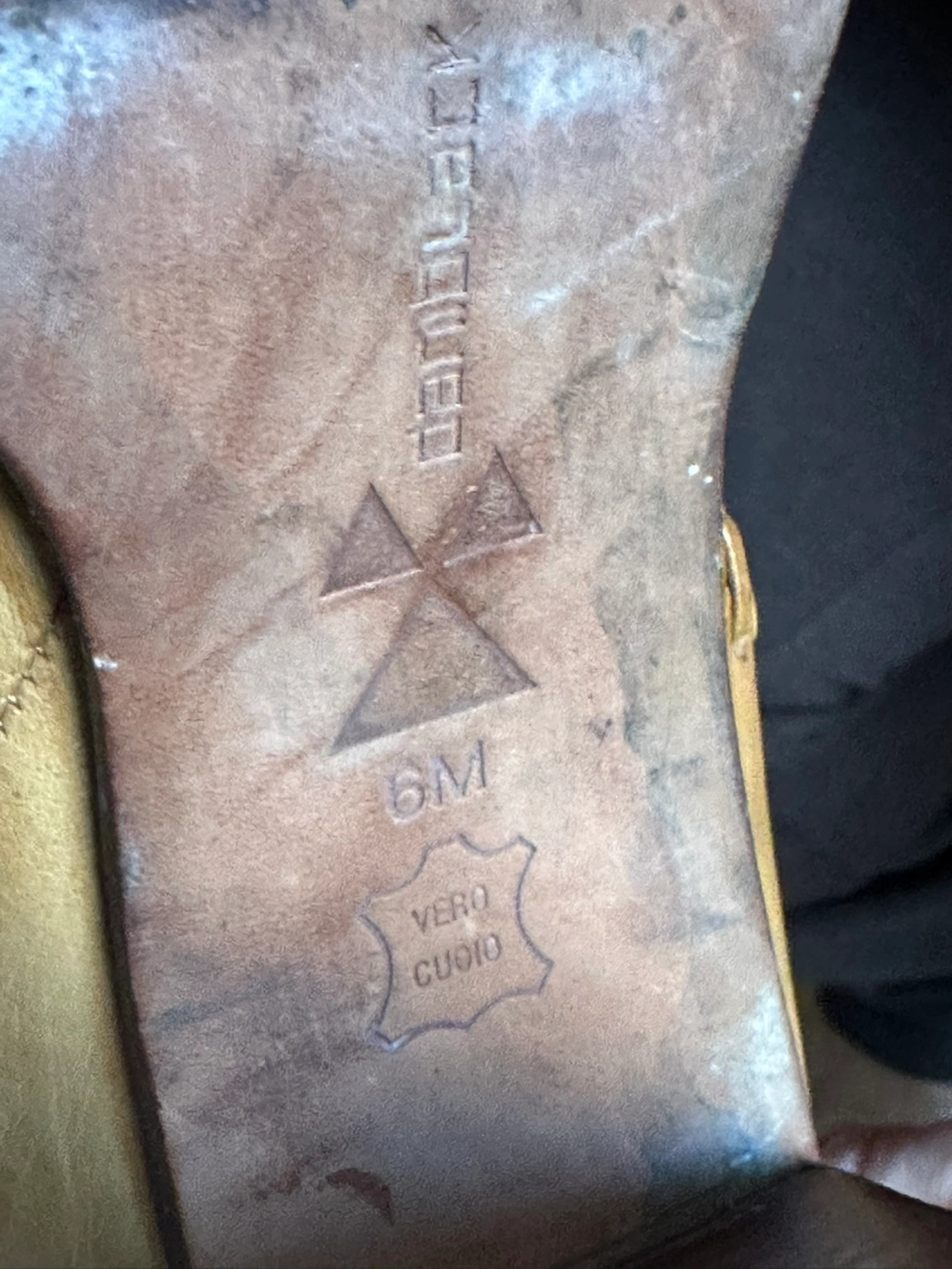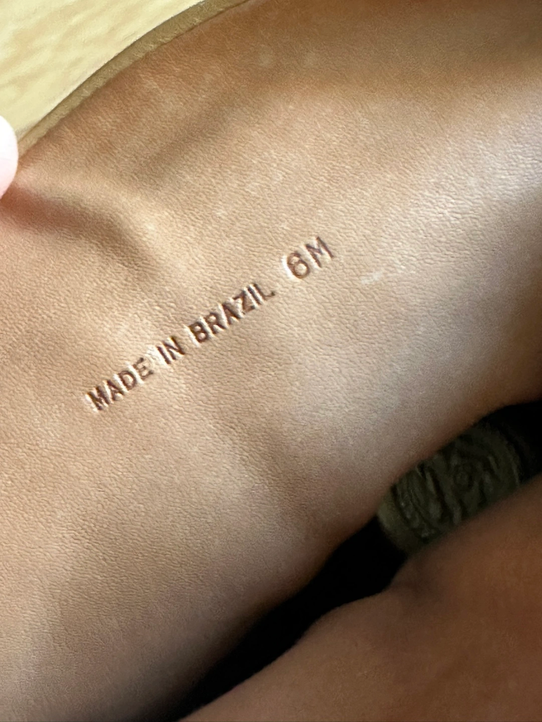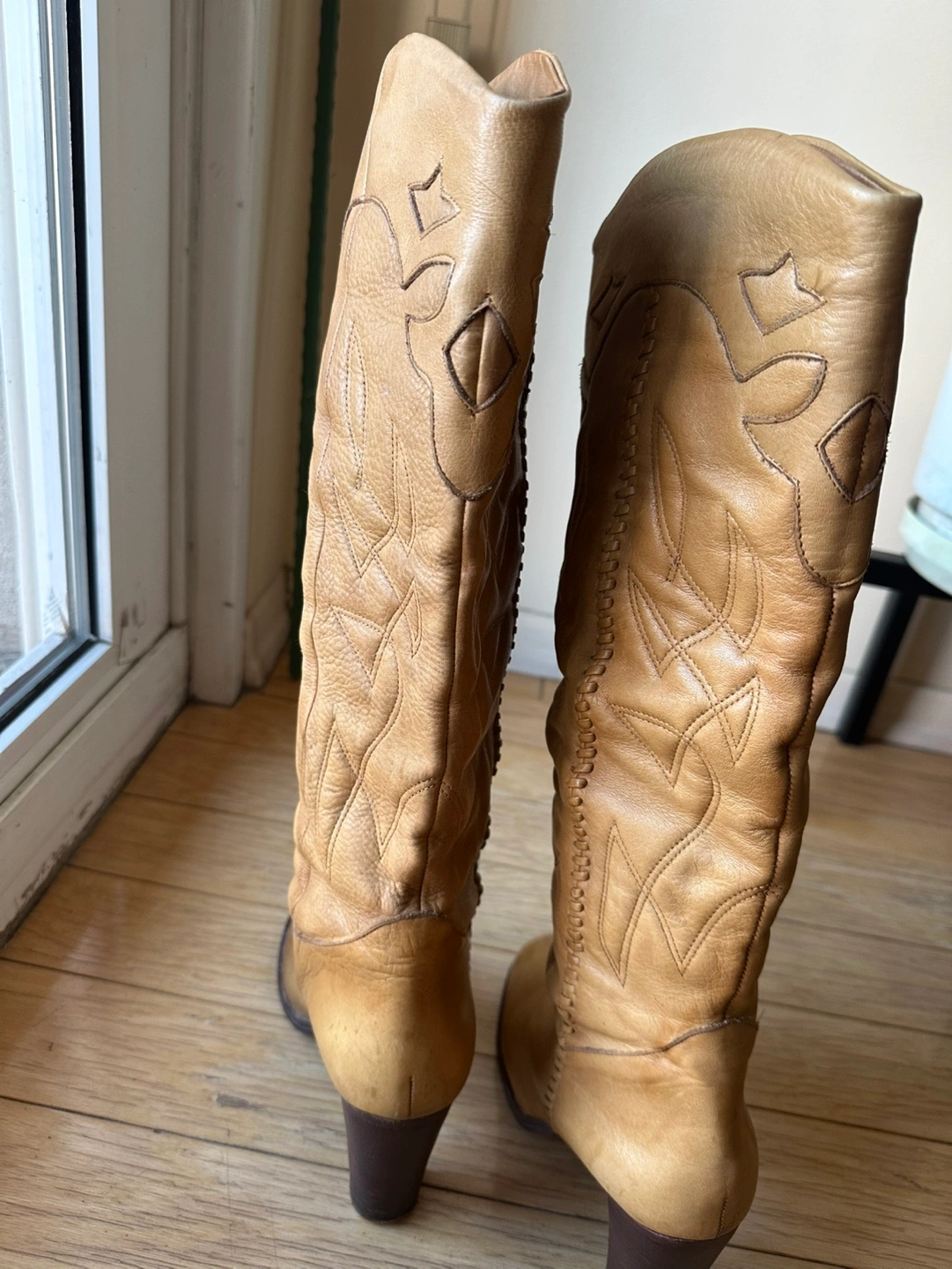 23Tan leather knee-high boots with a block heel and intricate stitching. Made in Brazil.