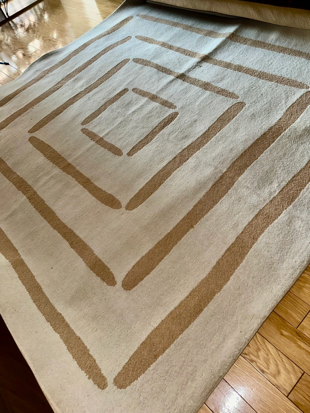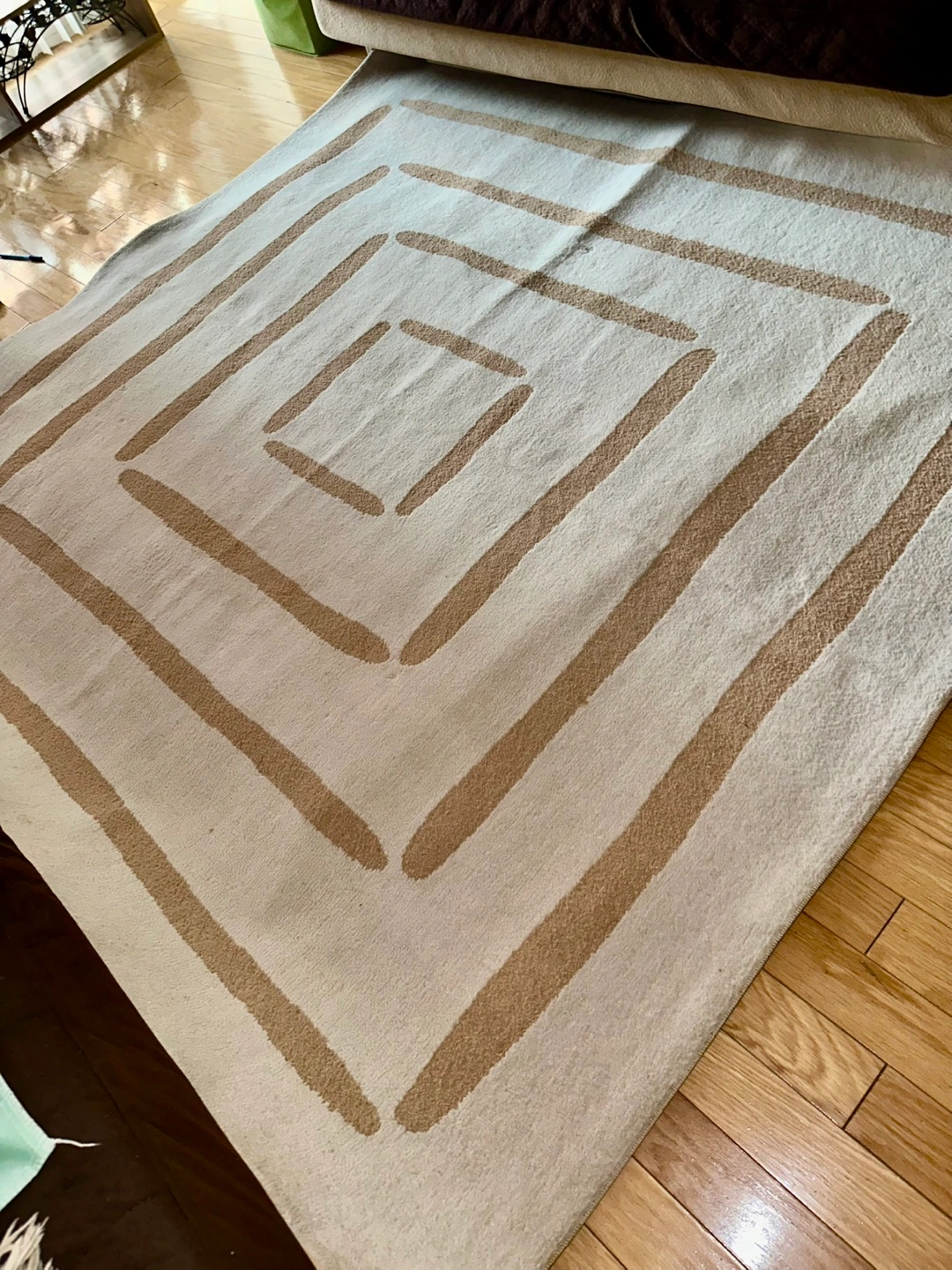 Large area rug, white with a beige geometric pattern, used but in good condition.