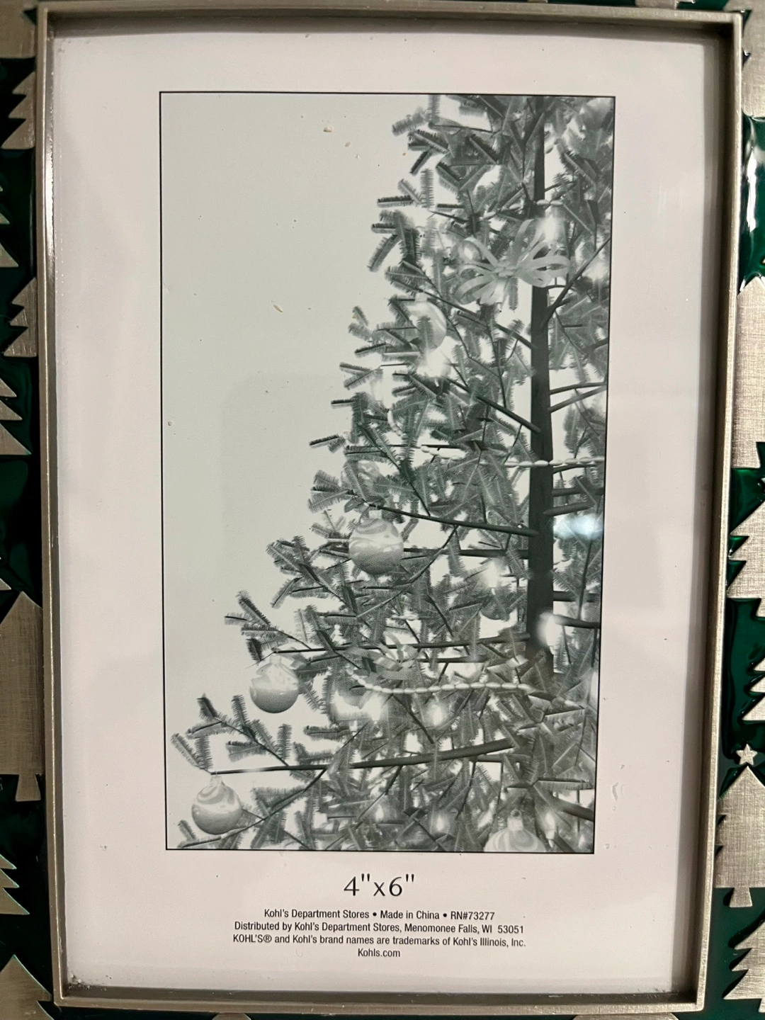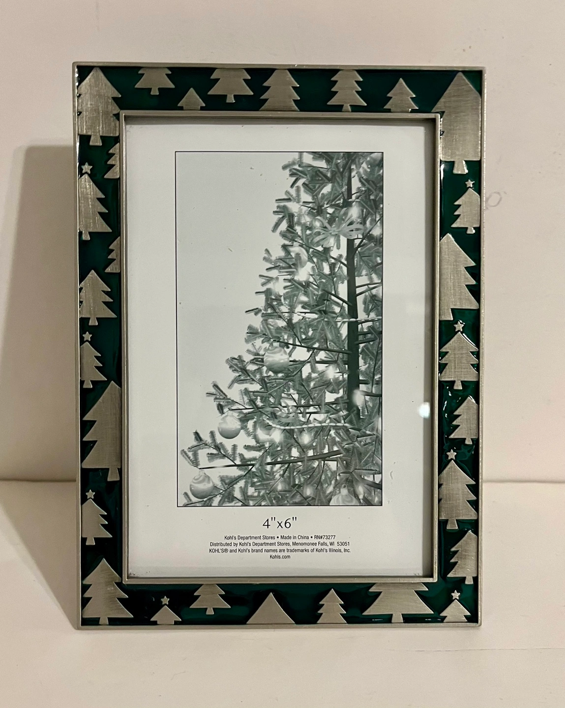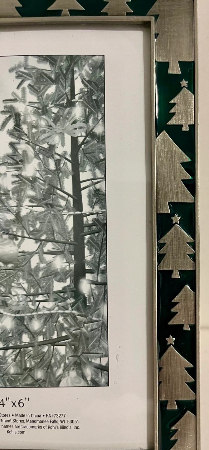 75Green and silver Christmas tree picture frame, 4x6 inches.