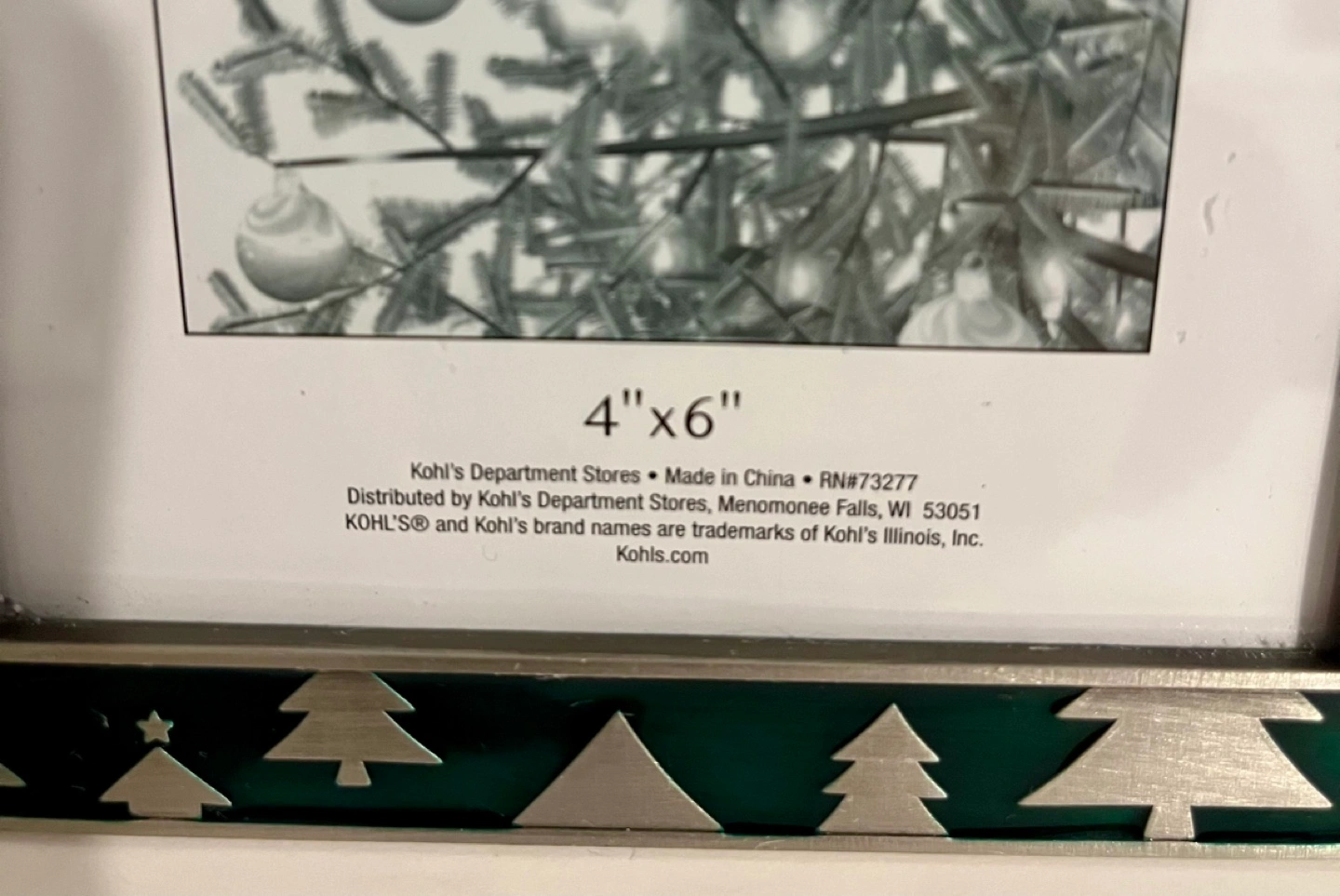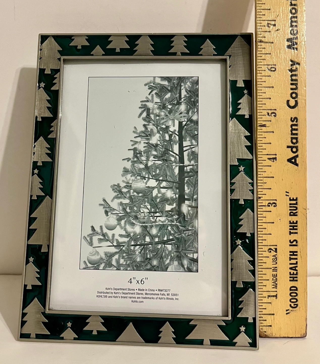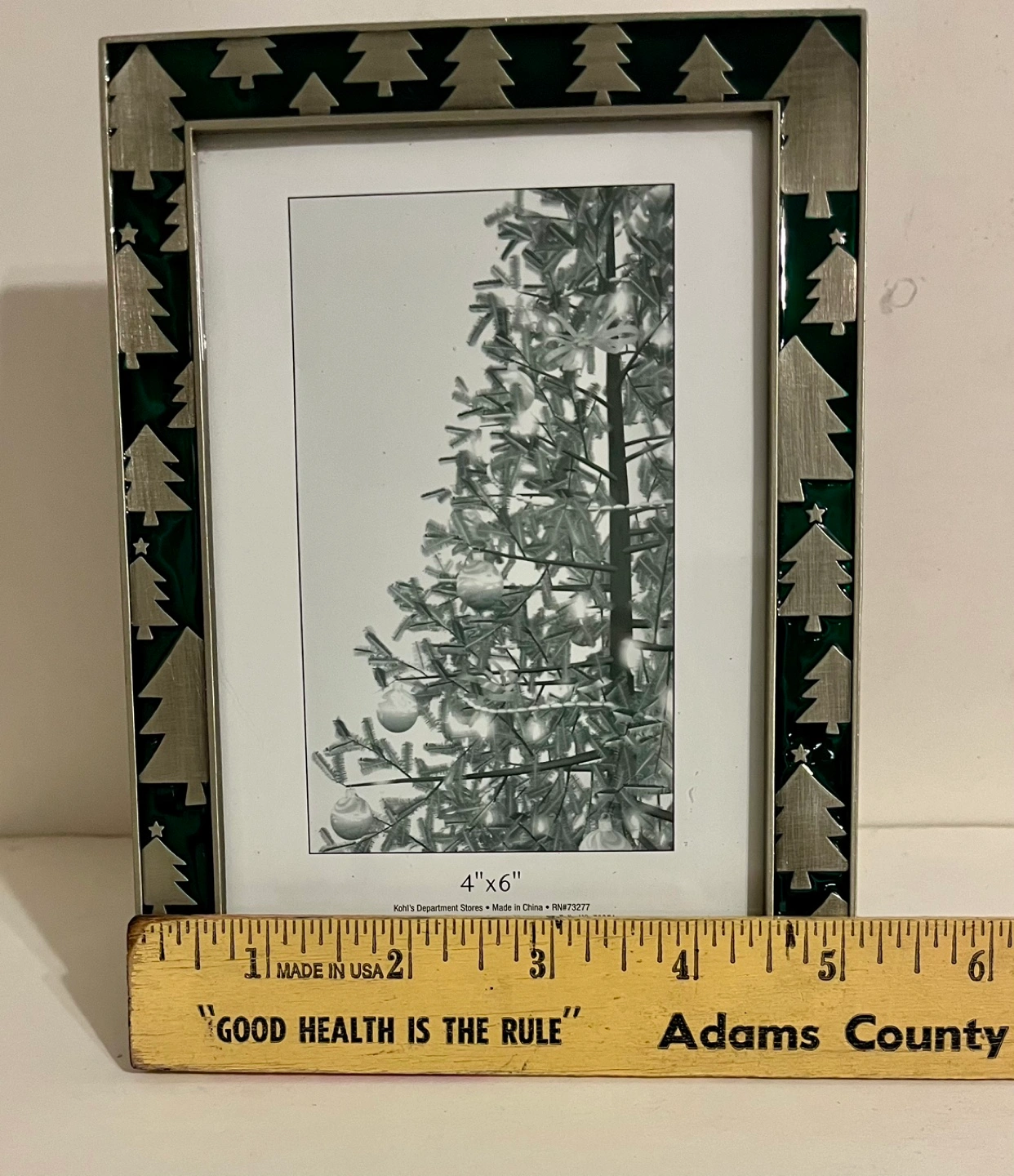 75Green and silver Christmas tree picture frame, 4x6 inches.