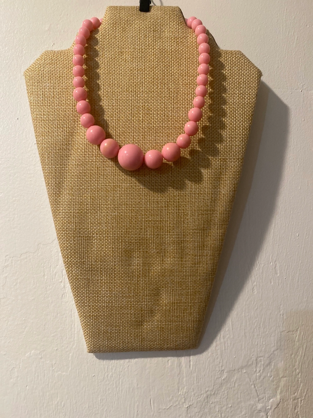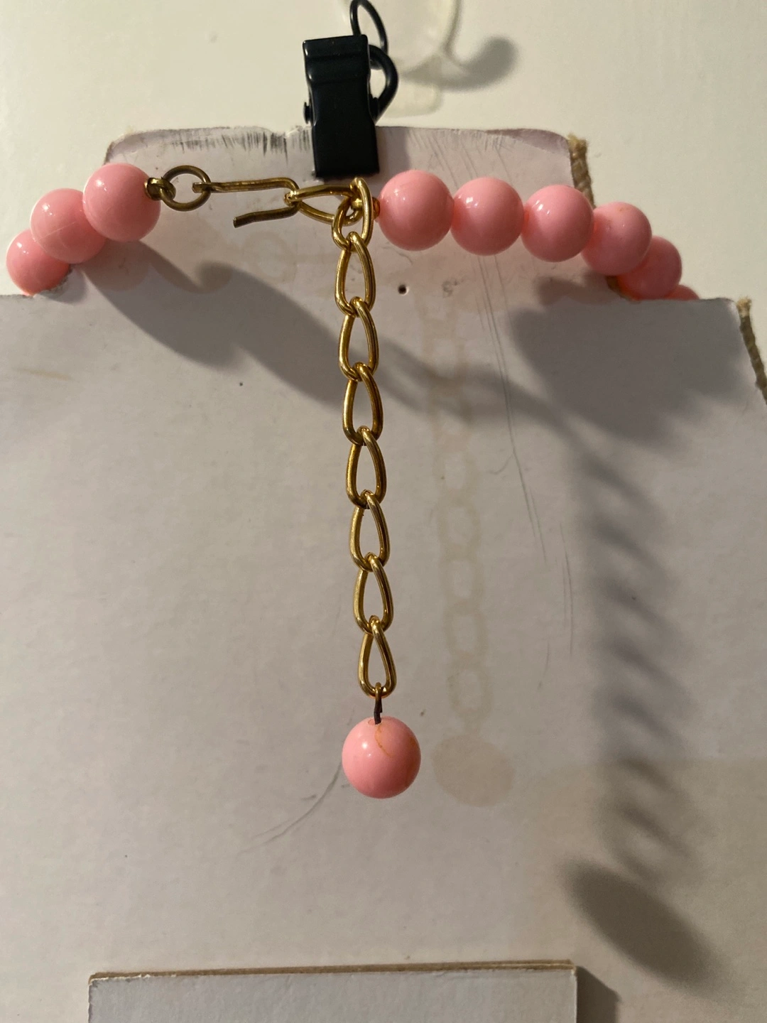 209Pink beaded necklace with a gold clasp and chain extension. Large beads.