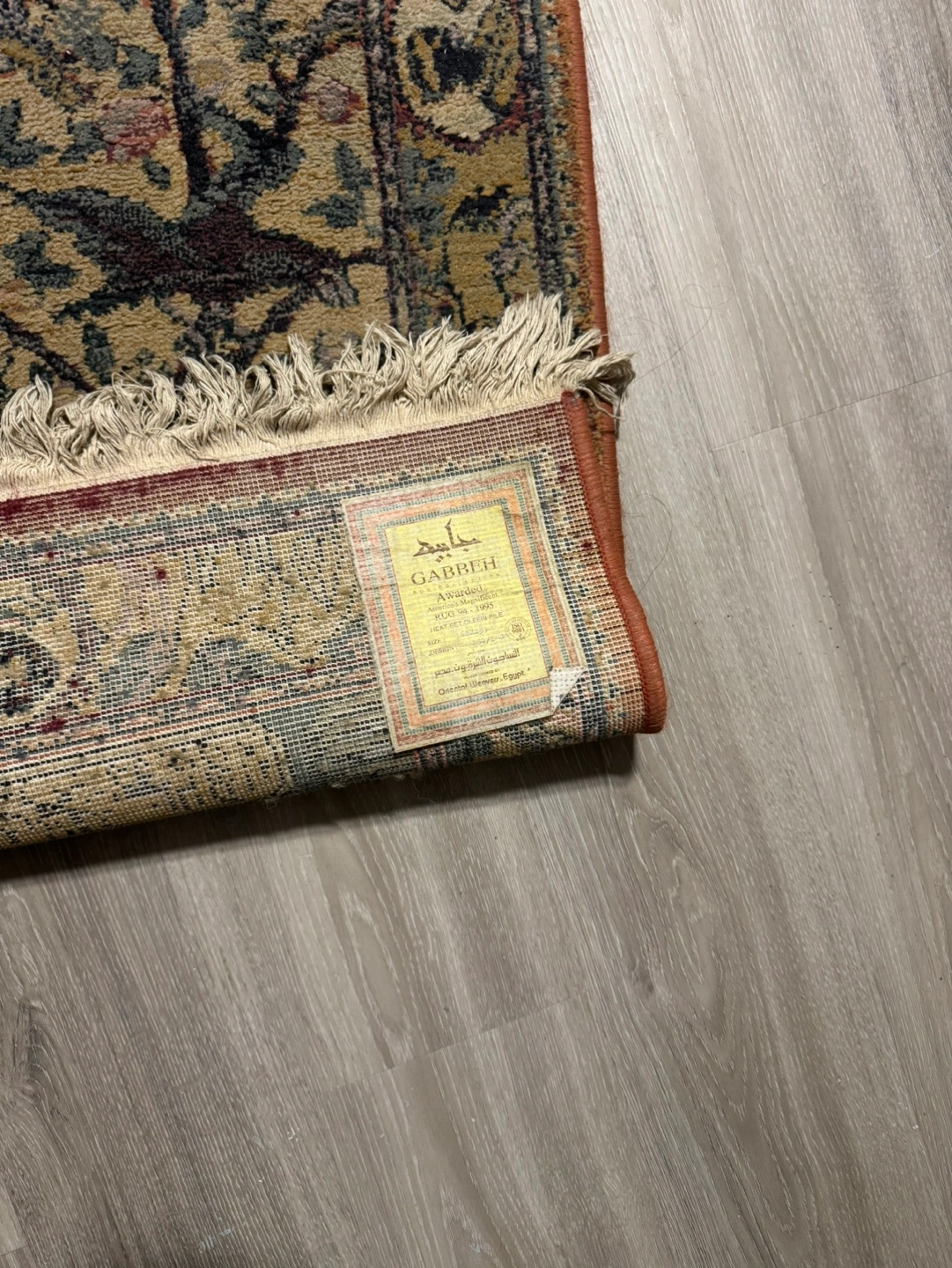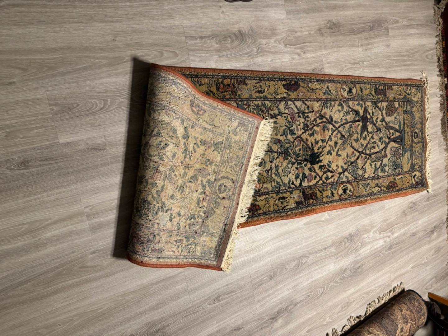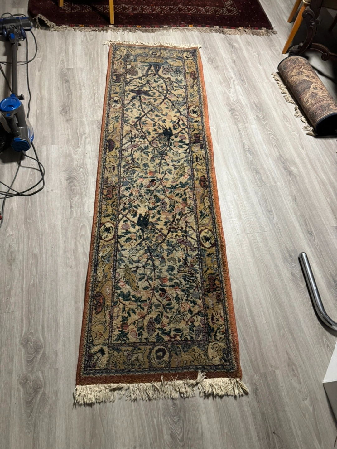 Floral pattern rug with fringed edges. Measures approximately 8 feet long by 2 feet wide.
