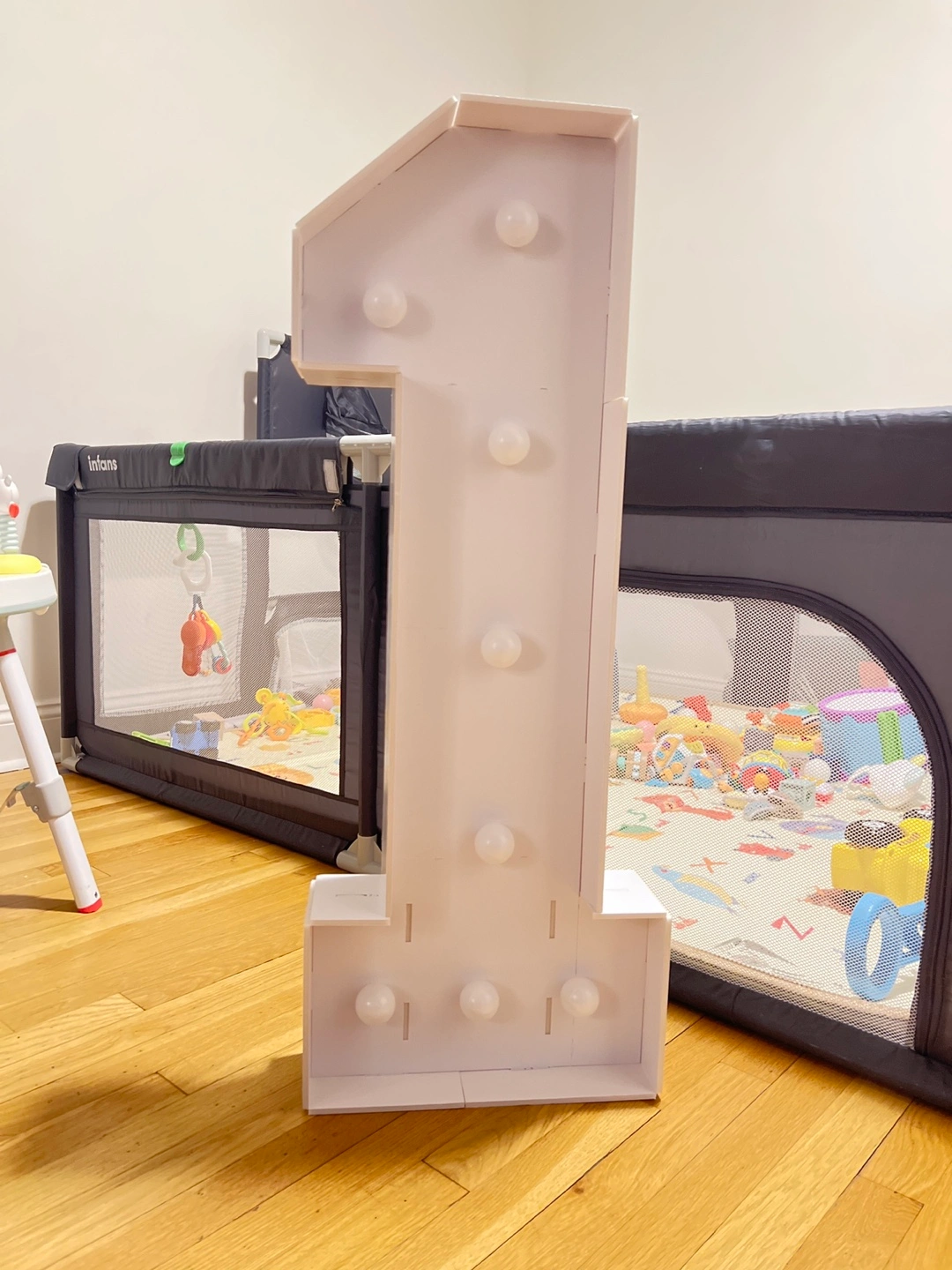 Large white number one with lights. Perfect for a first birthday party. Built but, no batteries included.