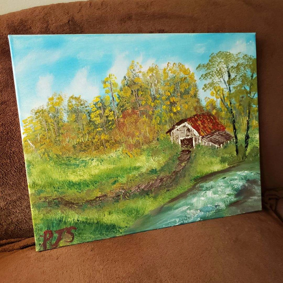 15Original oil painting on canvas. Signed by the artist PJS. Depicts a countryside scene with a small wooden barn and a river.
