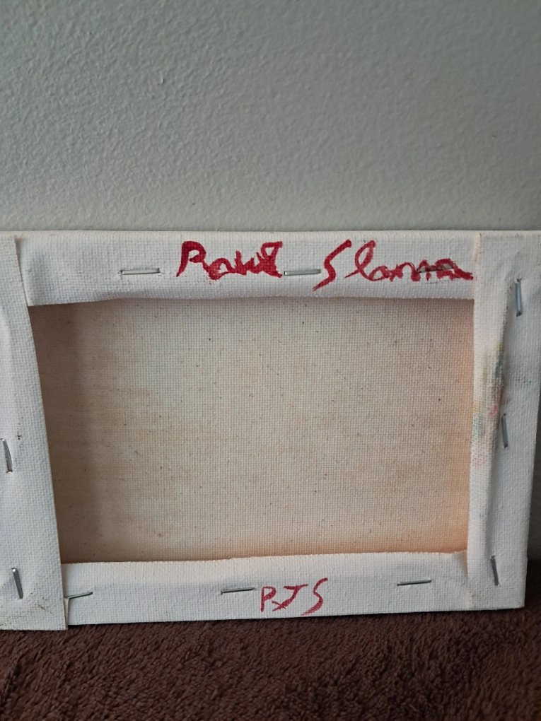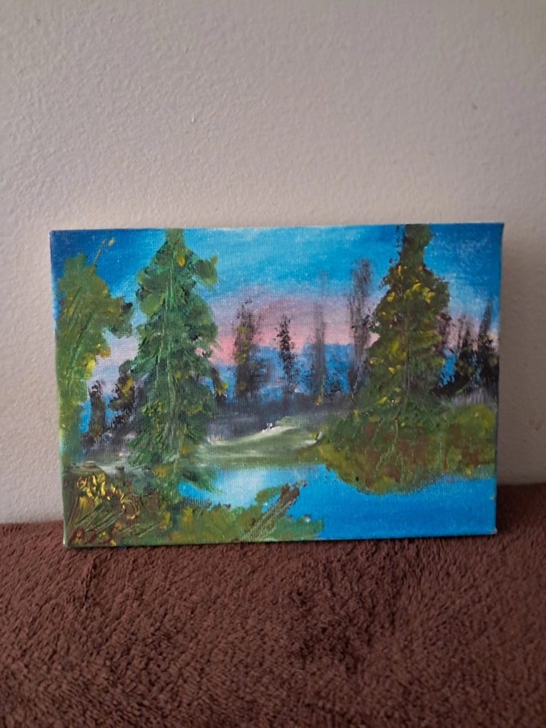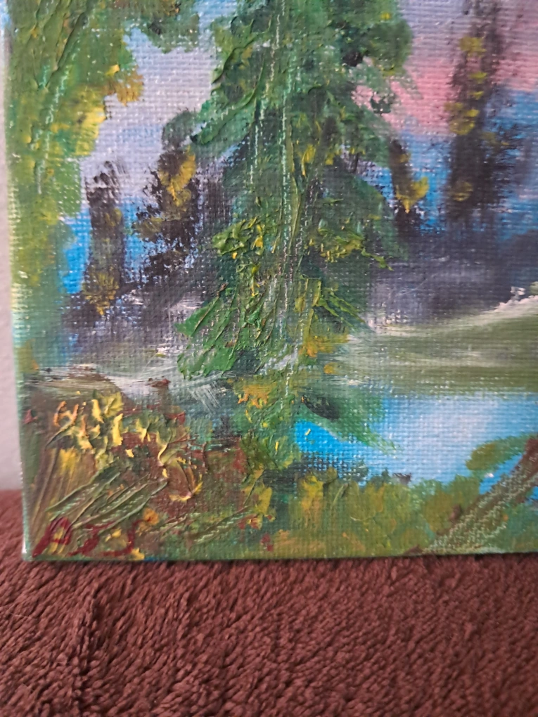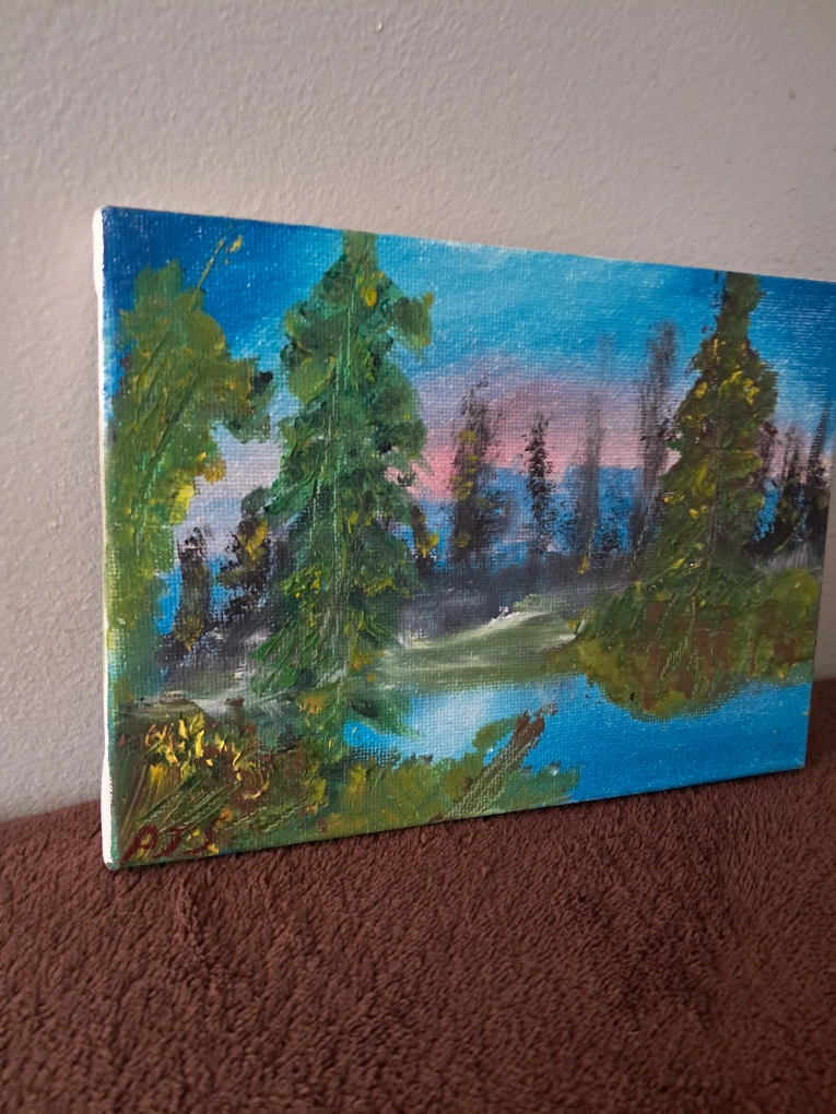 Small original painting on canvas. Depicts a forest scene with trees and a body of water. Signed on the back.