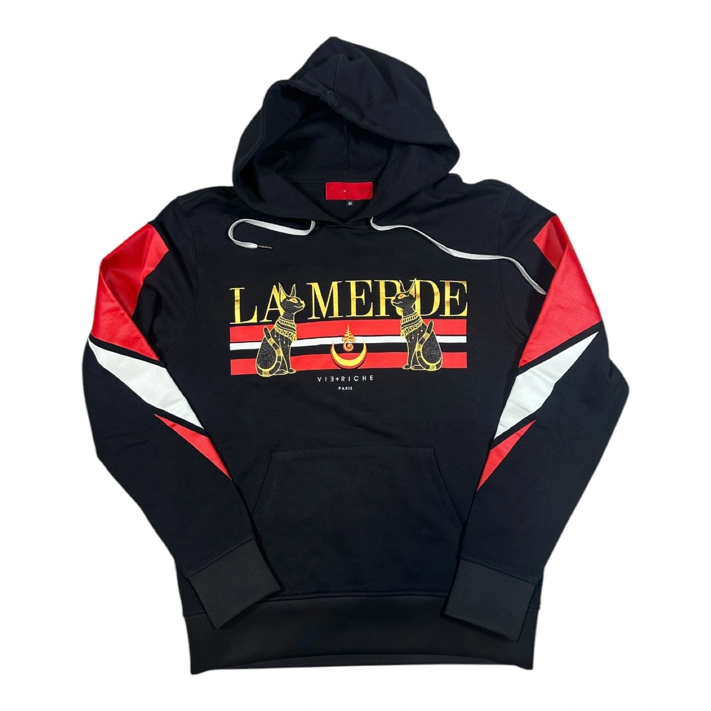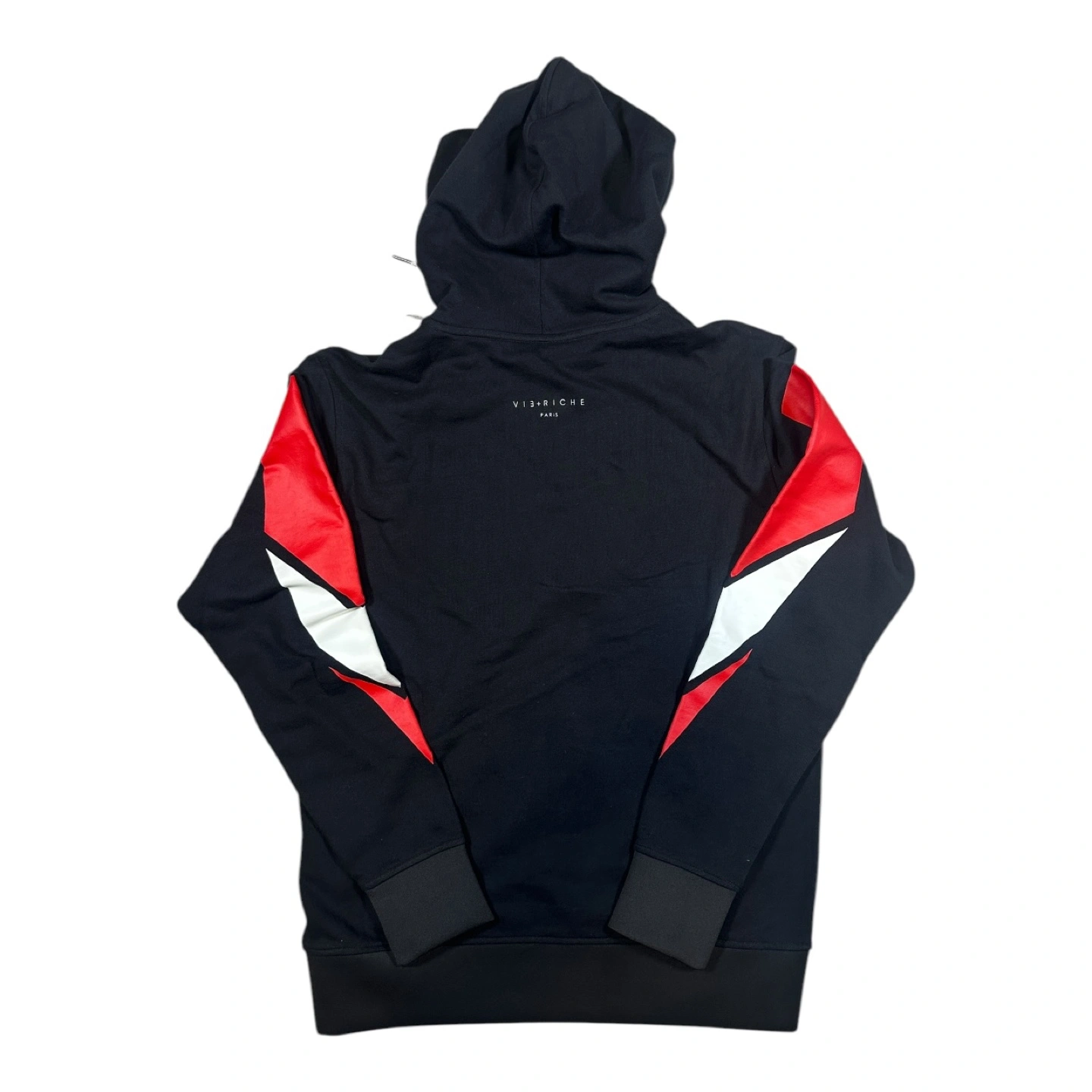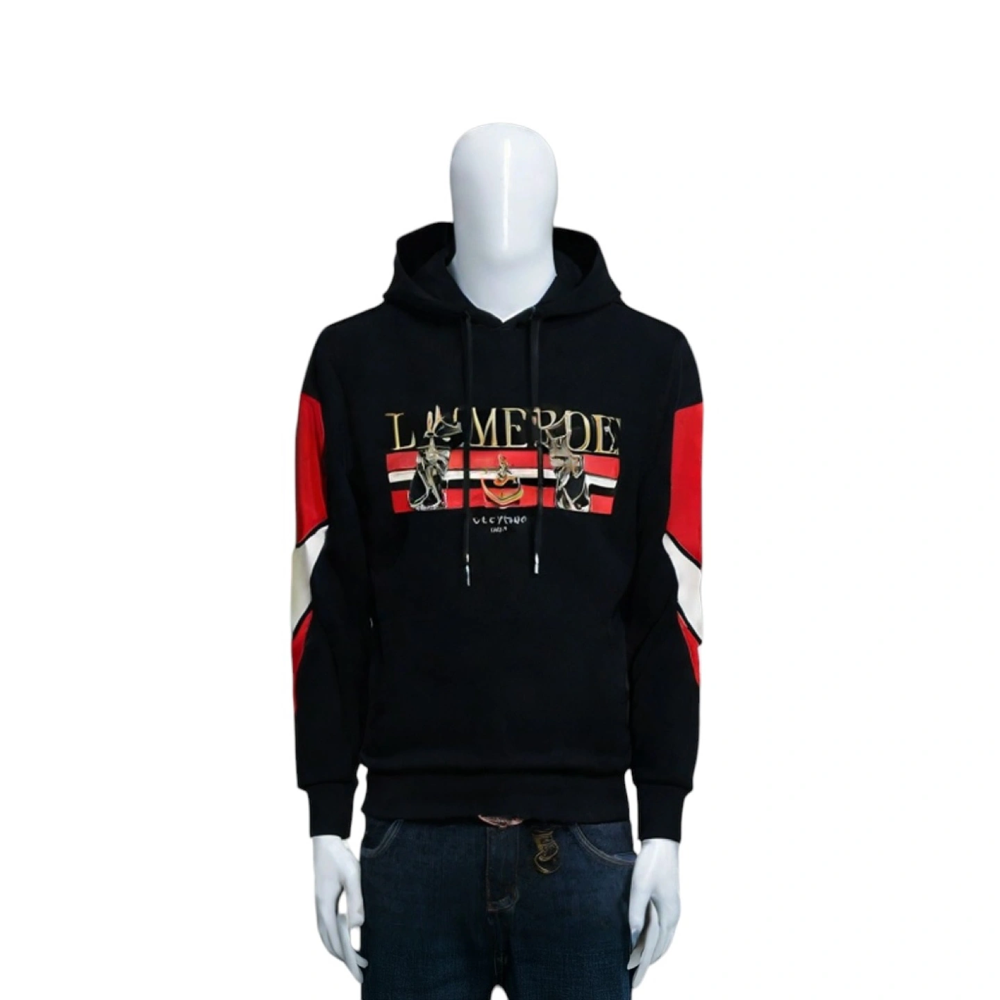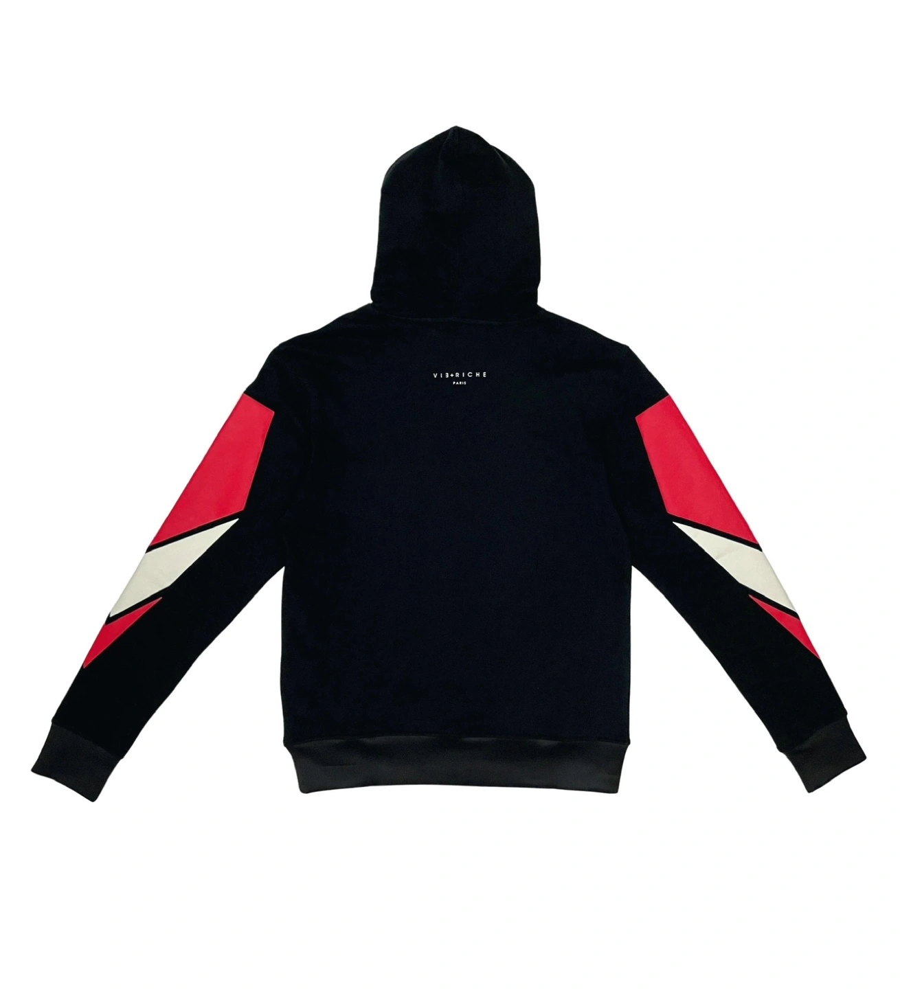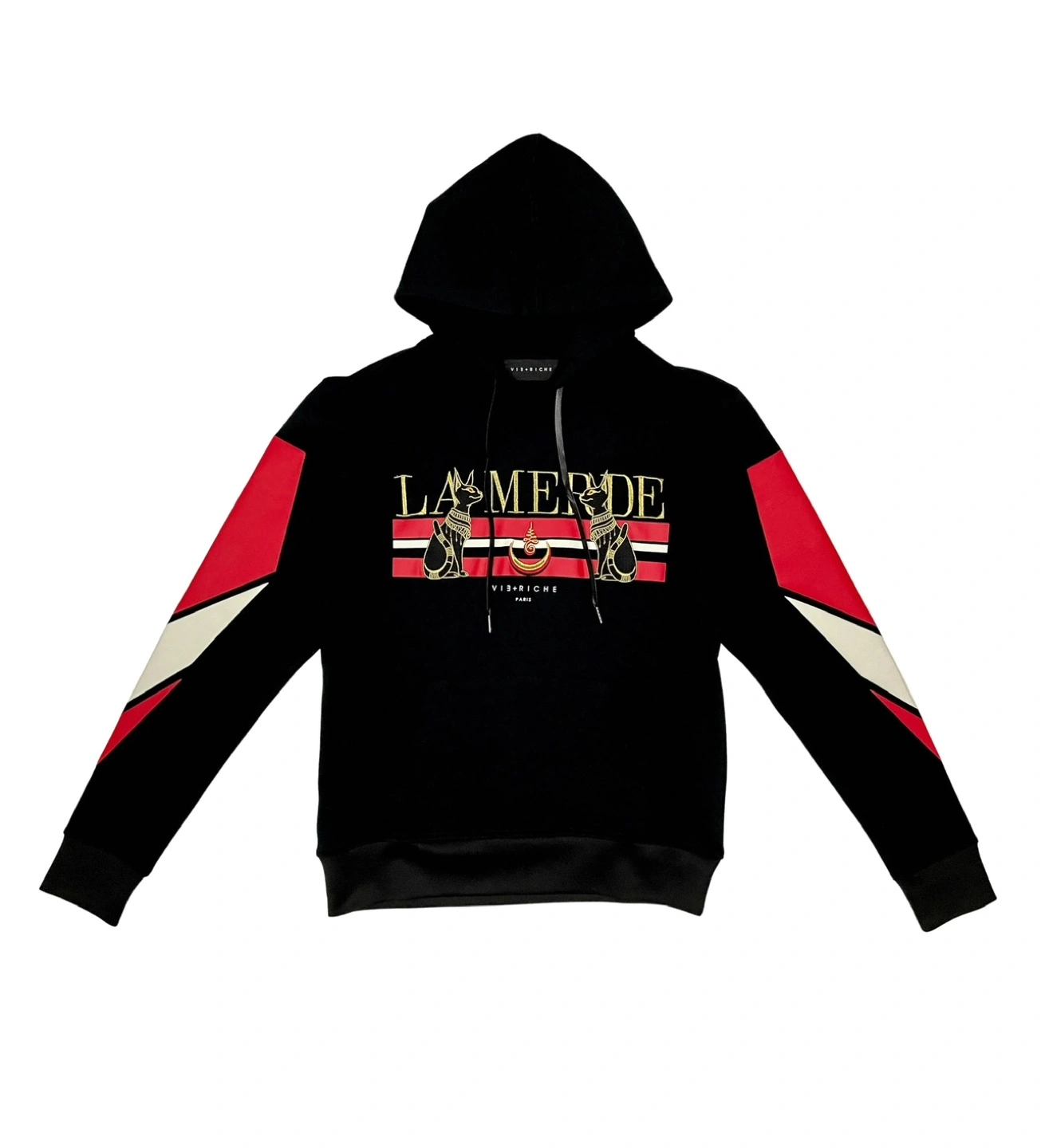 411Black hoodie with red and white accents. Features a graphic print on the front.