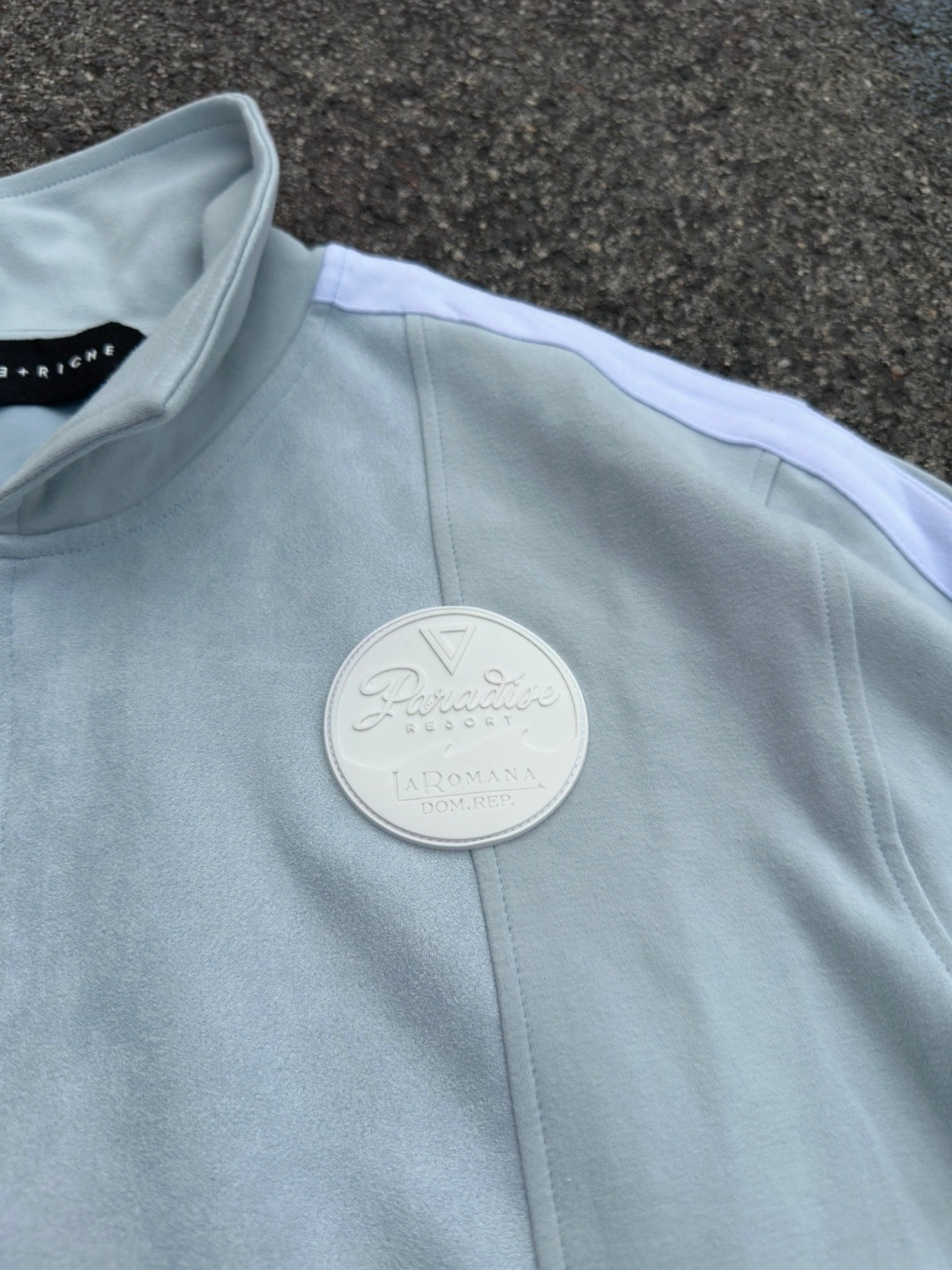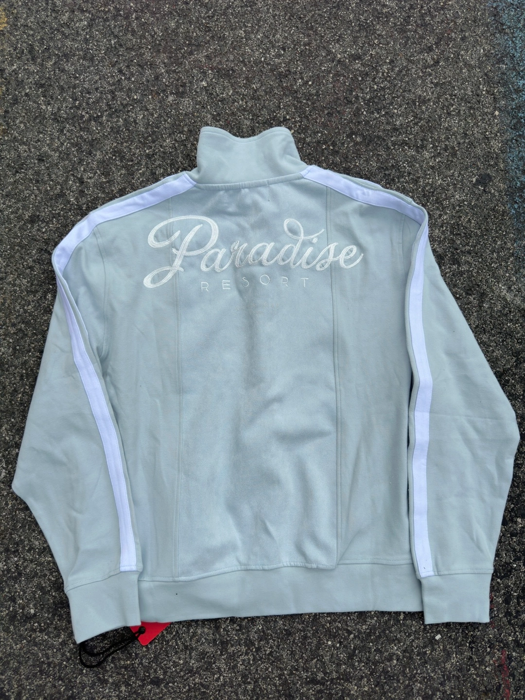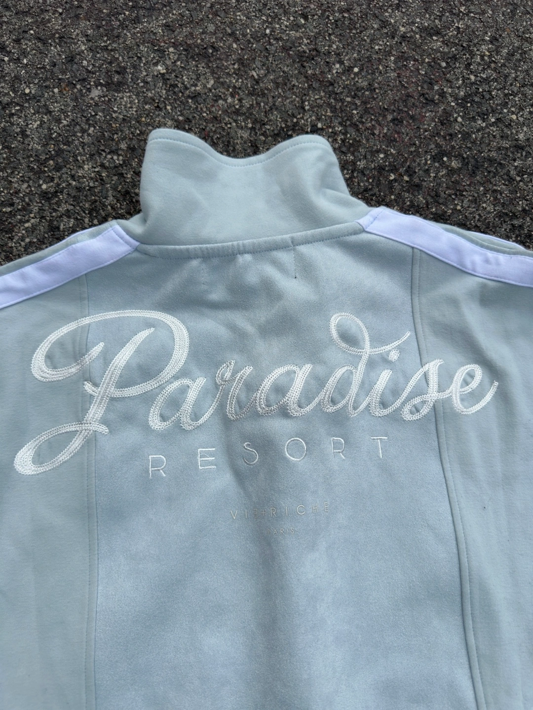411Light blue jacket with white stripes on the sleeves and Paradise Design logo. Zip closure and two zippered pockets.