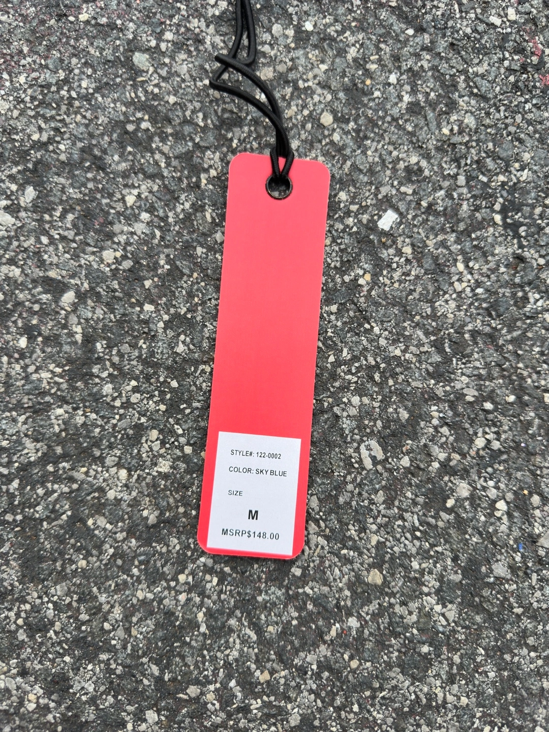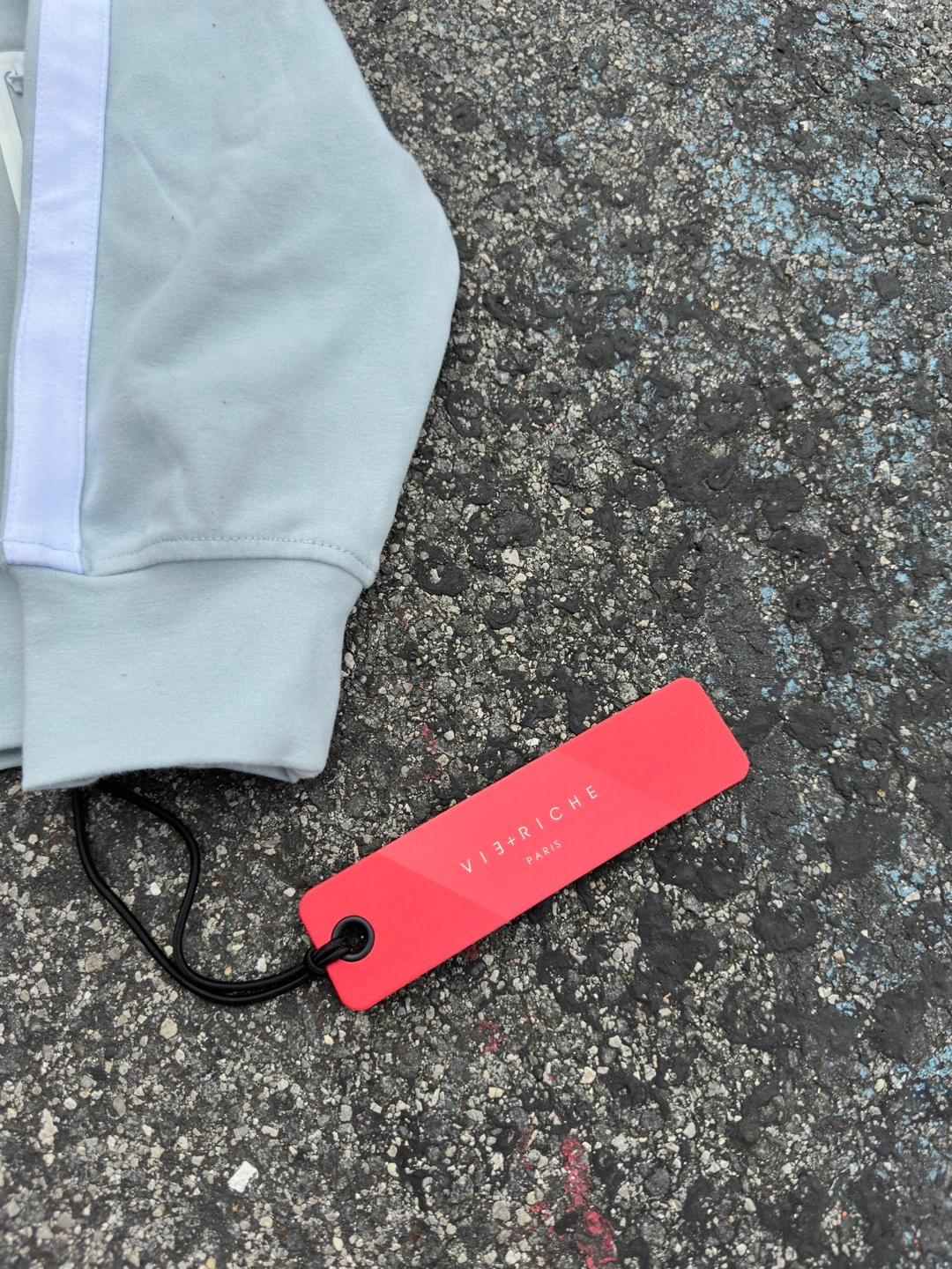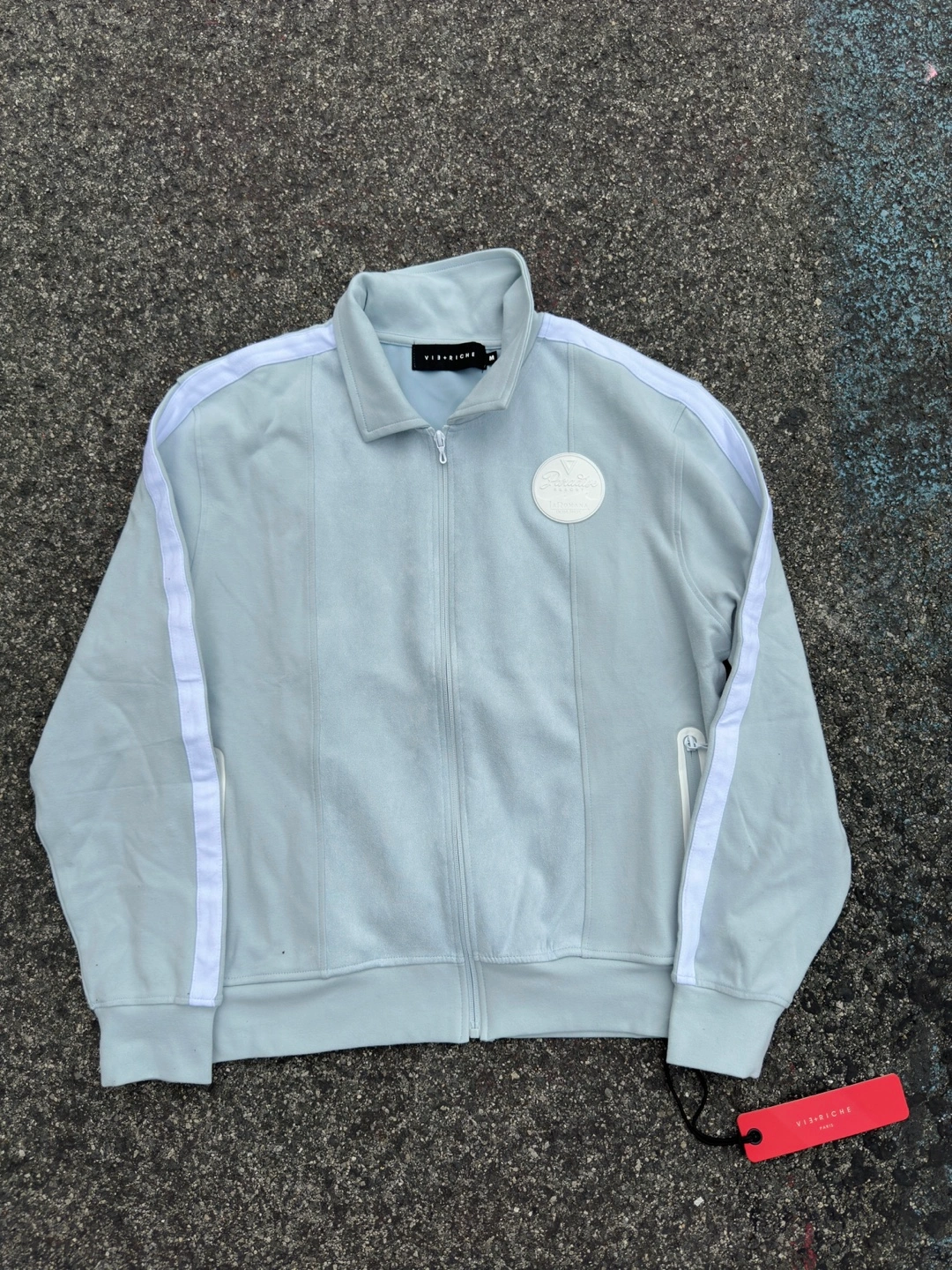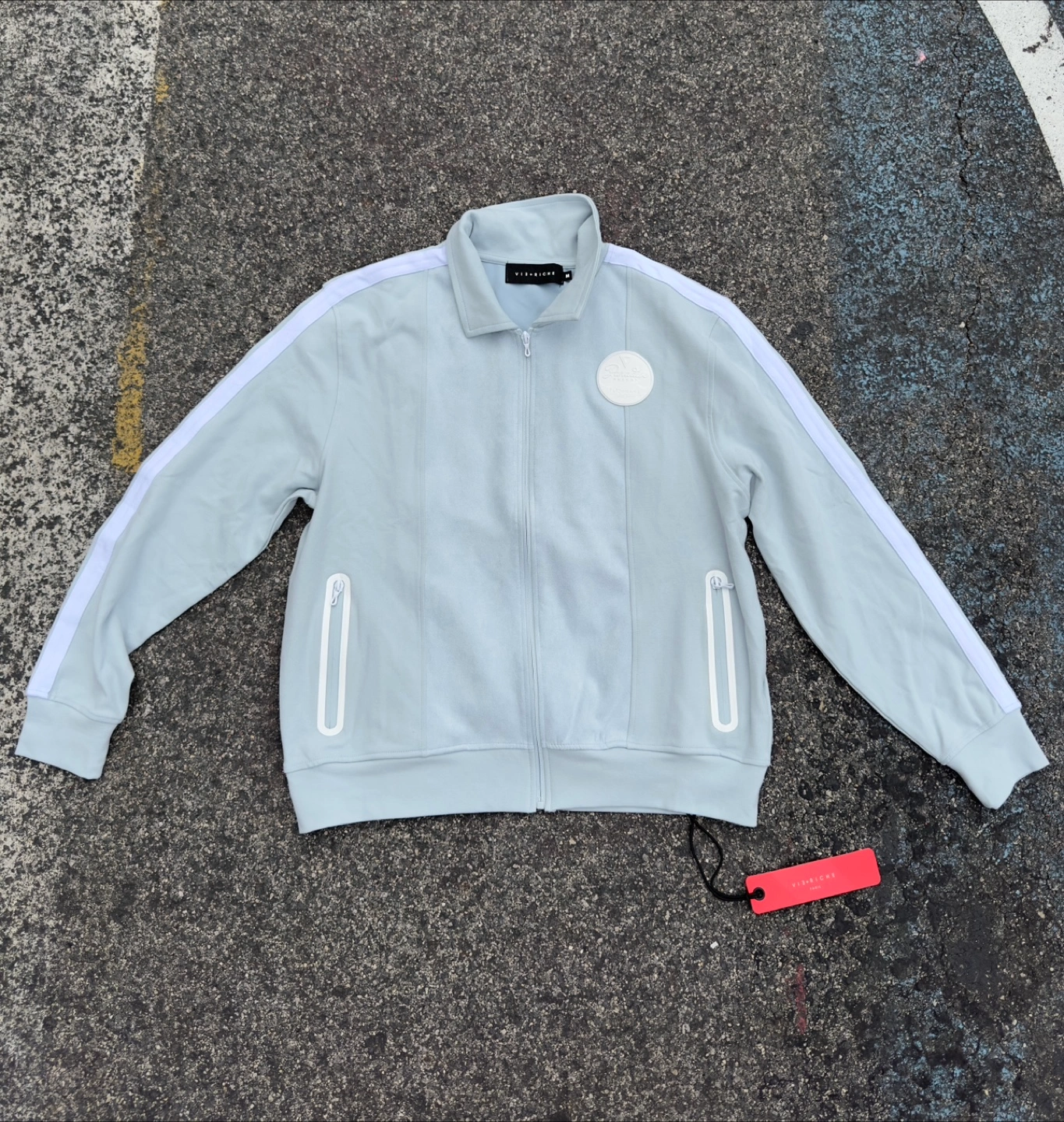 411Light blue jacket with white stripes on the sleeves and Paradise Design logo. Zip closure and two zippered pockets.