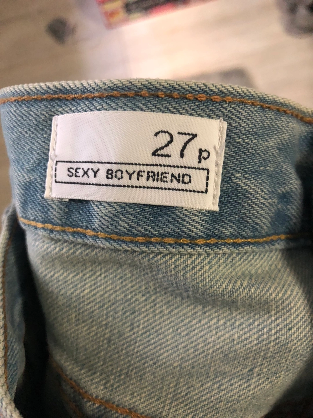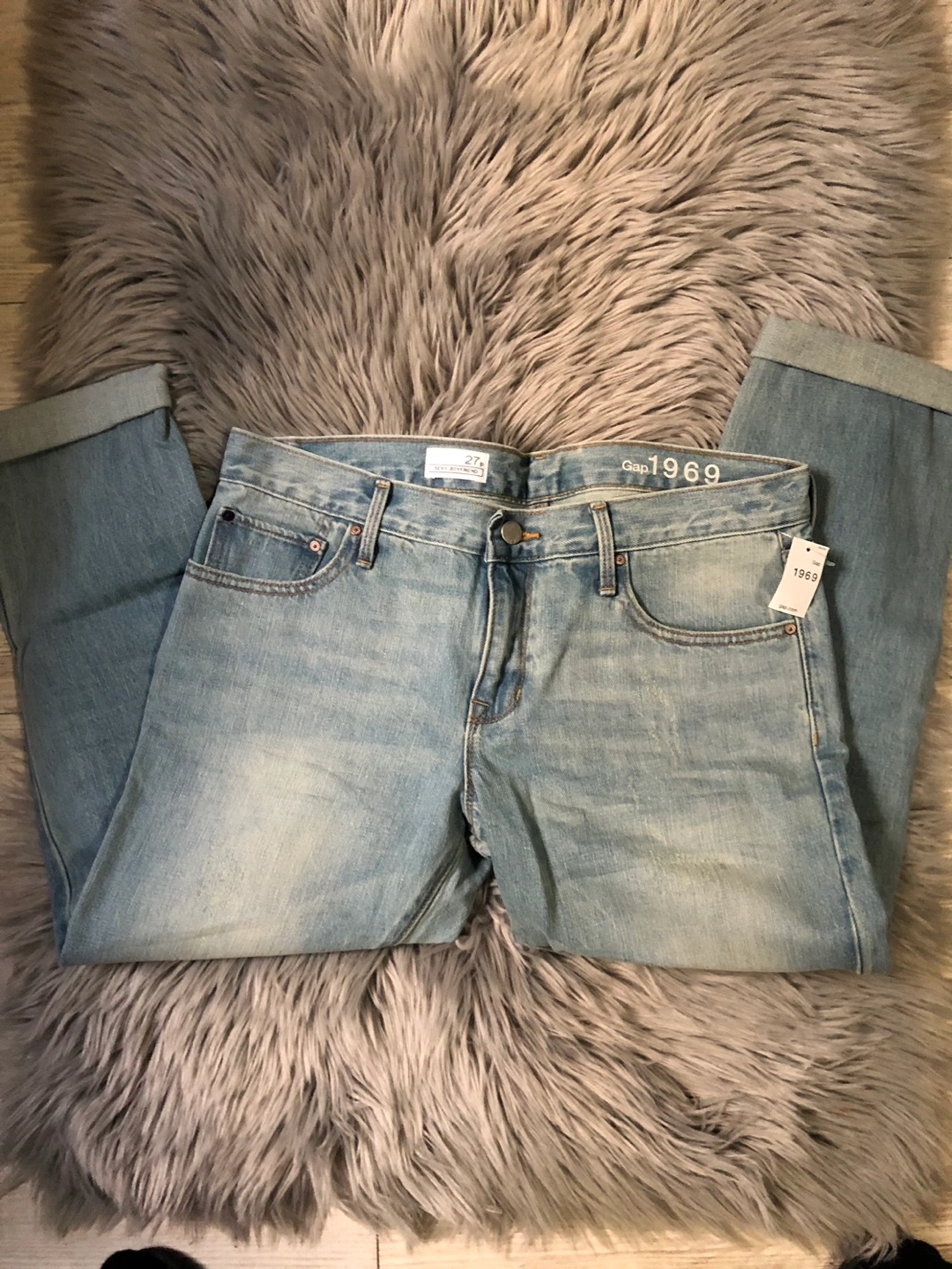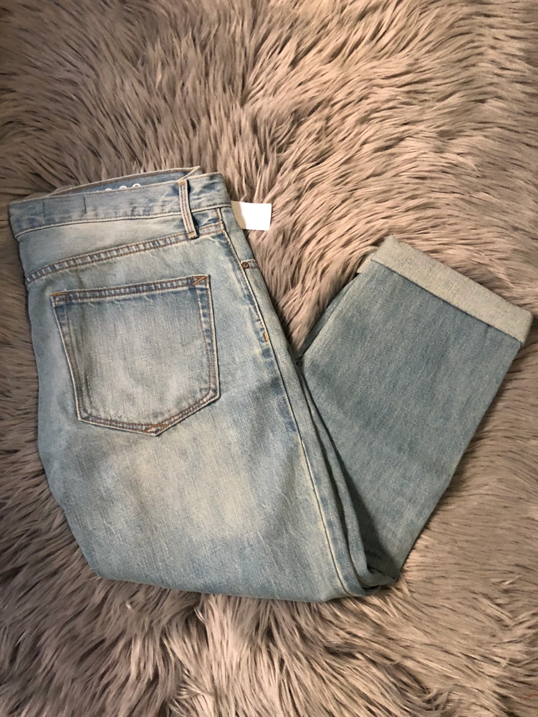 Light wash denim jeans. Size 27. Cuffed at the bottom.