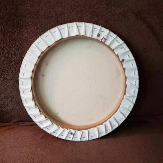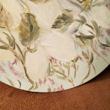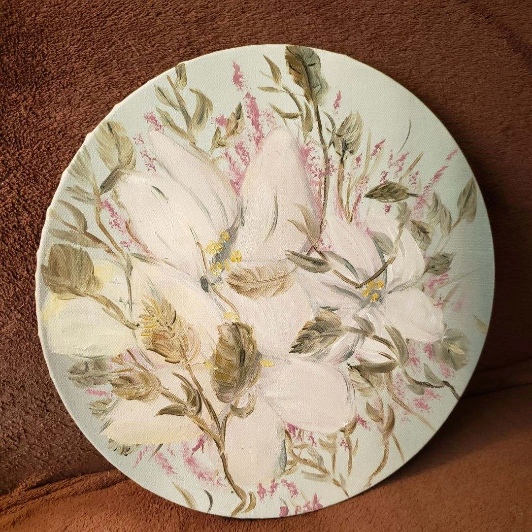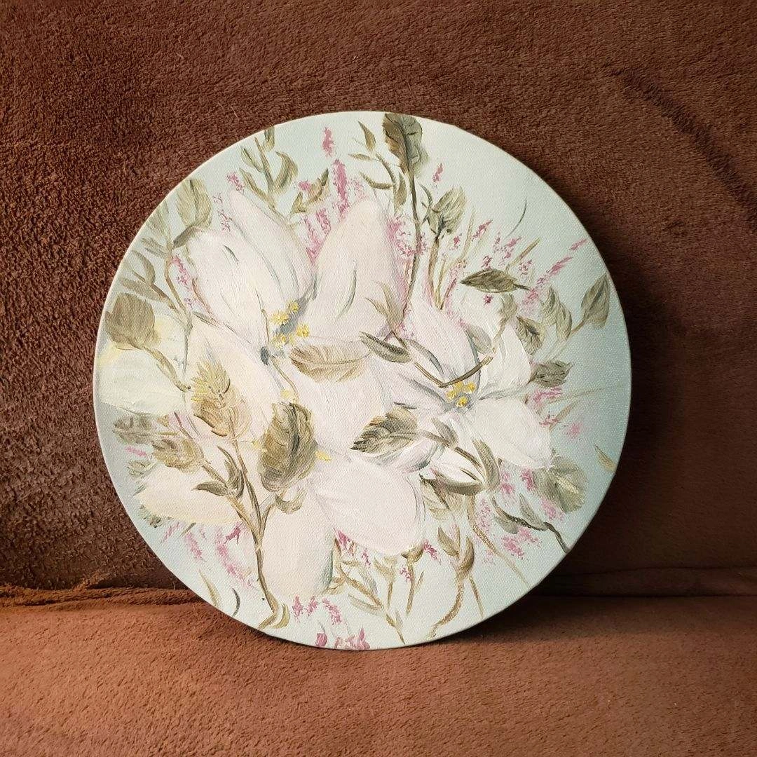 Round canvas with a painting of white flowers on a light blue background. No visible signature.