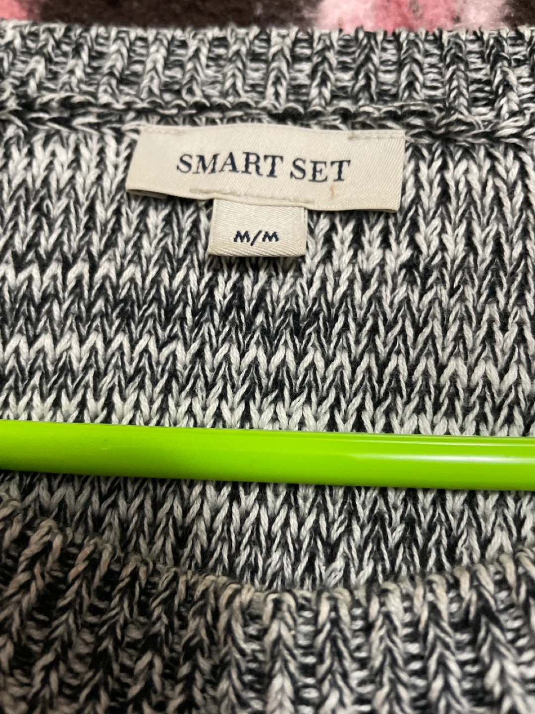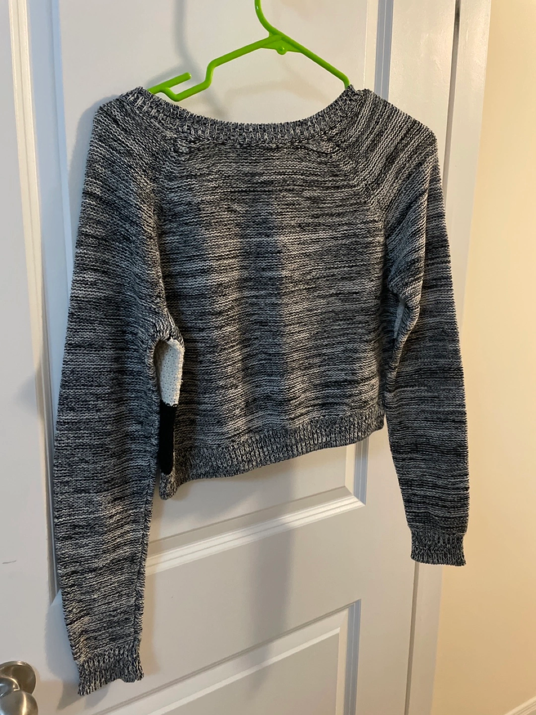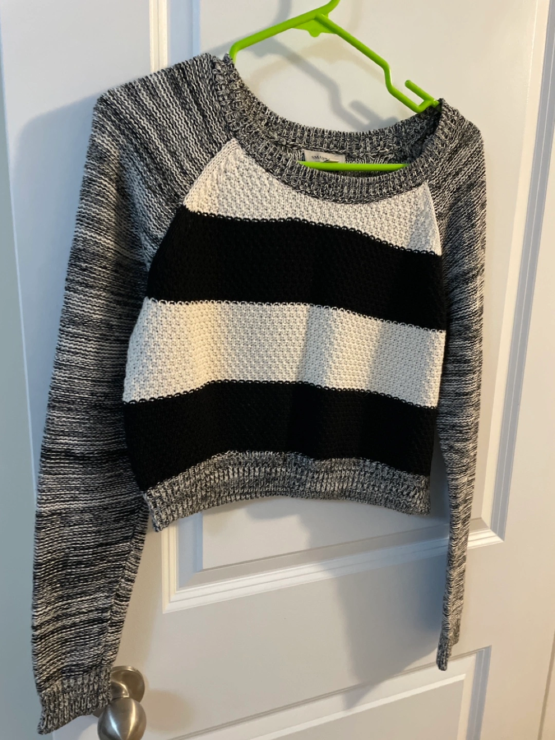 Black and white striped sweater. Grey and white marled sleeves. Long sleeves. Crew neck. Cropped. Smoke free and pet free home