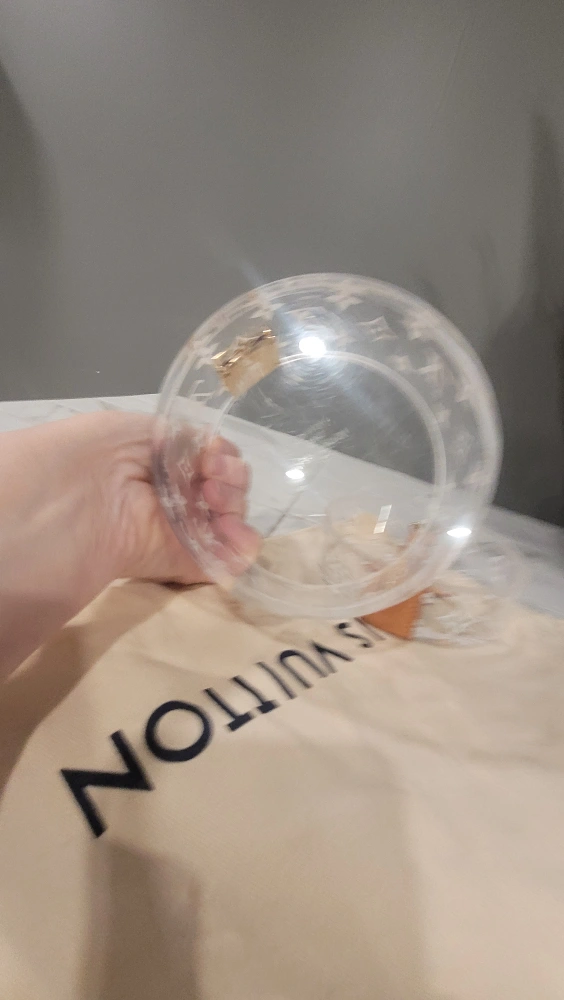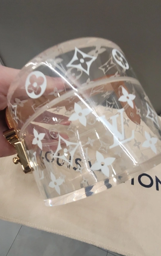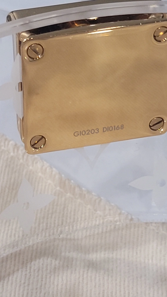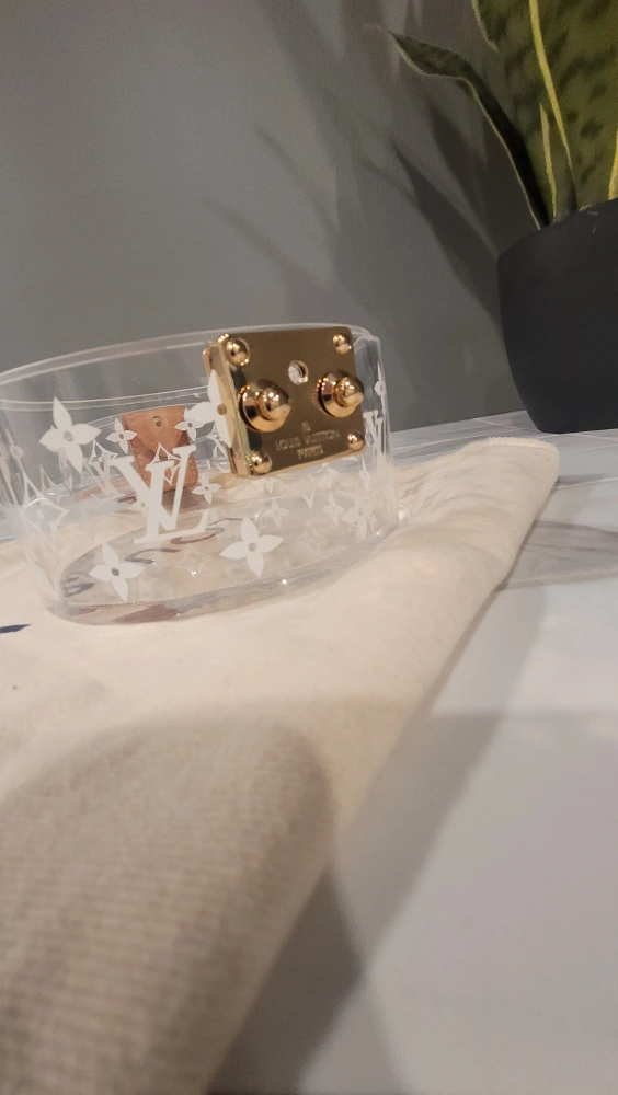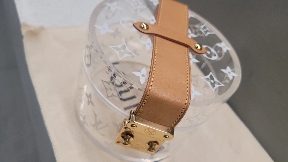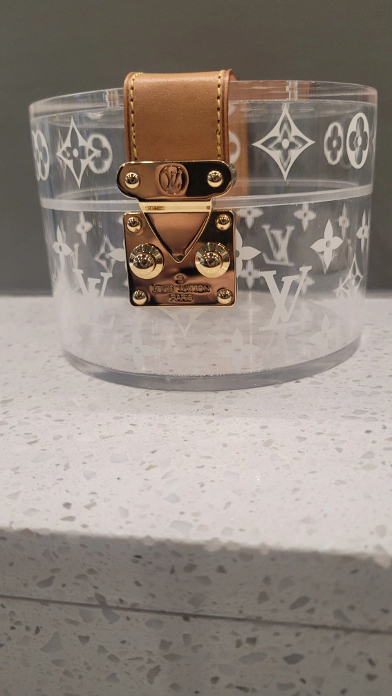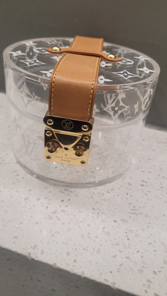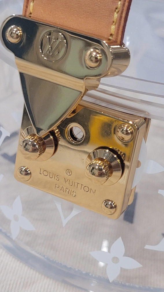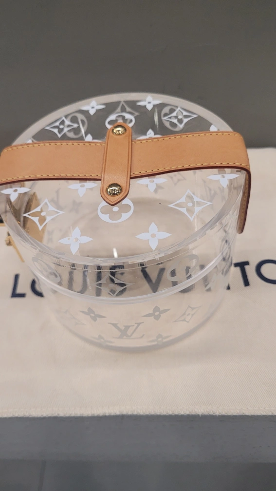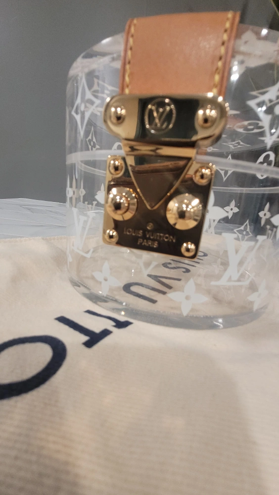 484Clear acrylic cosmetic case with white monogram pattern, gold hardware, and brown leather strap. Dust bag included. In very good condition with some smaller rubs and scratches on bottom. 💯 authentic Louis Vuitton.