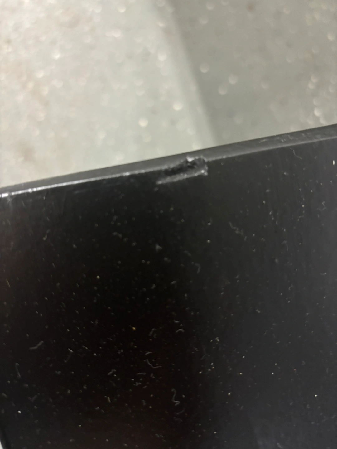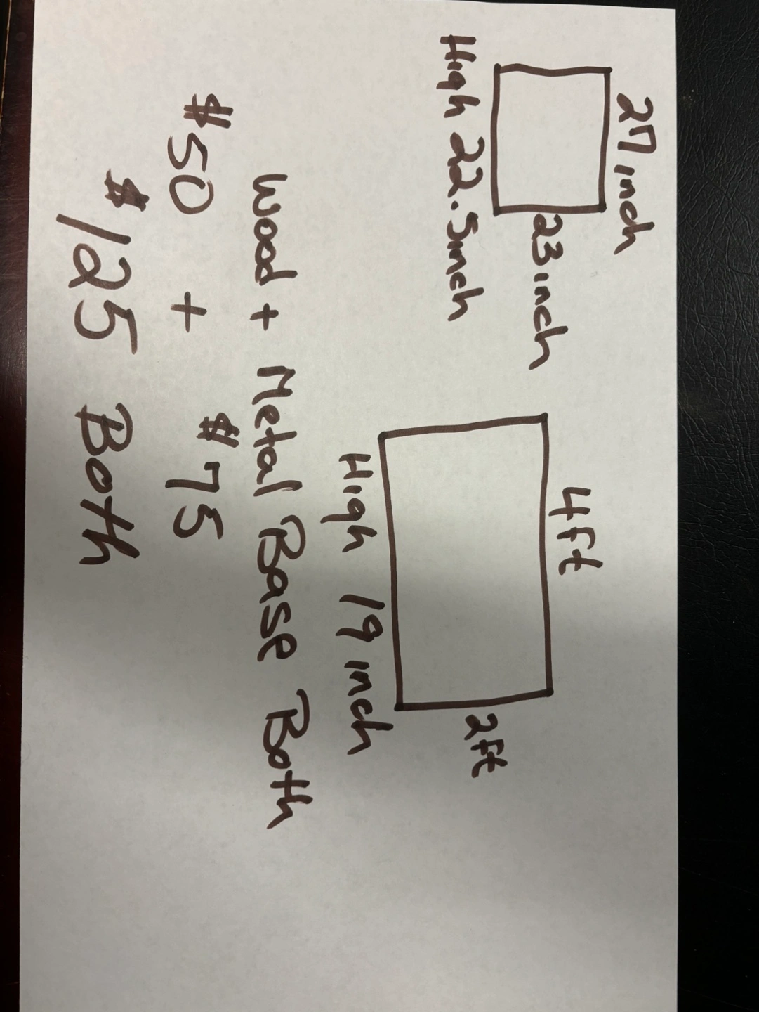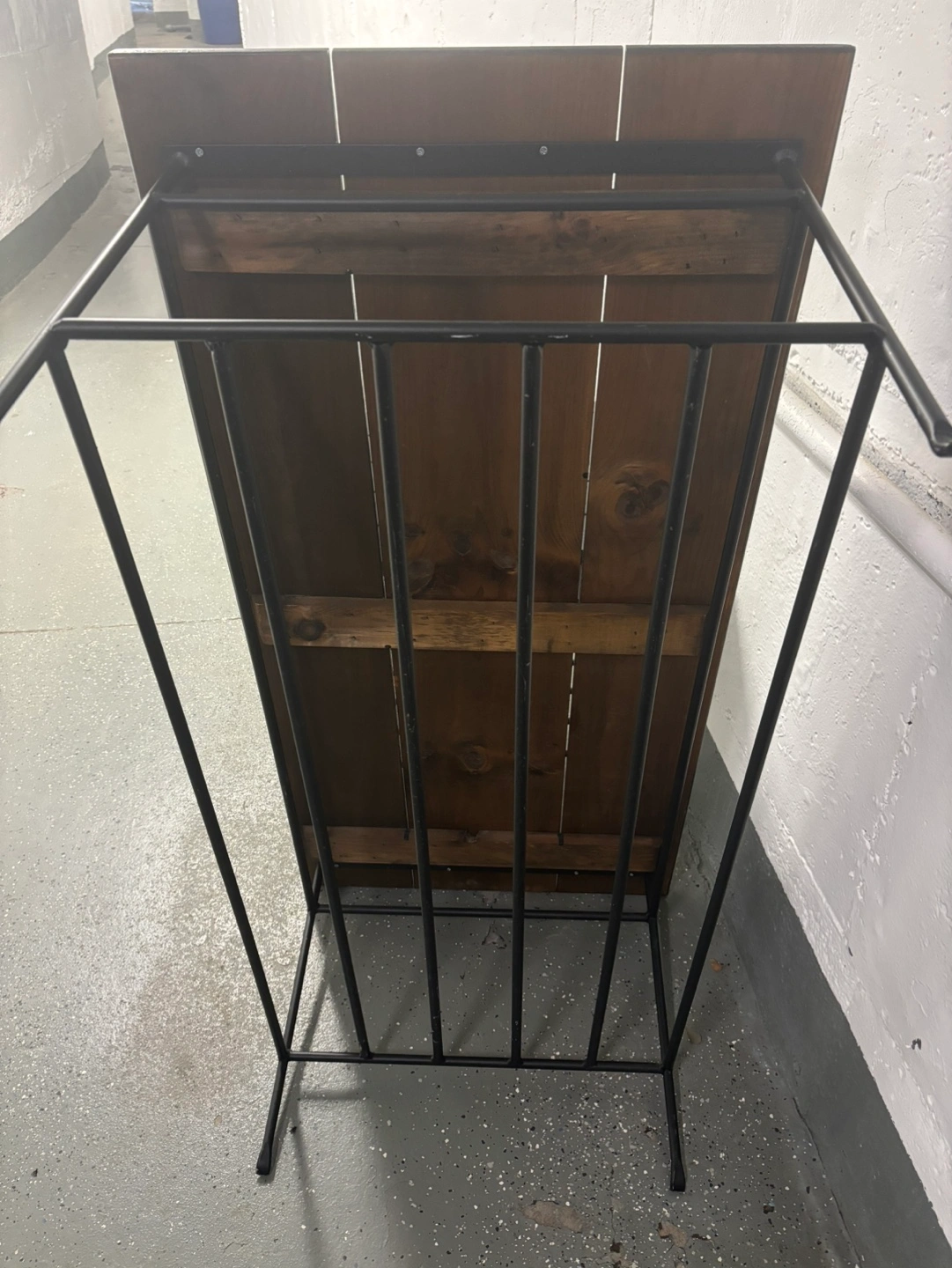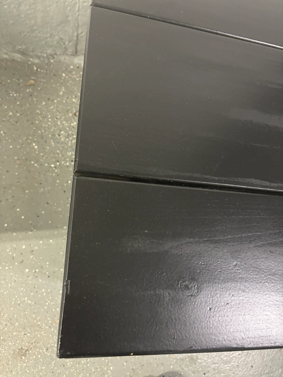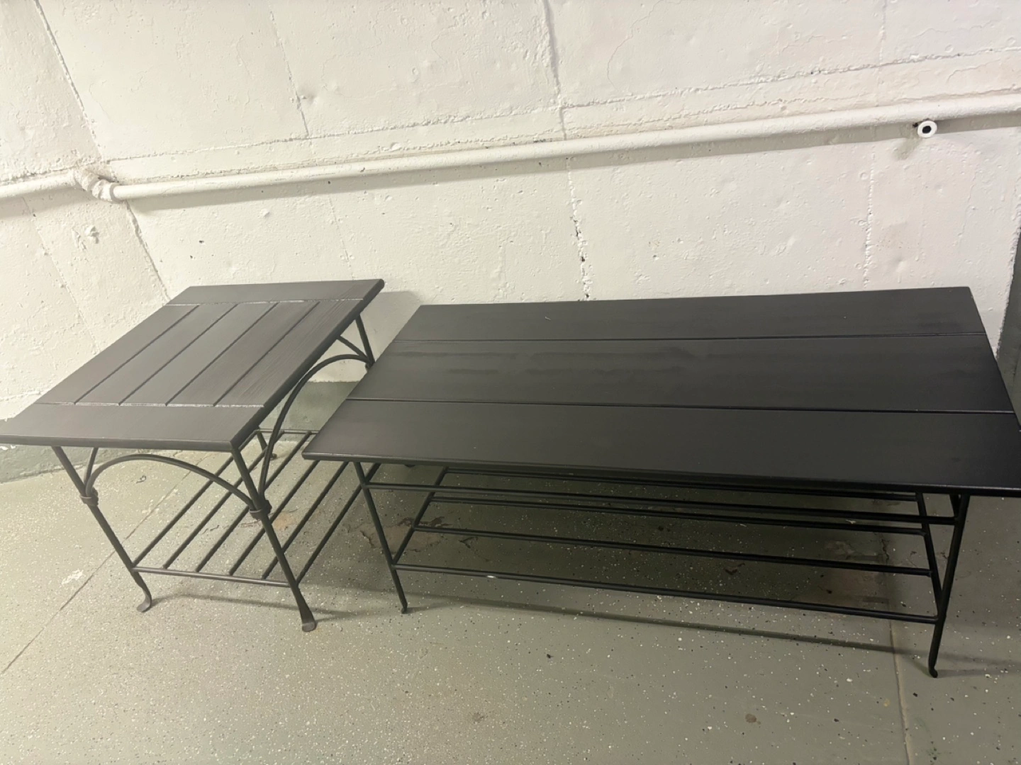 Two tables, one large and one small. Both are made of wood and metal. The table tops are black and have a wood grain finish. The bases are black metal. The large table has a shelf underneath. The tables are in good condition, but have minor scratches and wear. Both $125