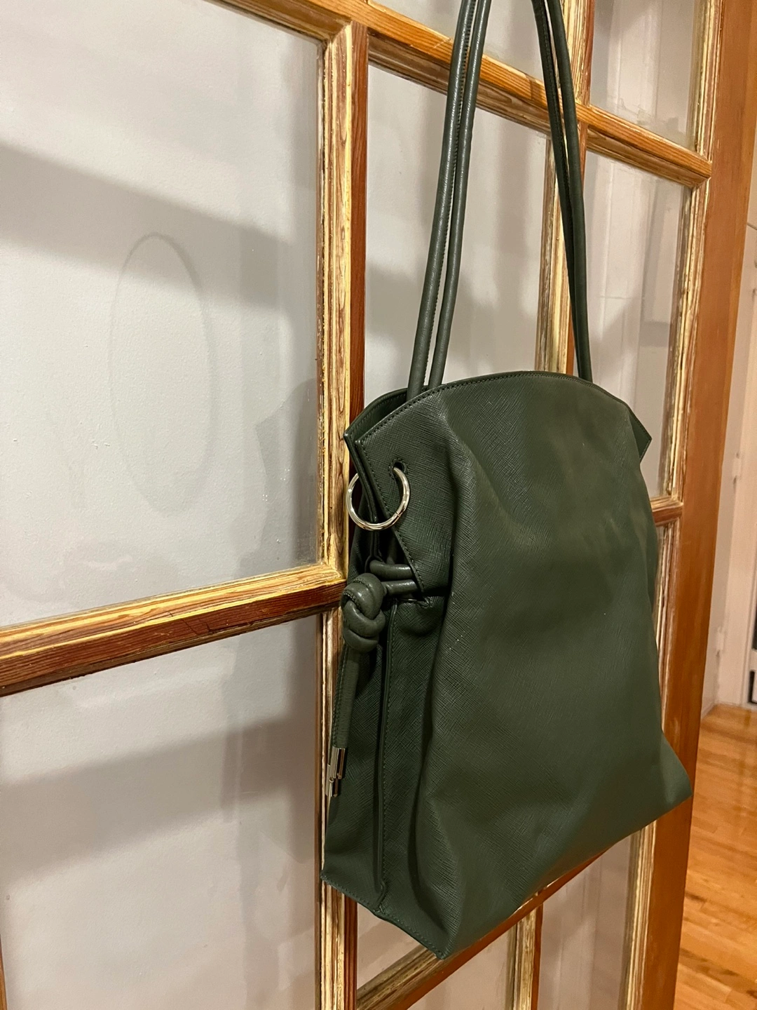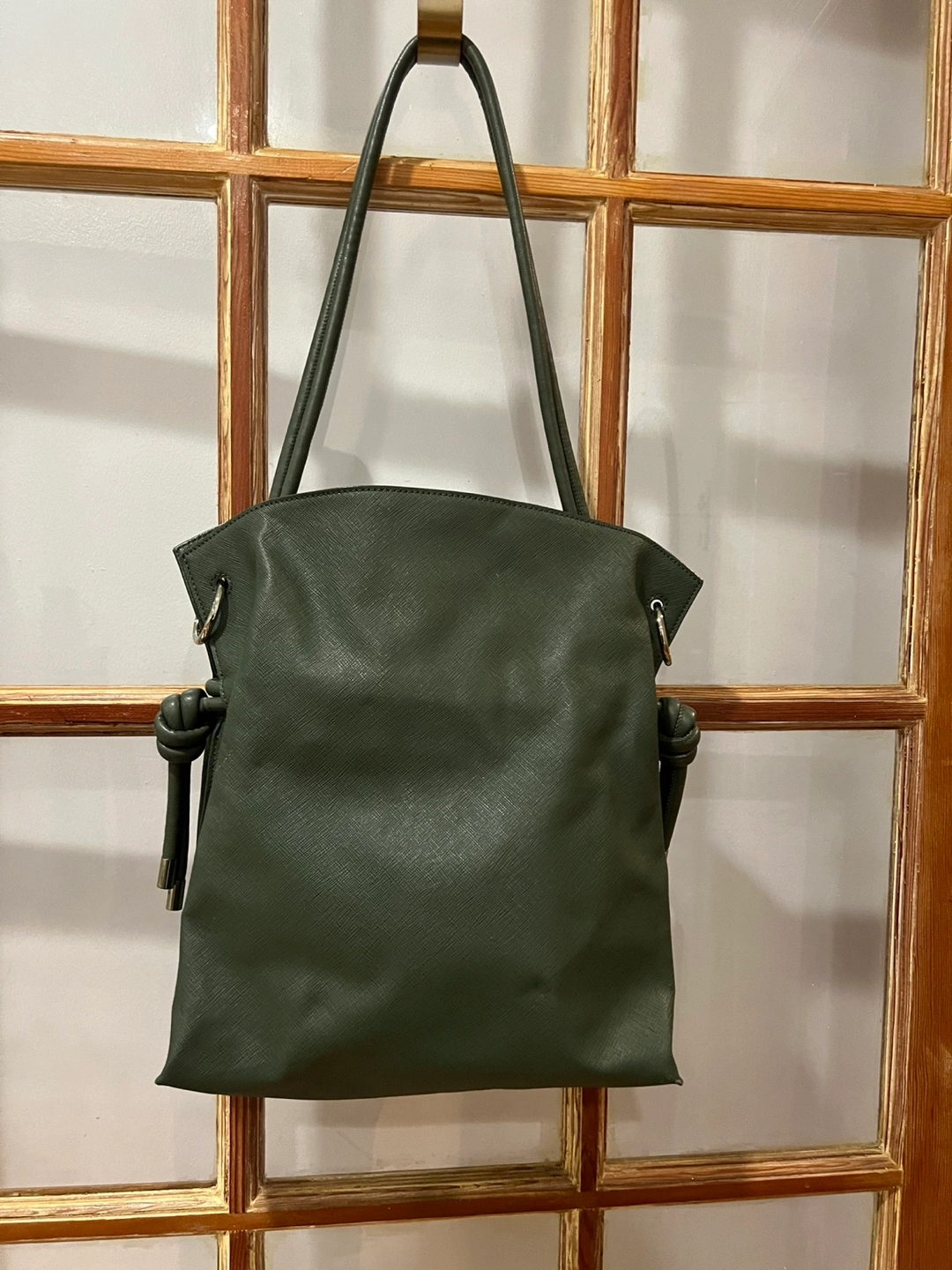Dark green tote bag with a knotted detail. Has a top closure and two top handles.