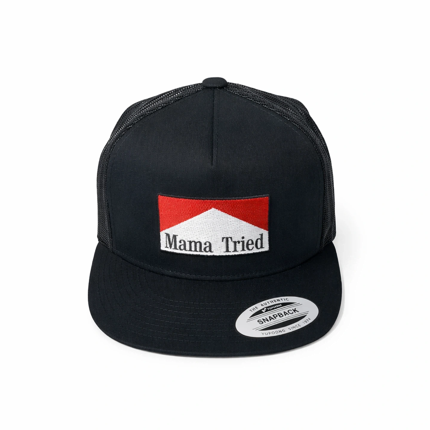 This is a black trucker hat with a "Mama Tried" patch. It features a snapback closure for an adjustable fit. Mesh back for breathability.