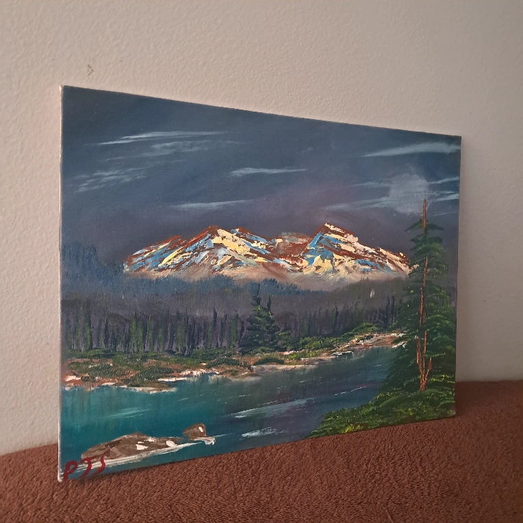 15Original oil painting on canvas. Depicts a lake and mountains with trees in the foreground. 9x12