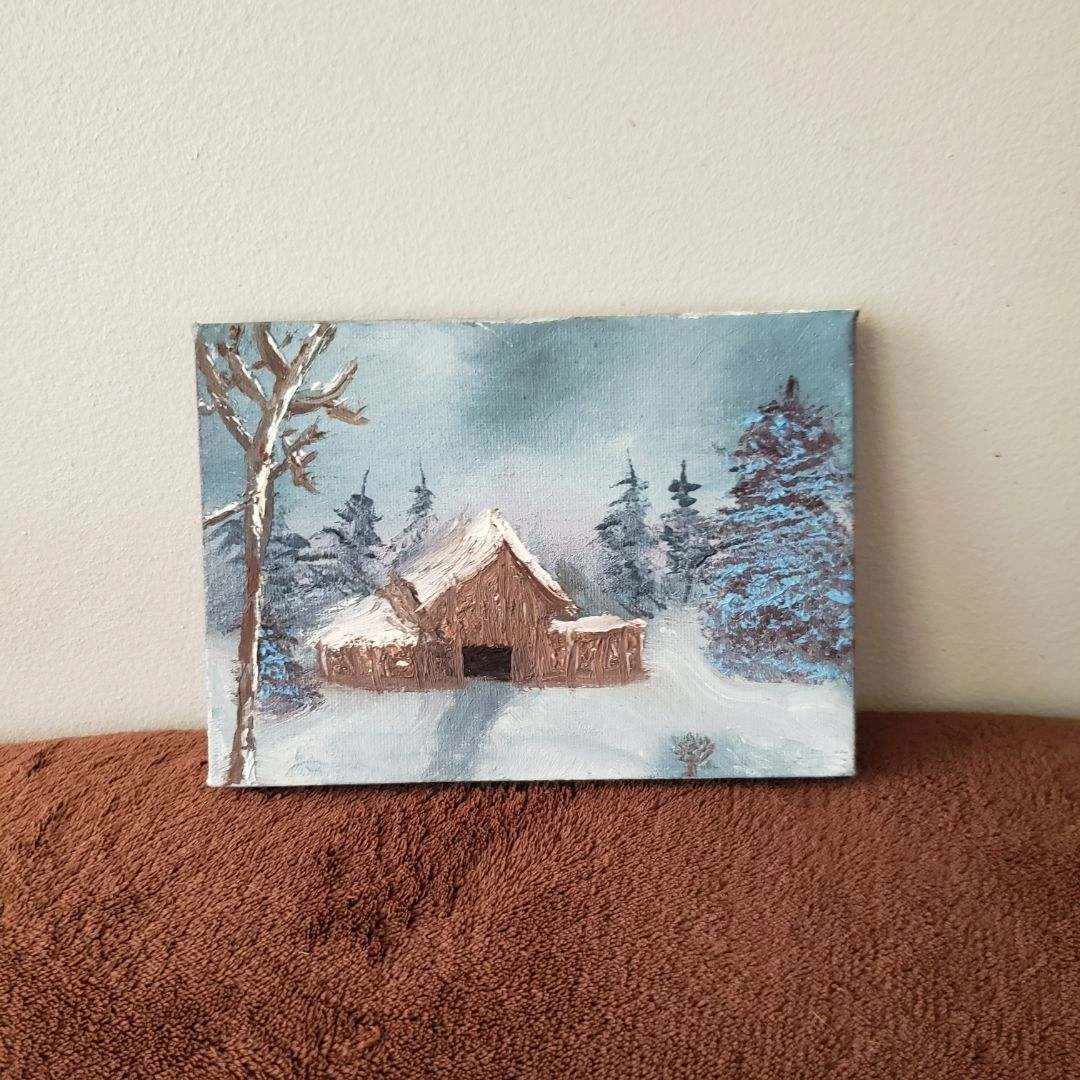 Small original oil painting on canvas. Depicts a snowy landscape with a barn and trees. Signed by the artist on the back. 5x7