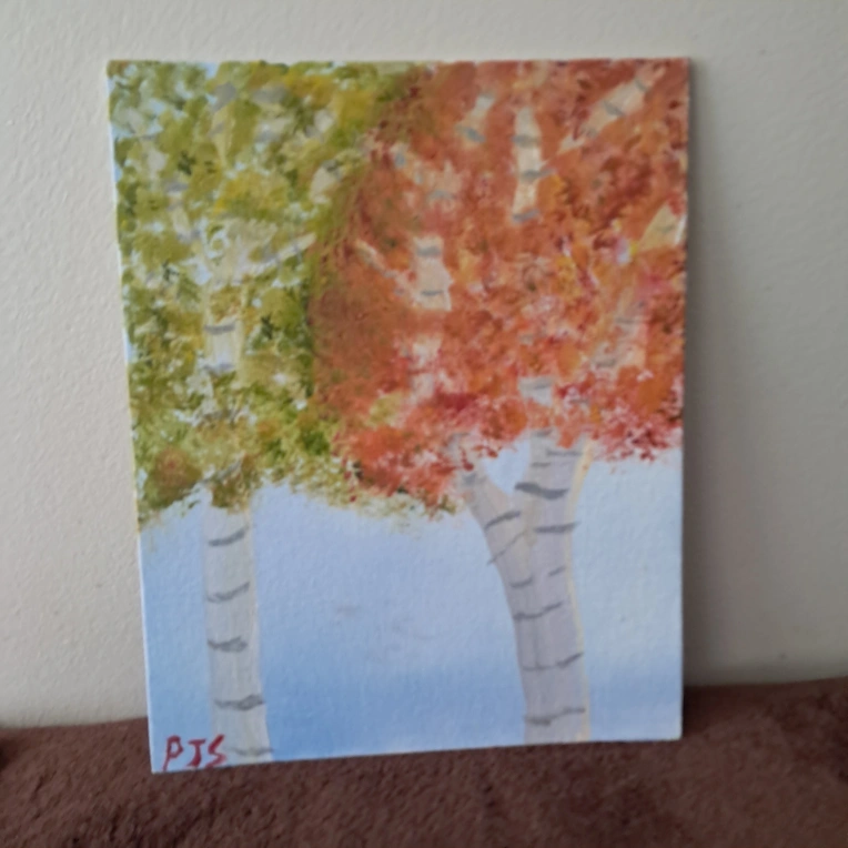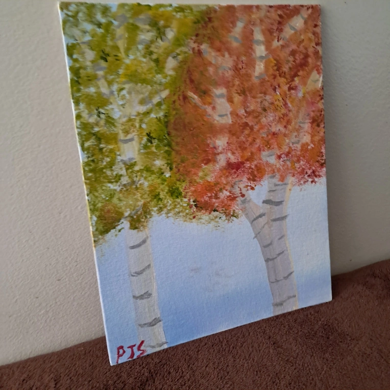 15Small painting of two birch trees, one green and one orange. Painted on canvas. Signed by the artist. 8x10