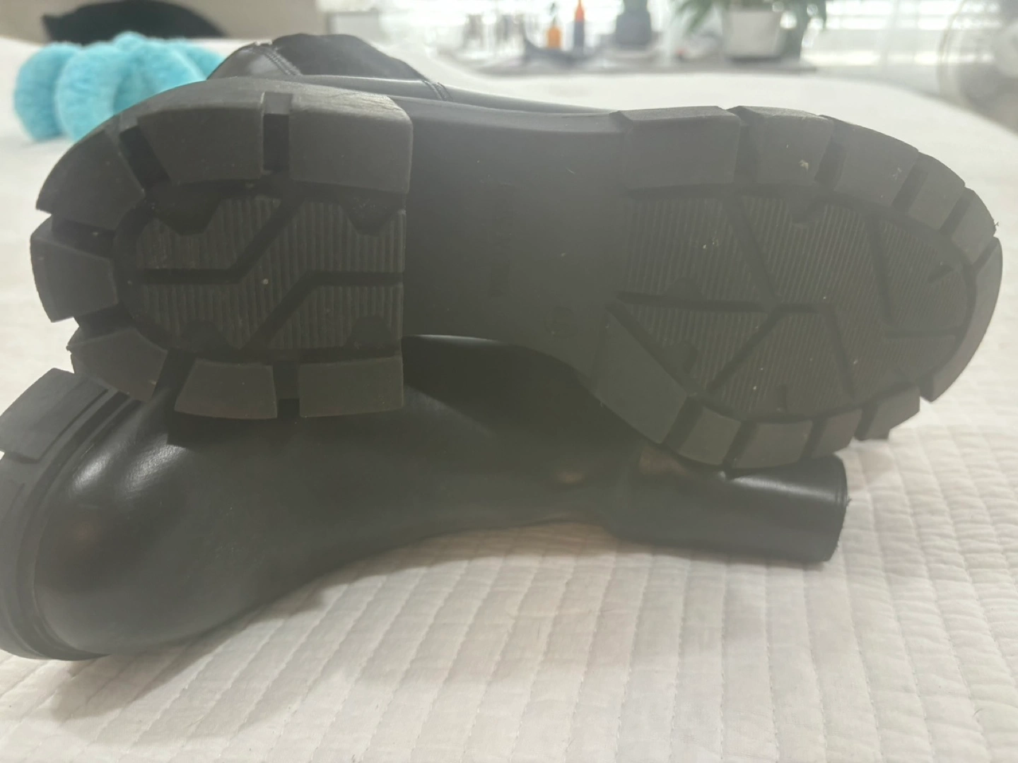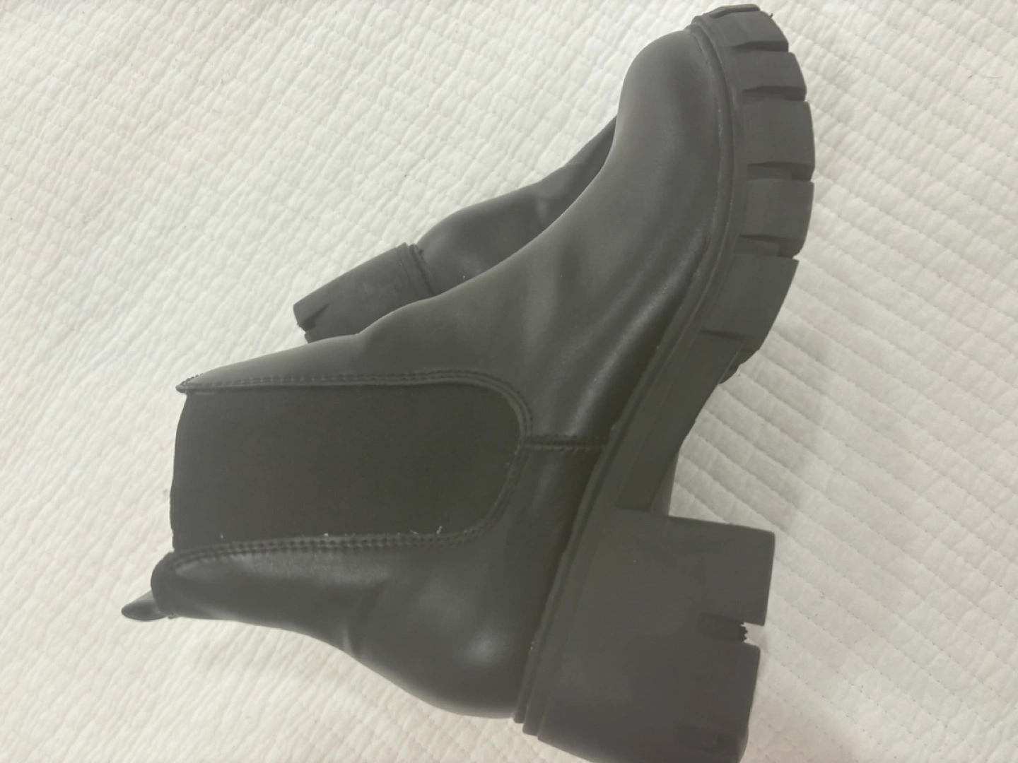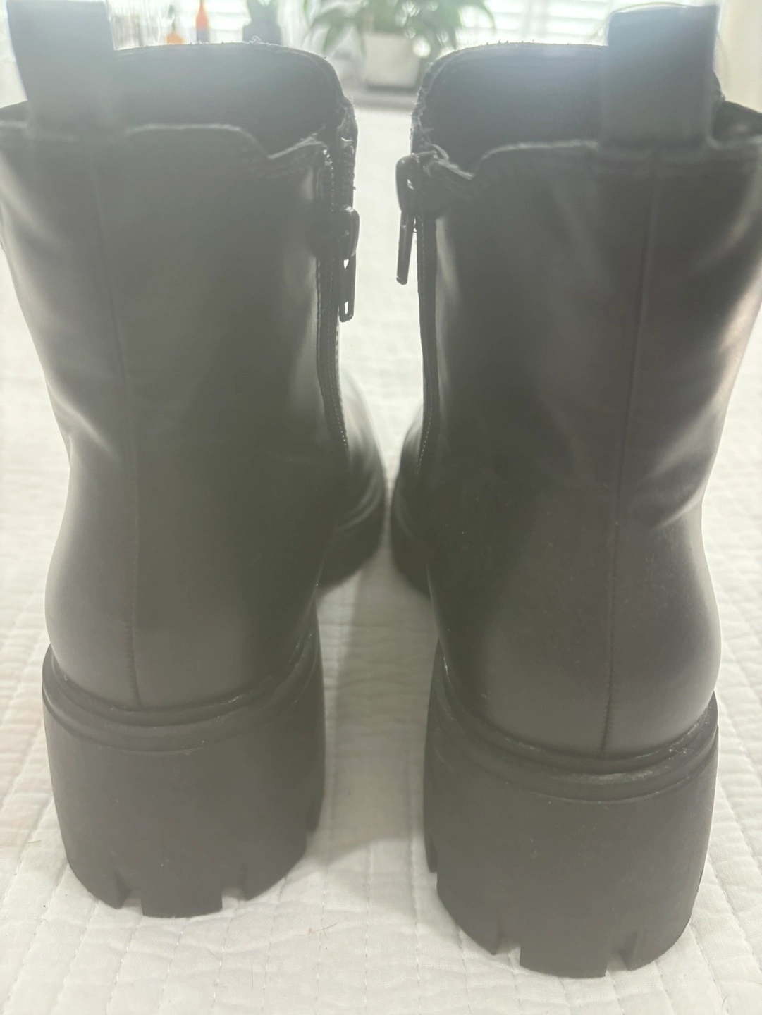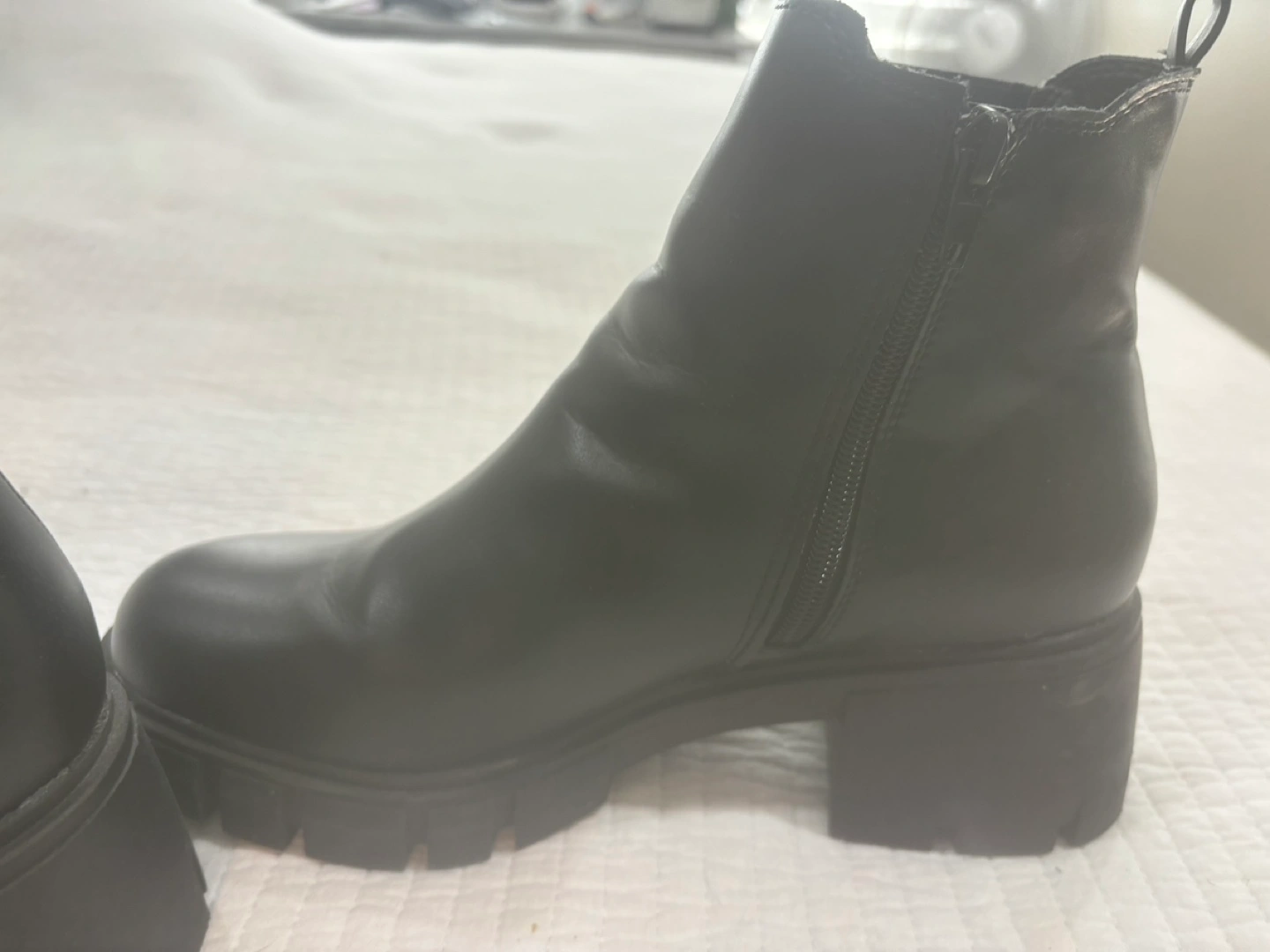 20Black ankle boots with a chunky heel. Side zipper closure.