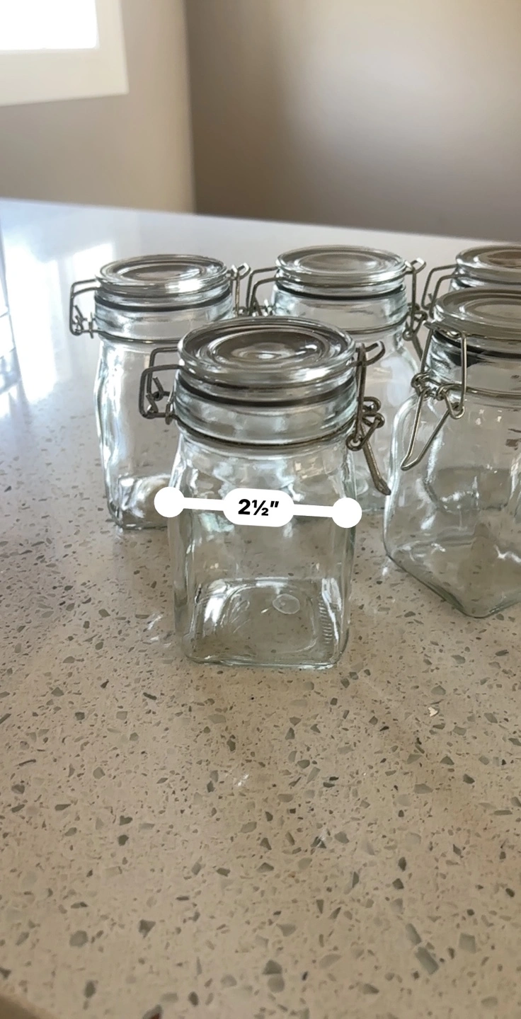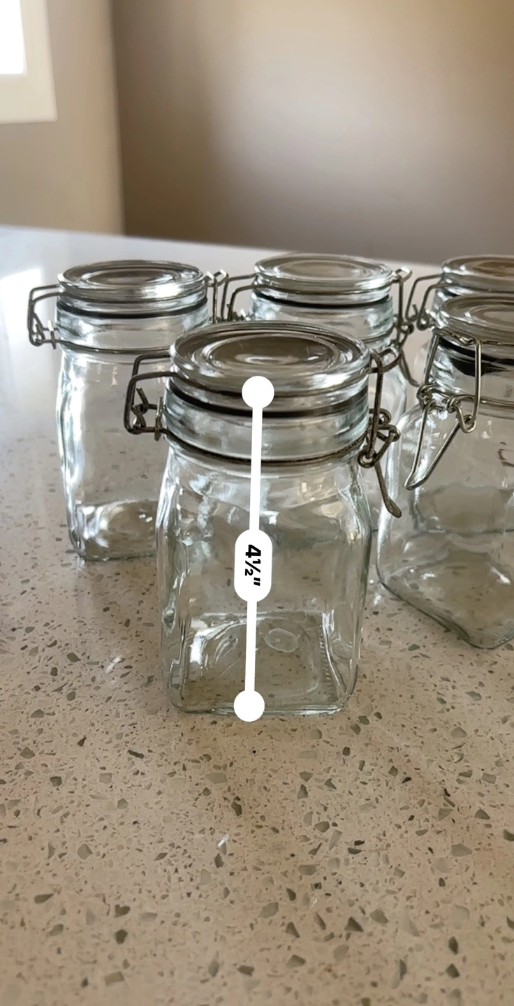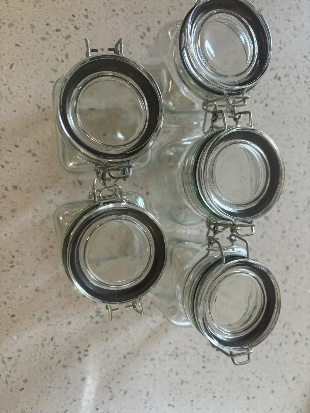 20Glass jars with metal lids and clips. They are square shaped. They are approximately 4 1/2 inches tall and 2 1/2 inches wide.