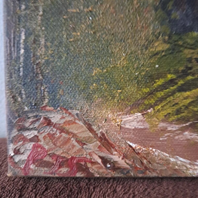 15Original oil painting on canvas, signed by artist. Depicts a landscape scene with trees and a path. 8x10