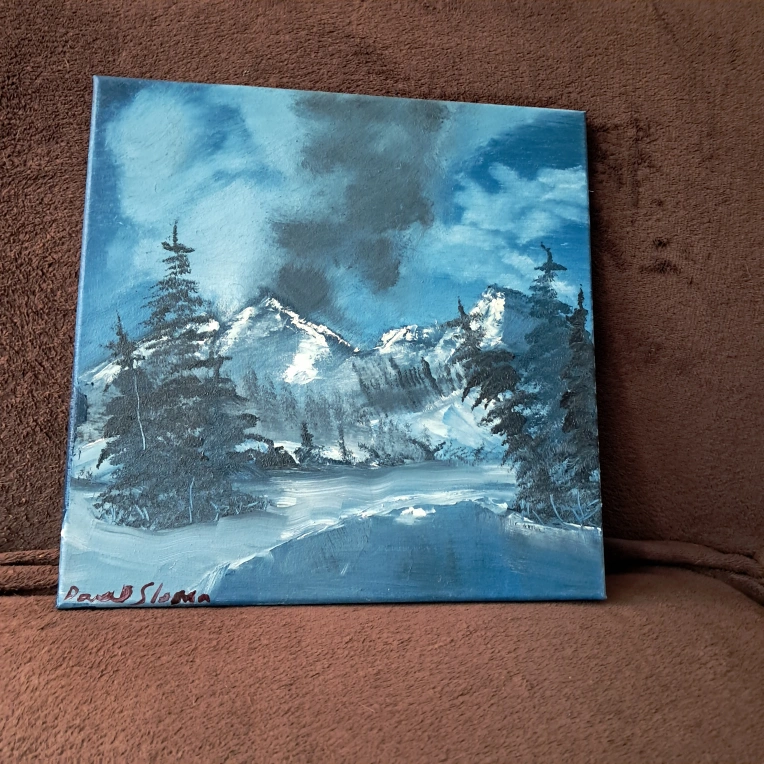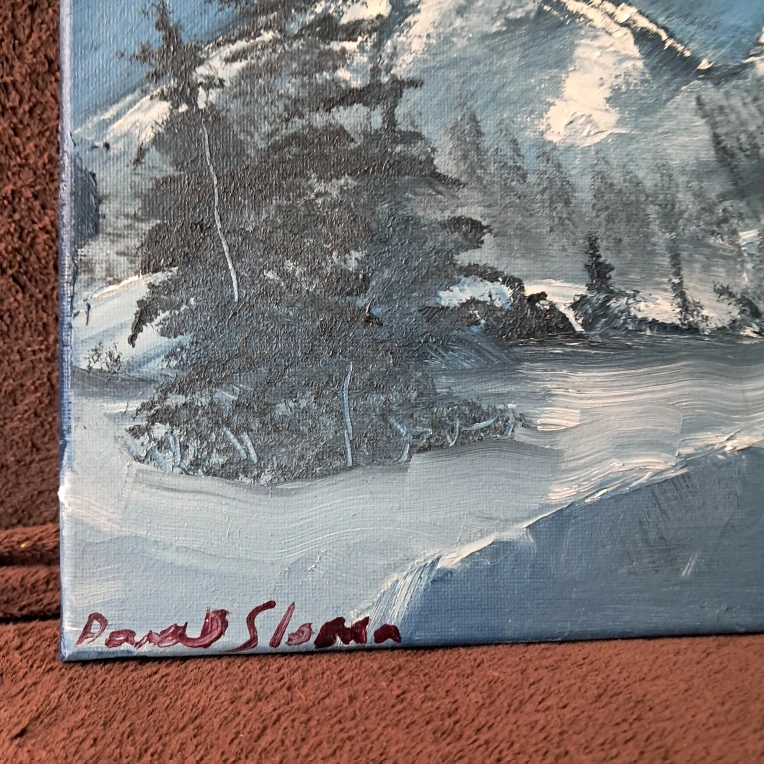 Original painting on canvas by Paul Sloma. Depicts a snowy mountain scene. Signed on the front and back. The piece is approximately 12x12 inches