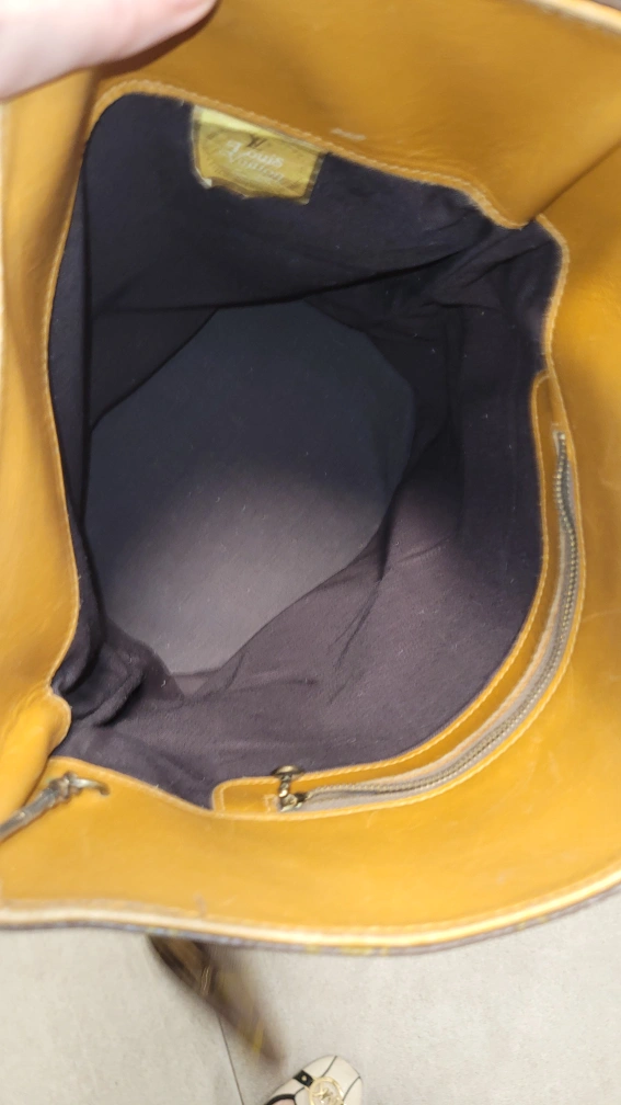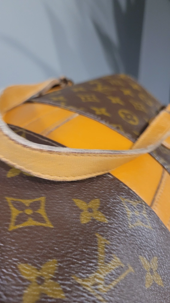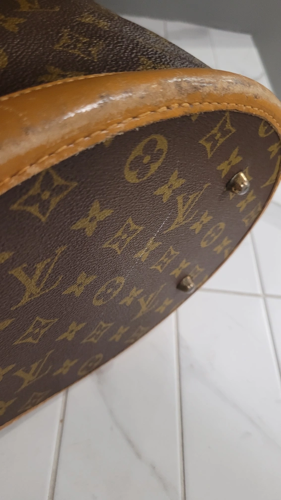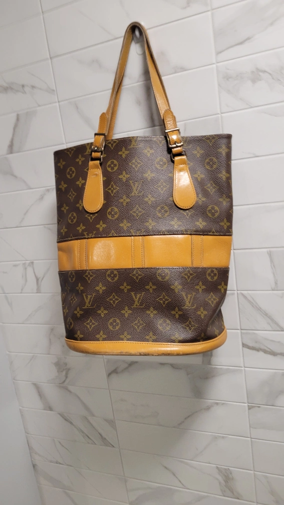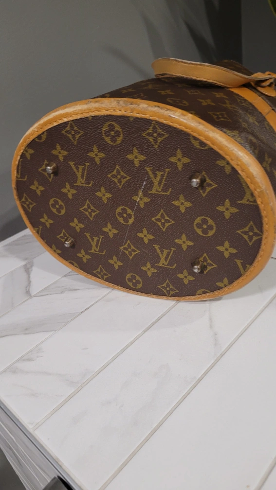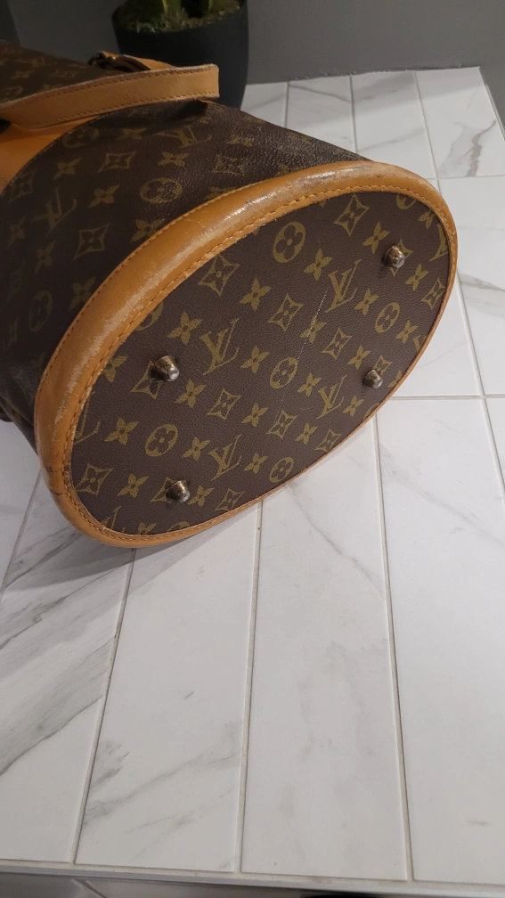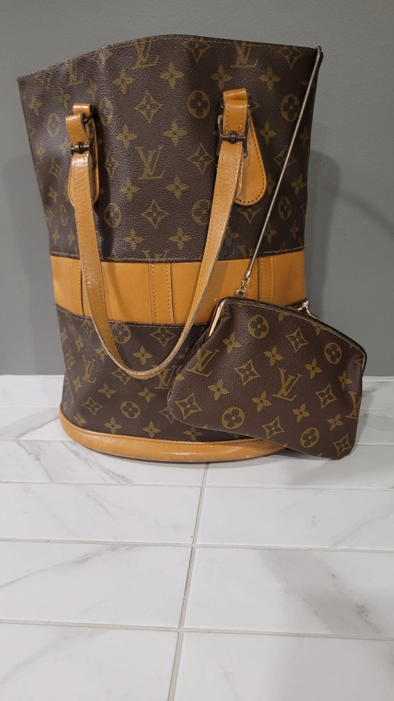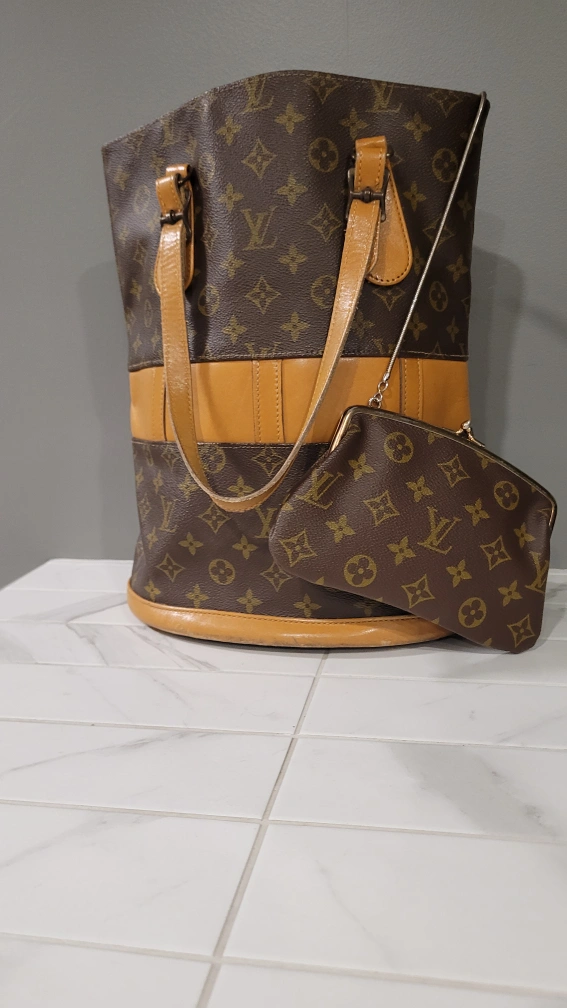 484Large vintage Louis Vuitton bucket bag with two top handles, a long shoulder strap, and a matching coin purse. Monogram canvas with leather trim. 💯 authentic. Collection piece.