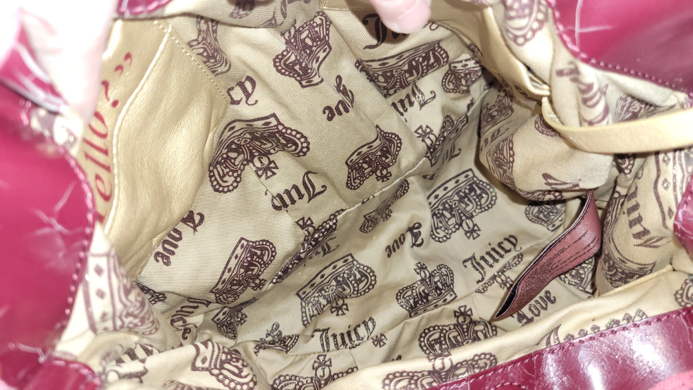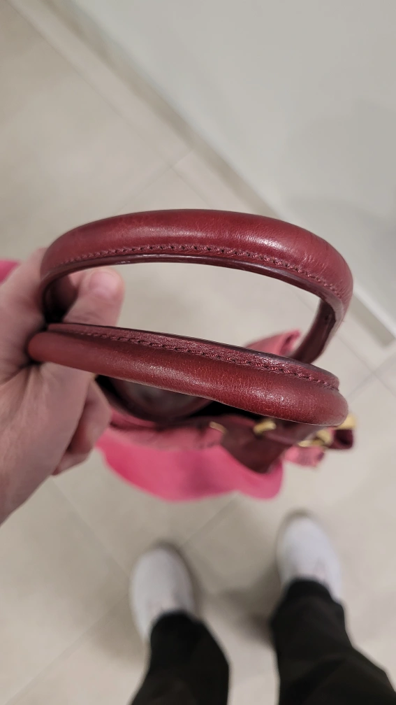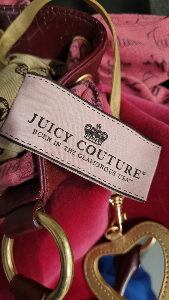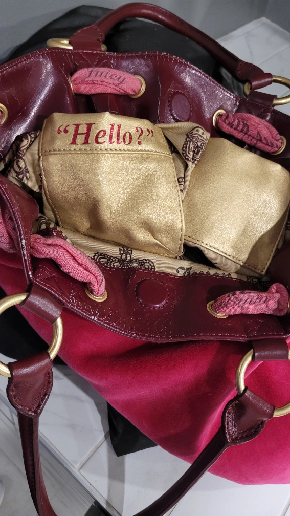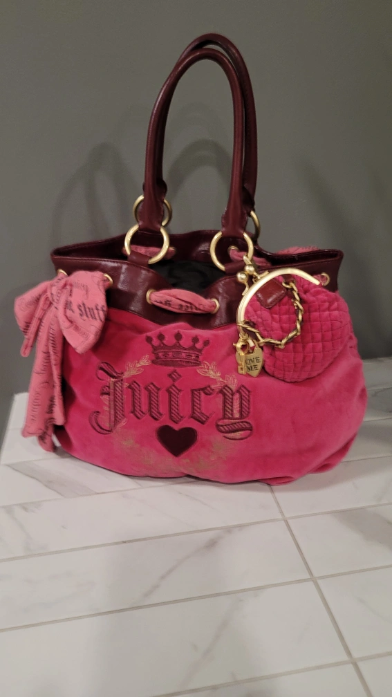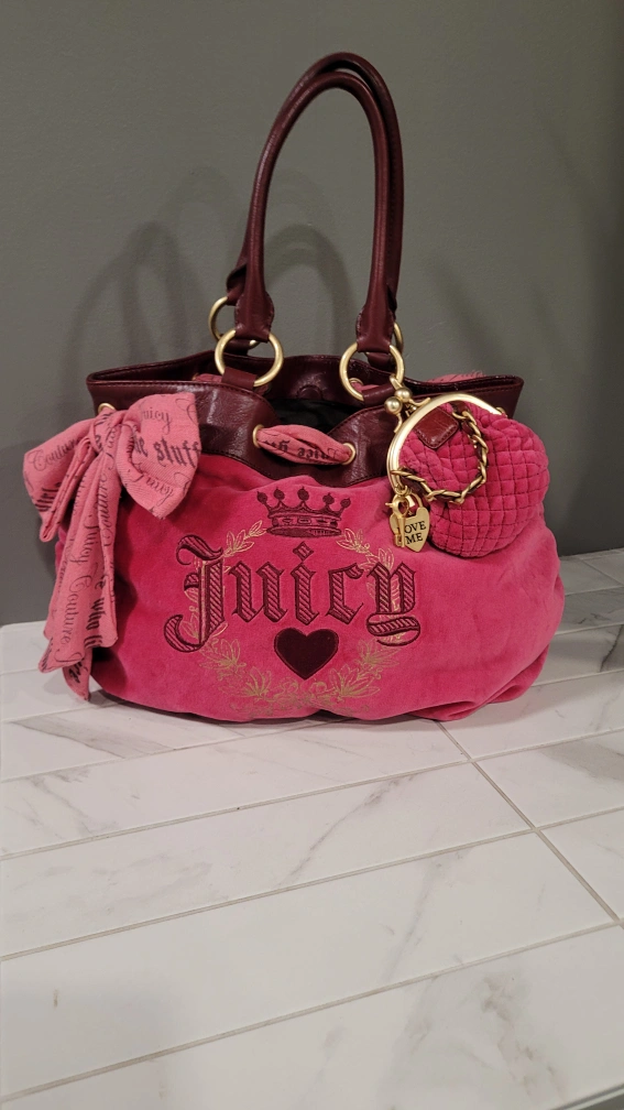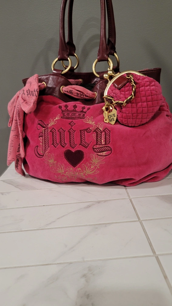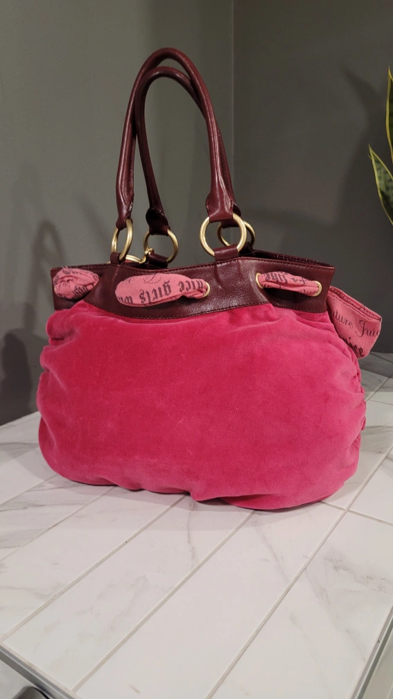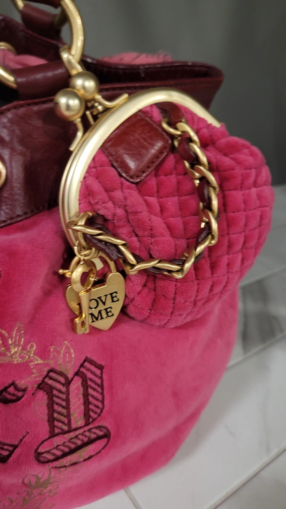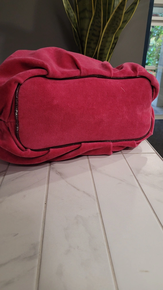 484Pink velour bag with gold hardware. Features a small coin purse on a chain attached to the bag. Has a brown leather trim on the top. 💯 authentic