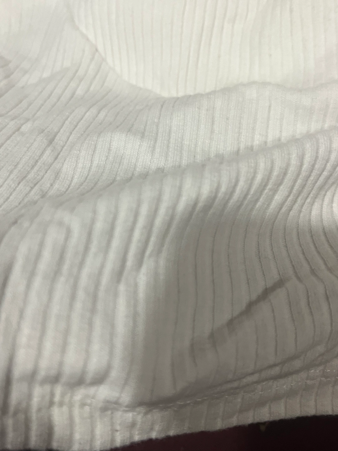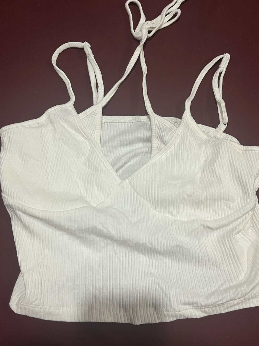 268White ribbed crop top with a tie detail at the neckline. Spaghetti straps.