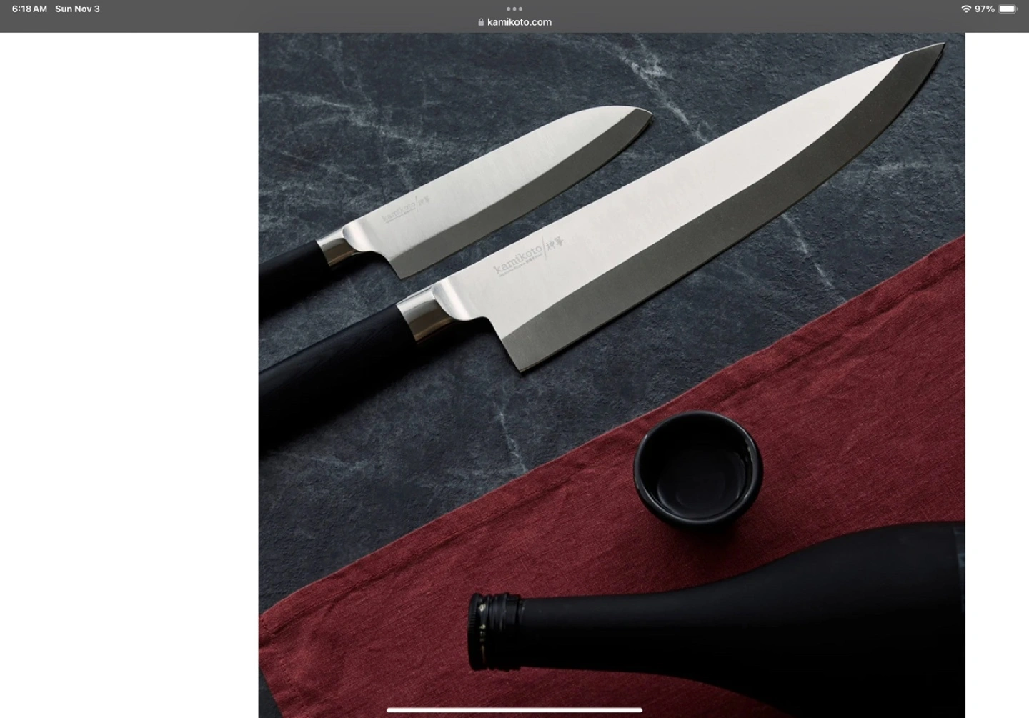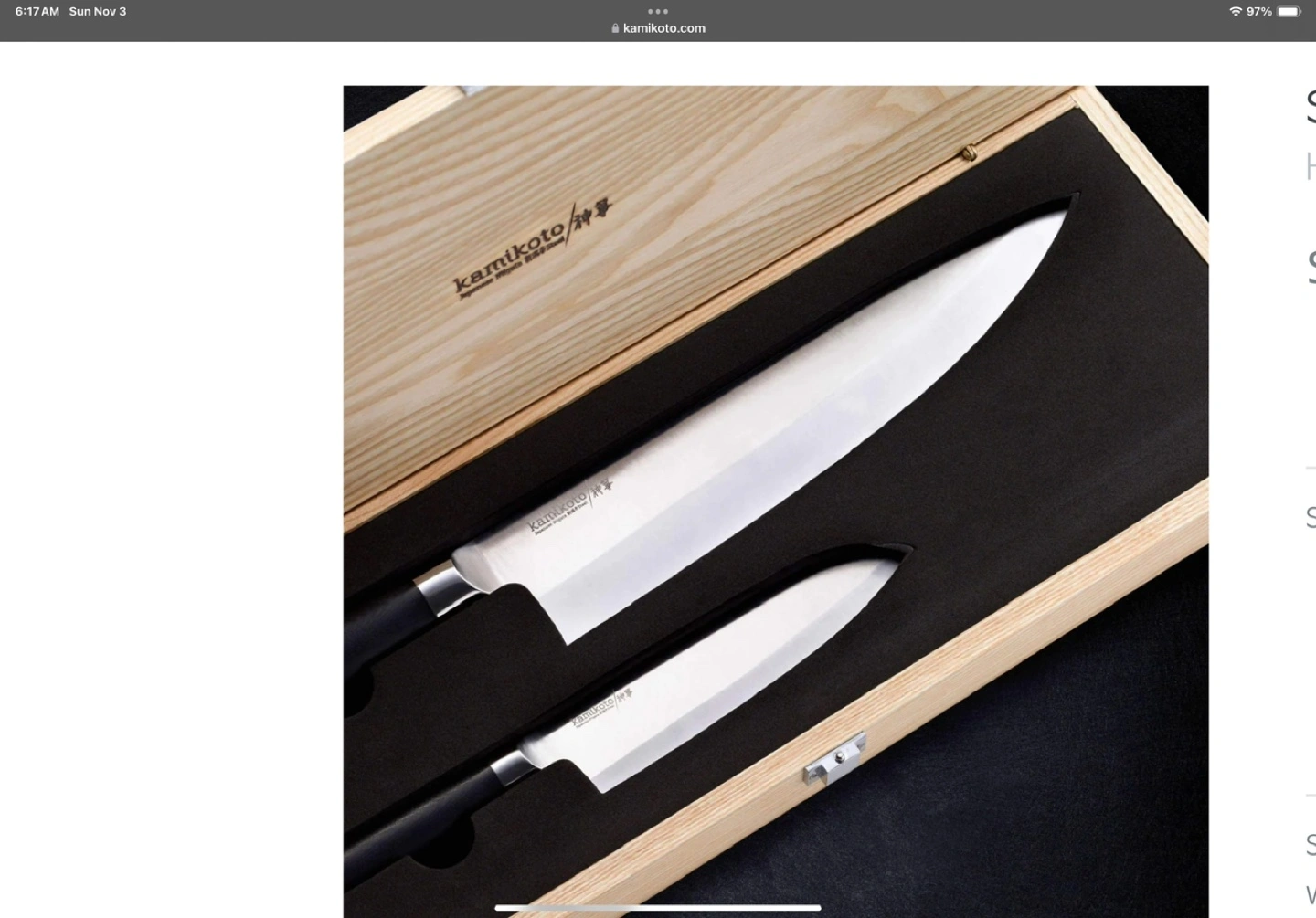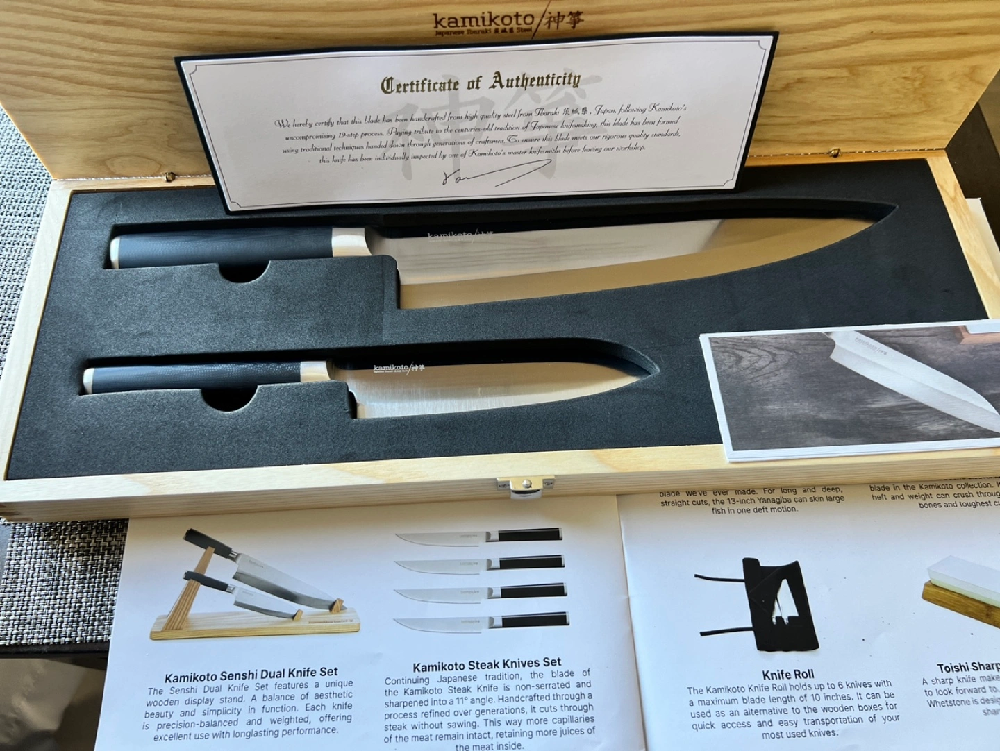 76Two knives in a wooden box with a stand. Black handles, silver blades.