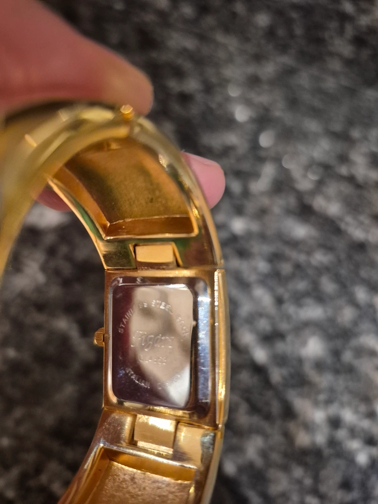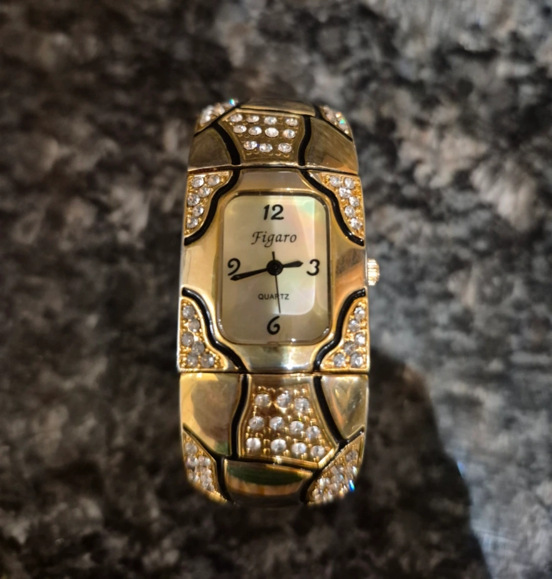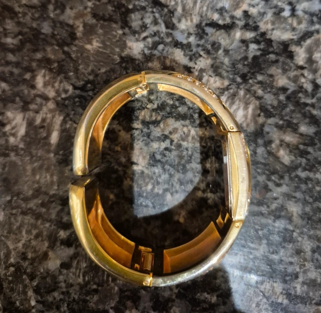 Gold-tone bangle watch. Quartz movement. Crystal accents. Freshly was put in.