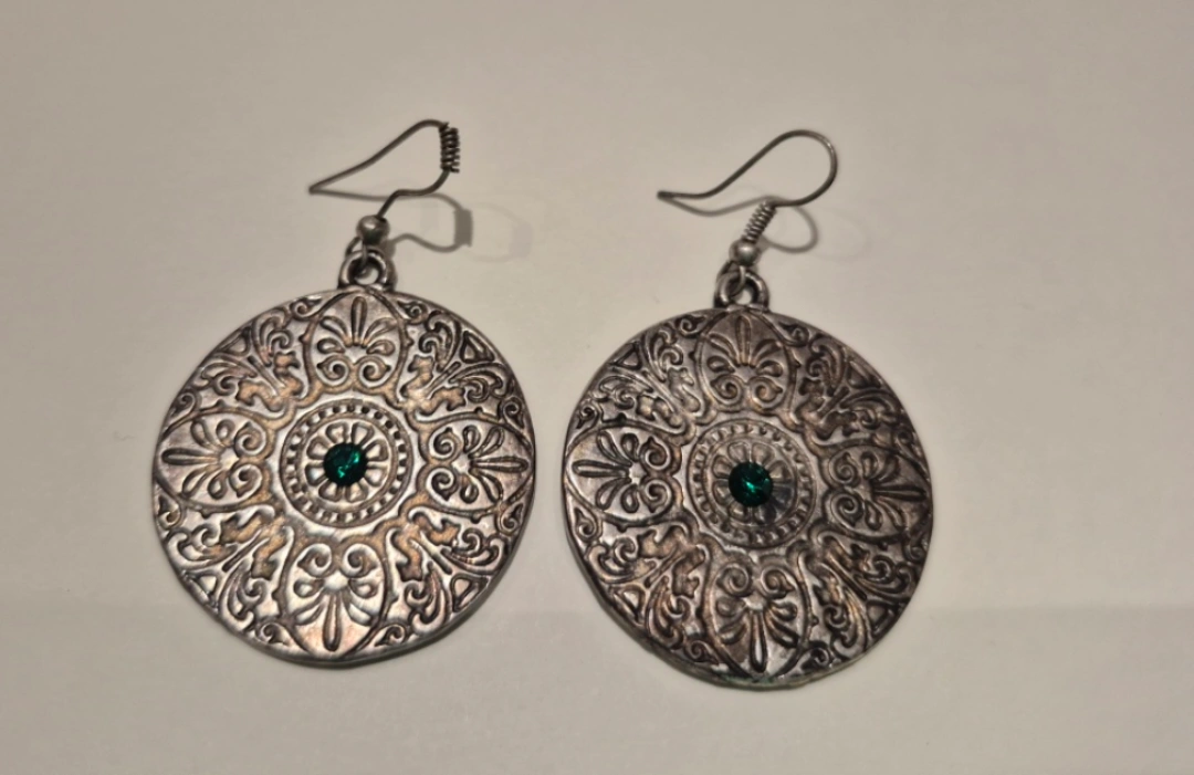 Large earrings with intricate filigree design. They have a green stone set in the center.