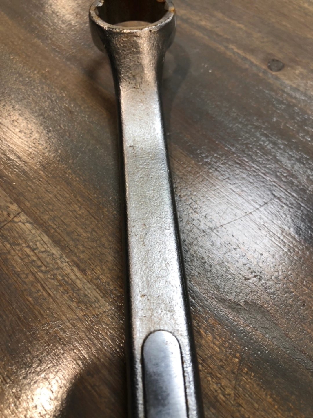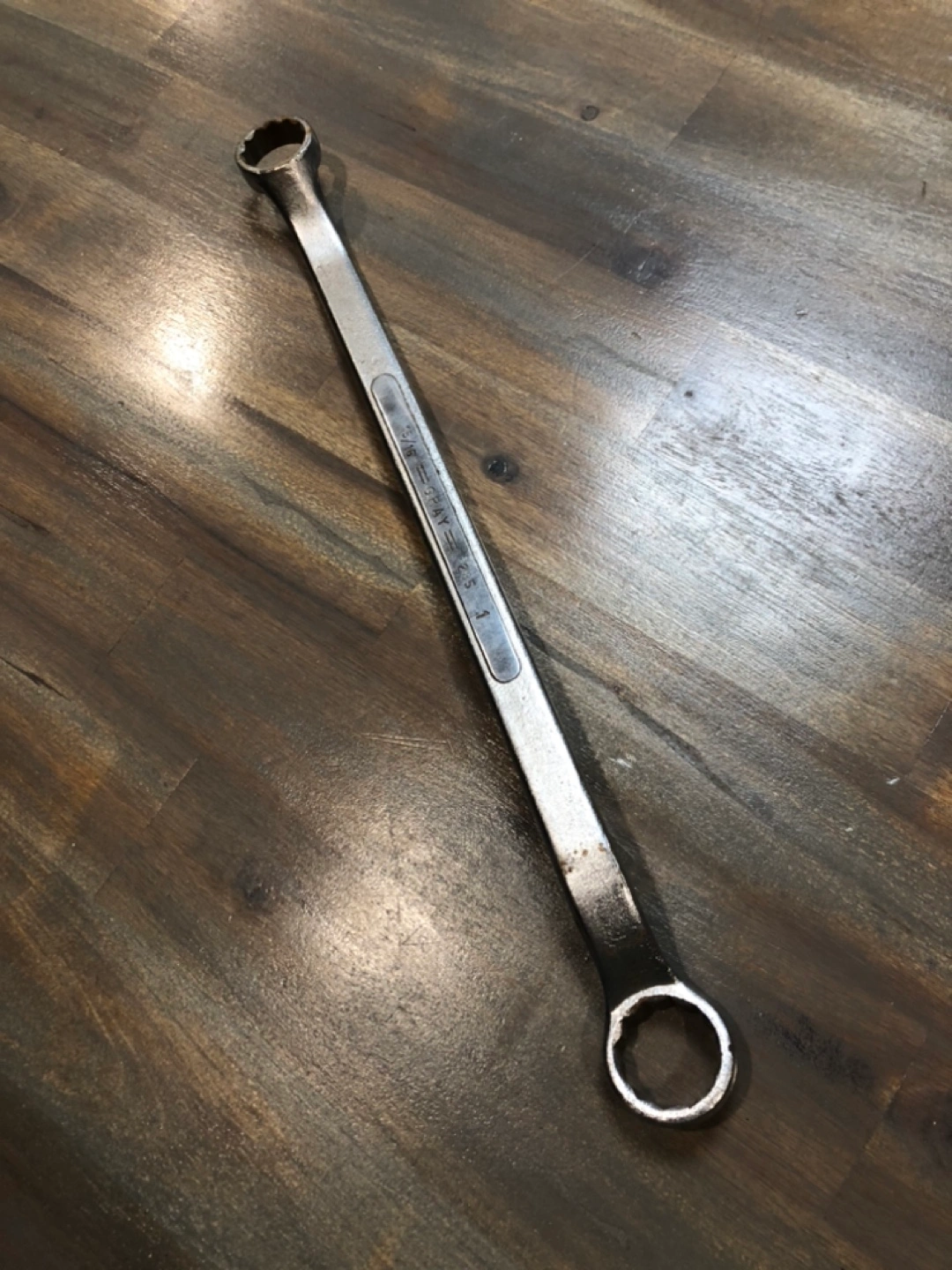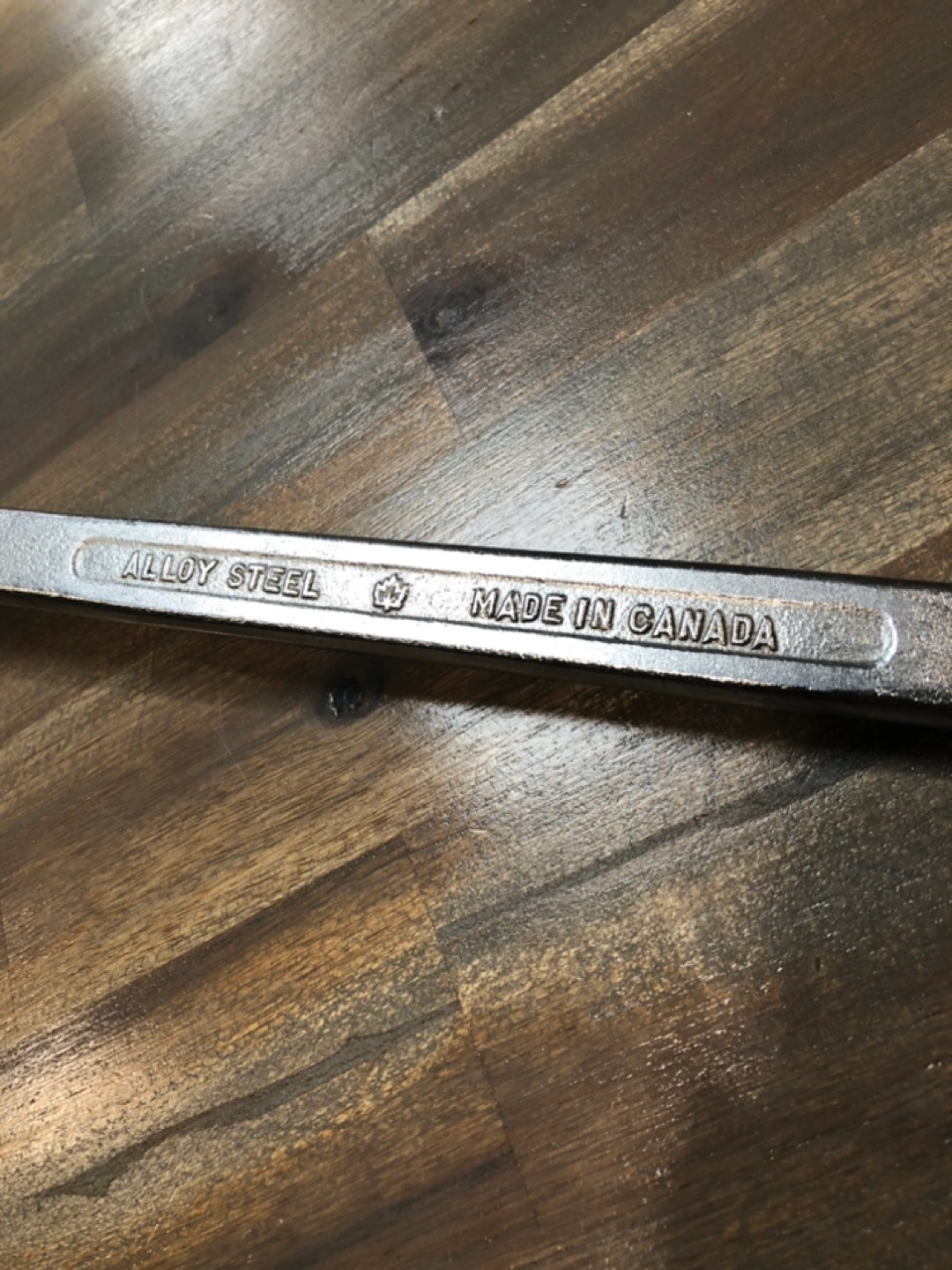Made in Canada, alloy steel wrench. 15/16 inch. In very good shape, still. A little bit of rust but looks worse in picture then actually is. Still will work like new.