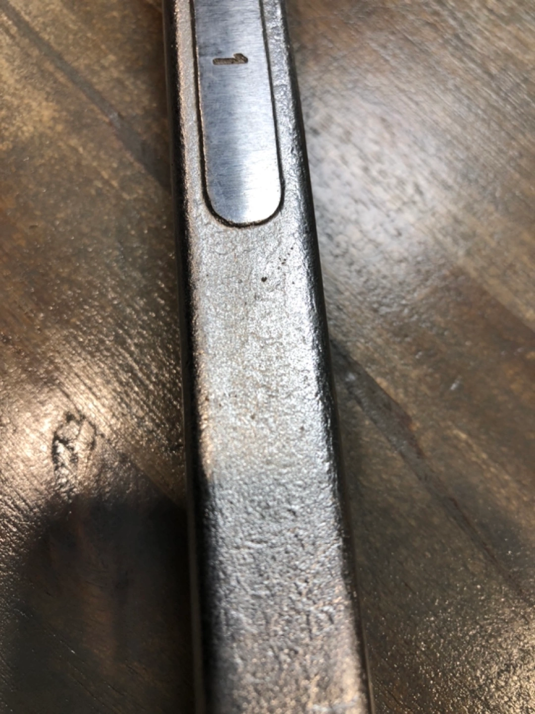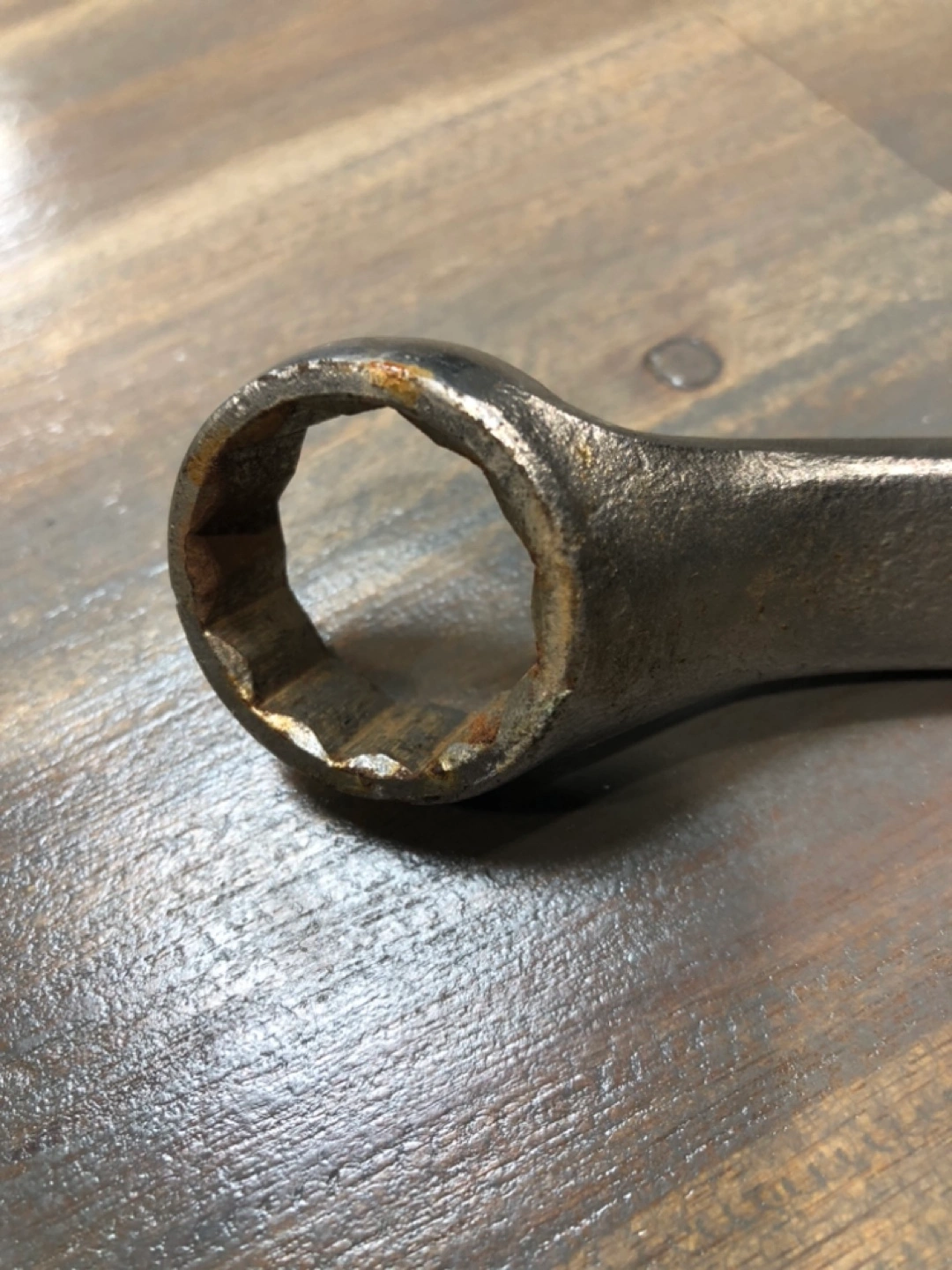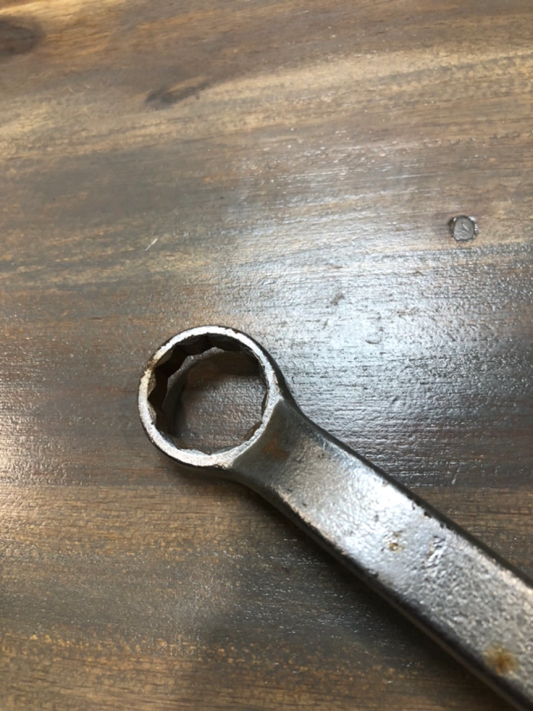 Made in Canada, alloy steel wrench. 15/16 inch. In very good shape, still. A little bit of rust but looks worse in picture then actually is. Still will work like new.
