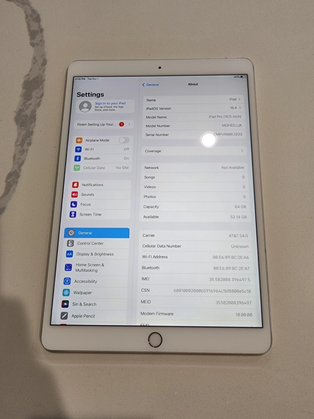 23iPad Pro 10.5-inch with 64 GB of storage. Silver color. fully functional and unlocked for any carrier excellent condition