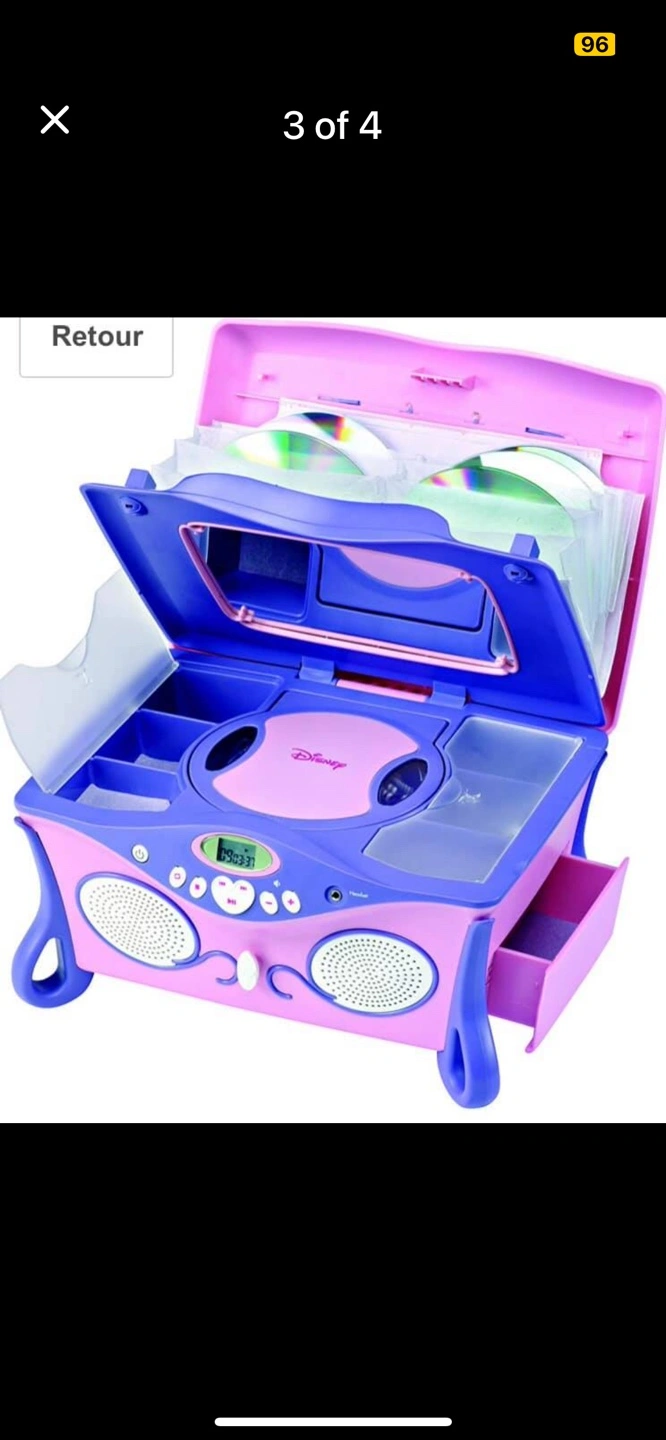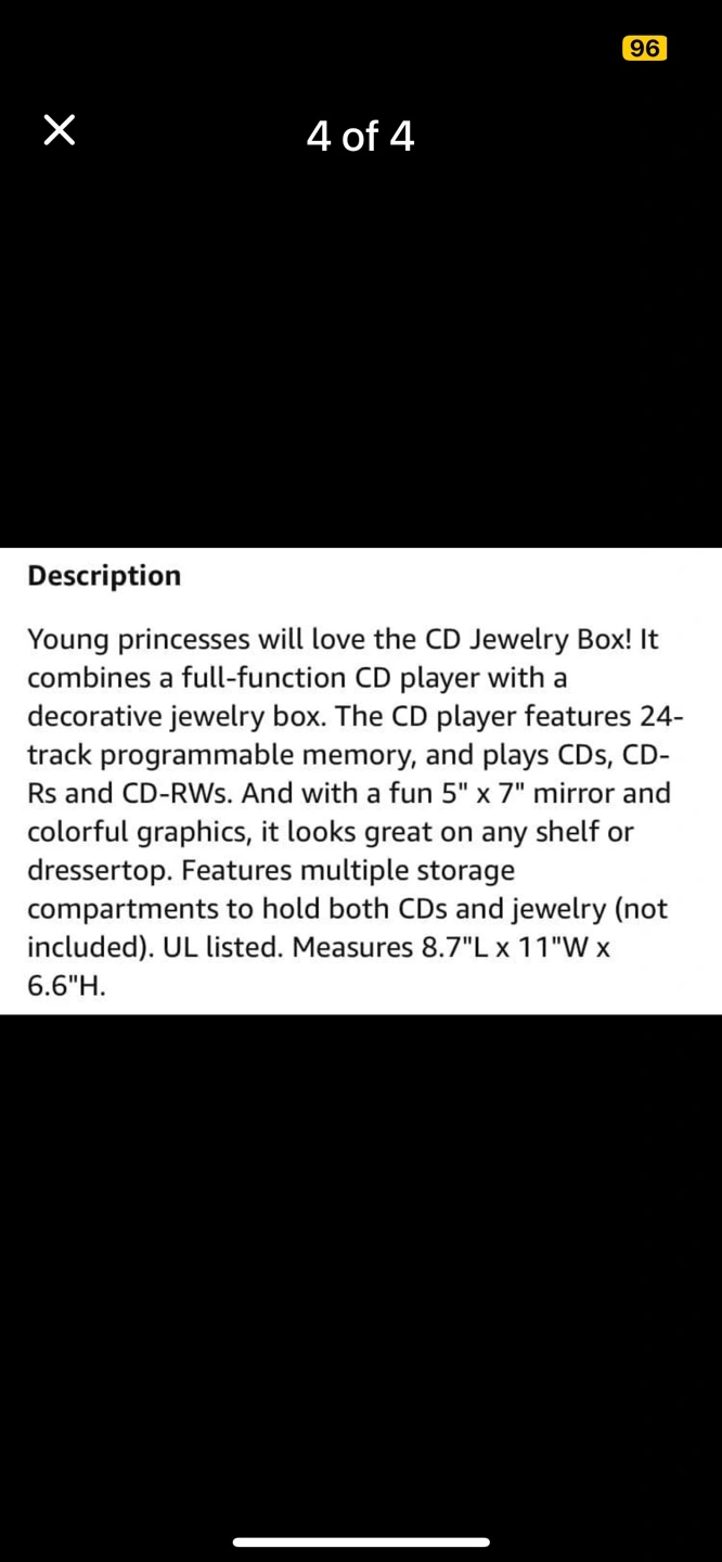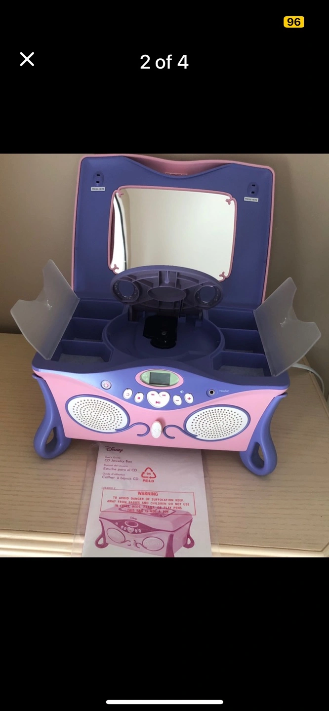 13Full-function CD player with a decorative jewellery box. Features 24-track programmable memory, and plays CDs, CD-Rs and CD-RWs. And with a fun 5" x 7" mirror and colorful graphics, it looks great on any shelf or dressertop. Features multiple storage compartments to hold both CDs and jewellery (not included). UL listed. Measures 8.7"L x 11"W x 6.6"H.