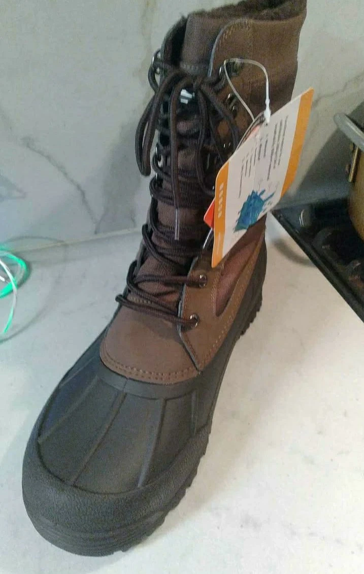 12Brown insulated winter boots with a black rubber bottom, lace-up style. New in box.