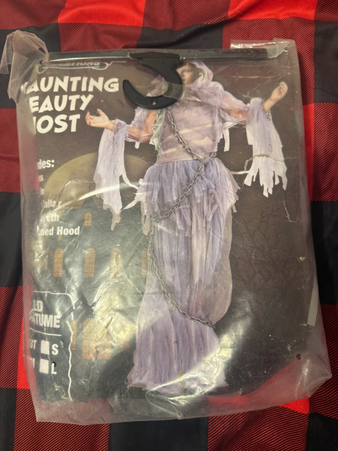 This costume features a flowing gown with tattered sleeves and a detached hood. It also includes chains for an eerie effect. Available in size Medium. Perfect for Halloween parties!